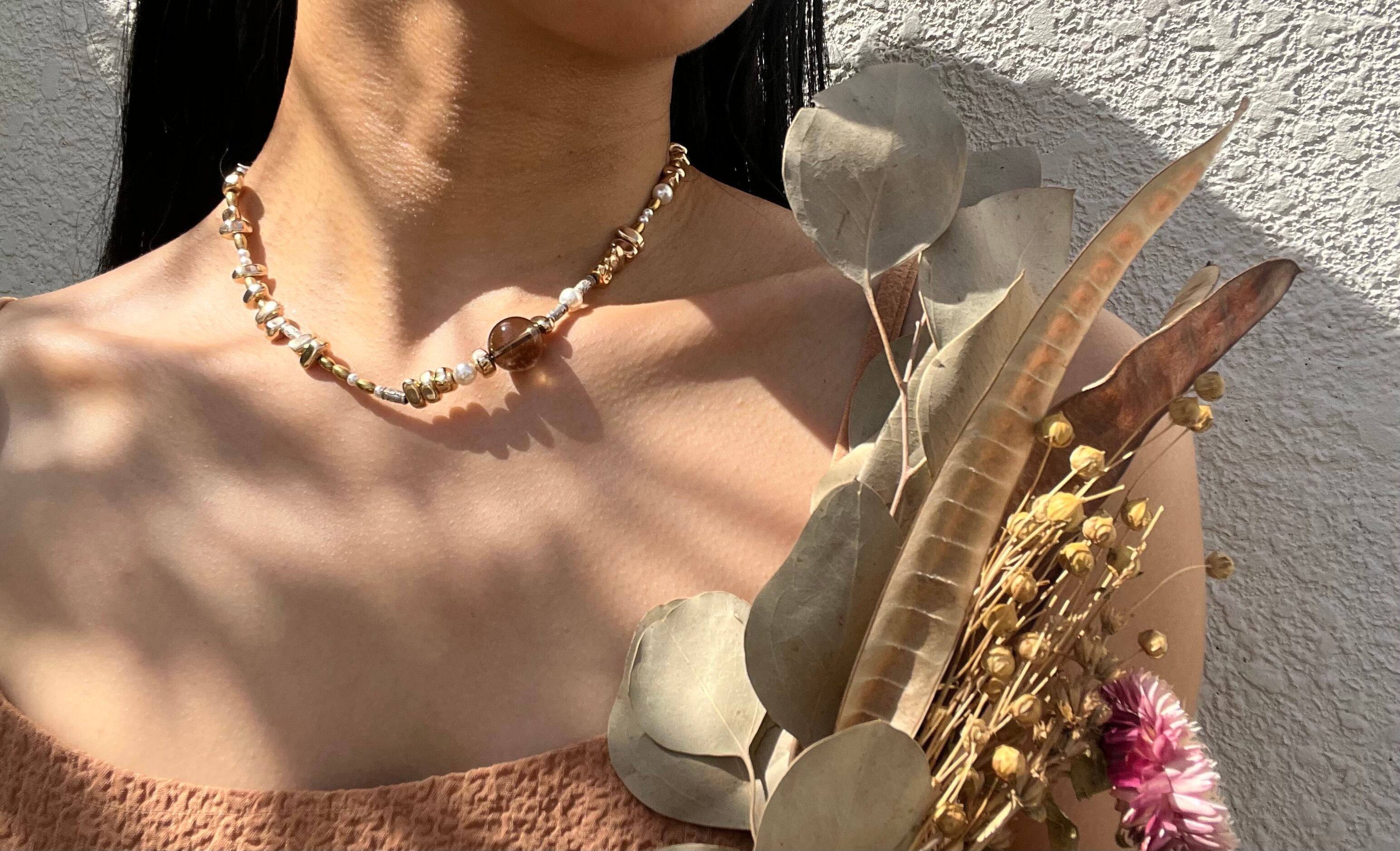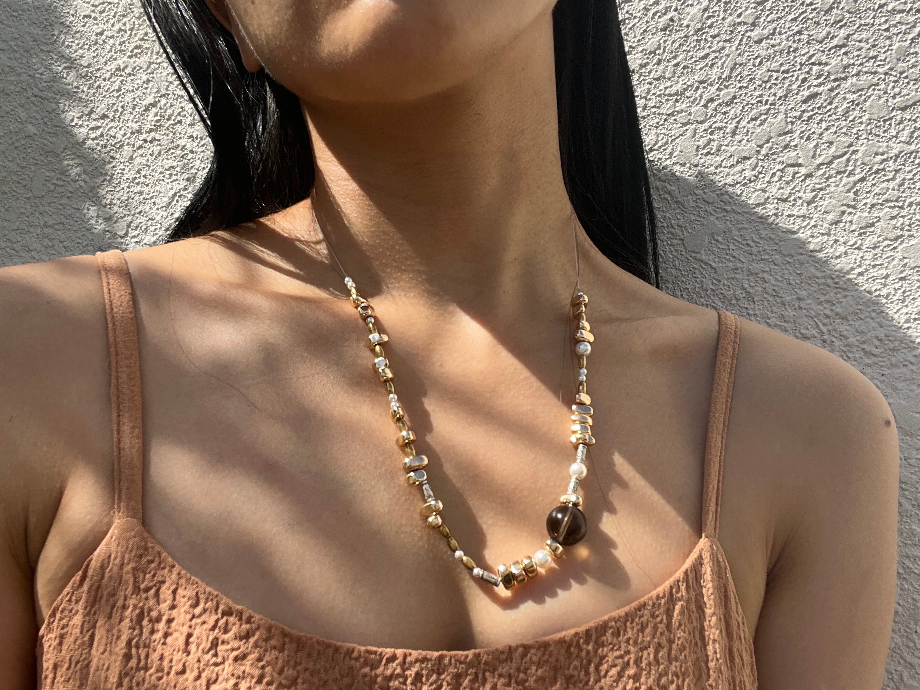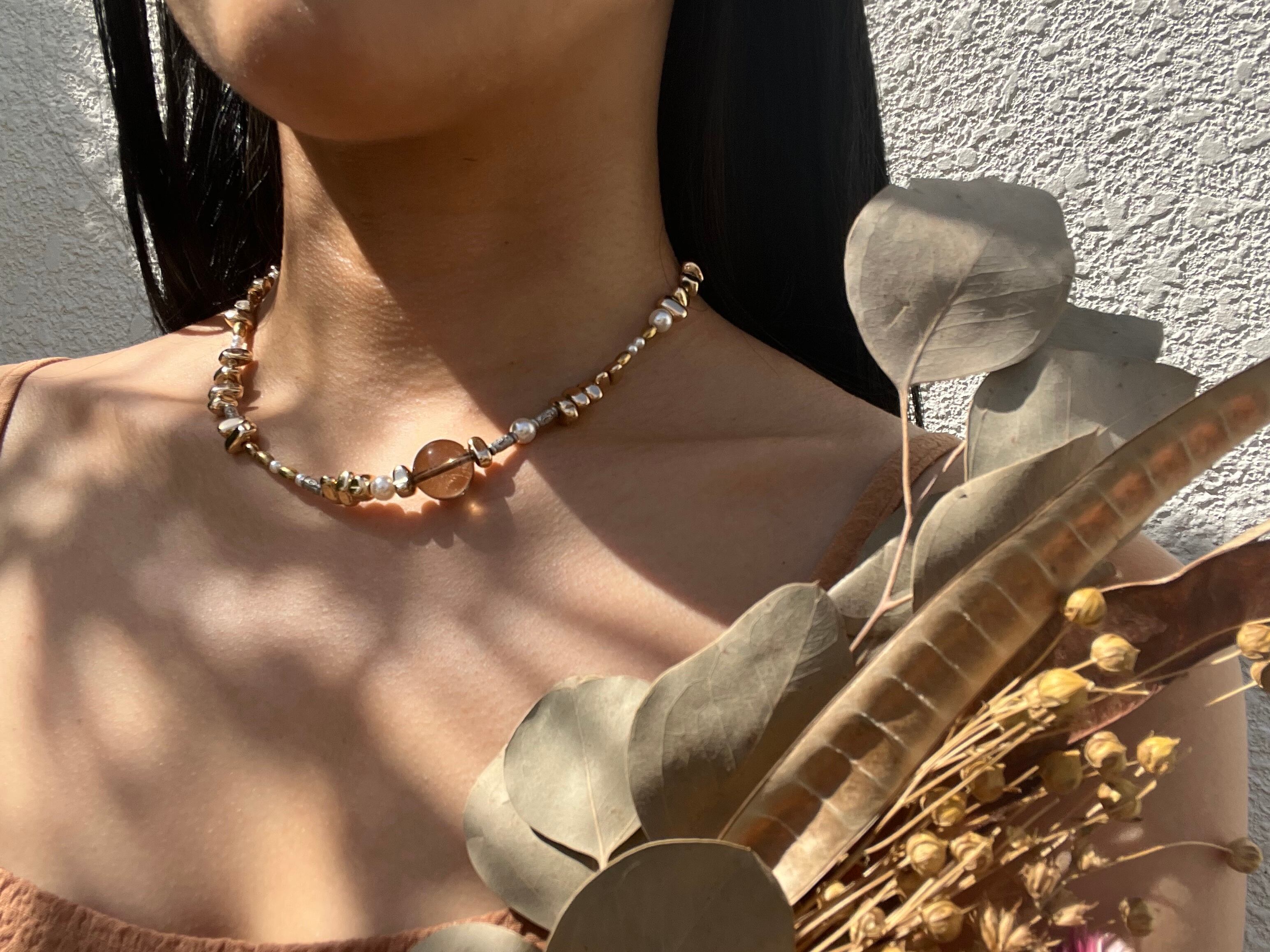 手作業で丁寧に作られたこのネックレスは、天然素材の個性を大切にしたデザインが特徴です。