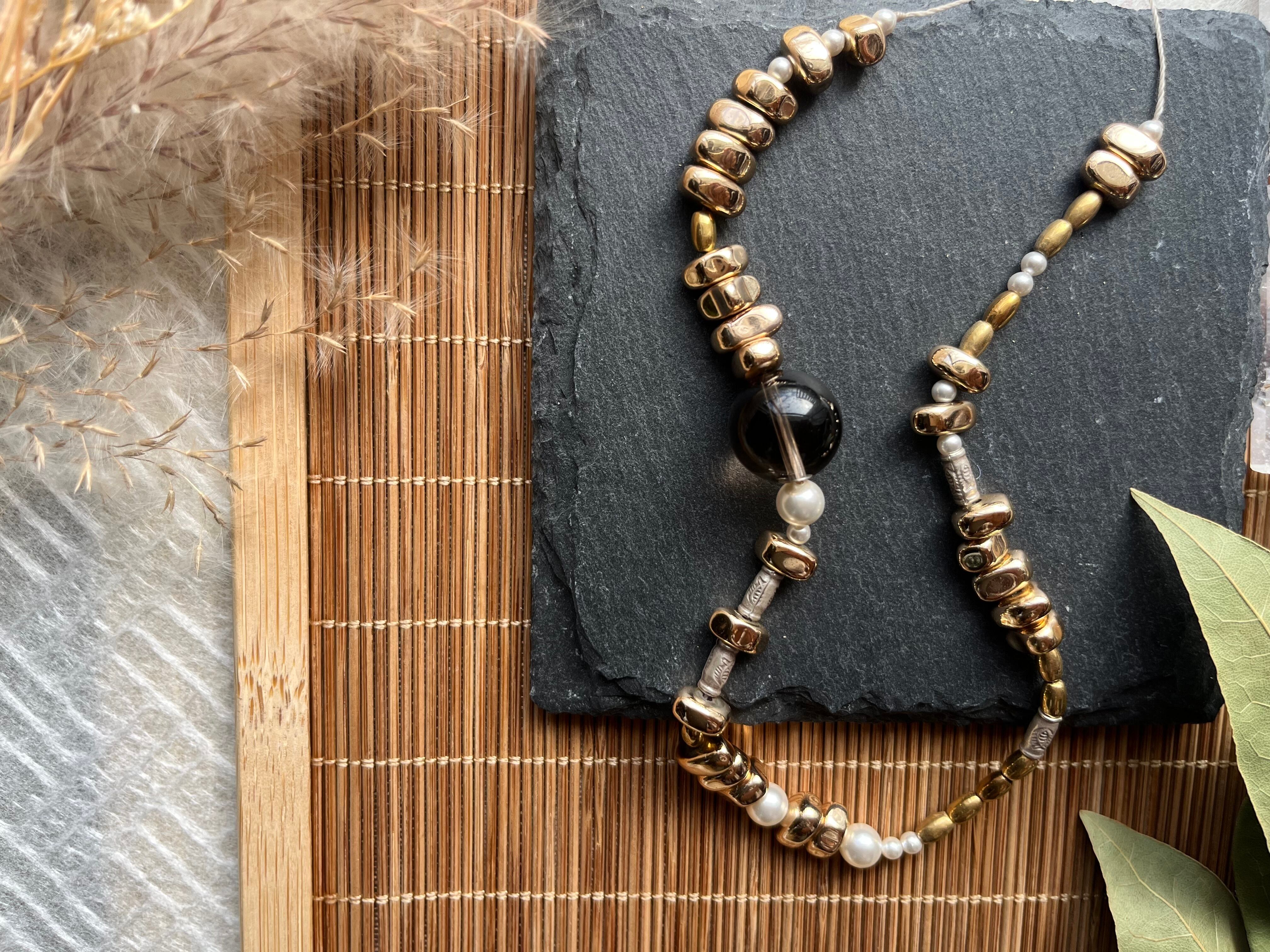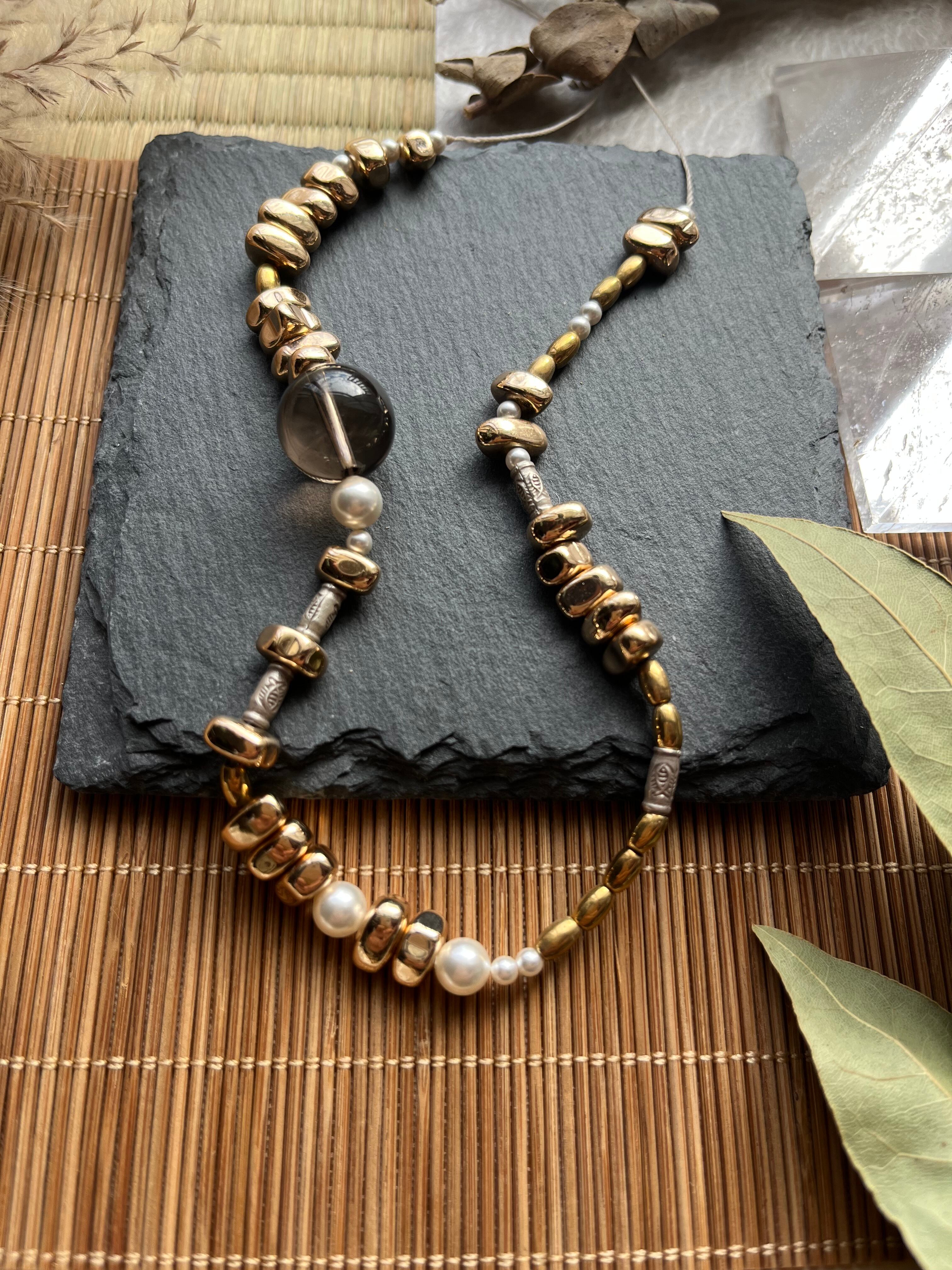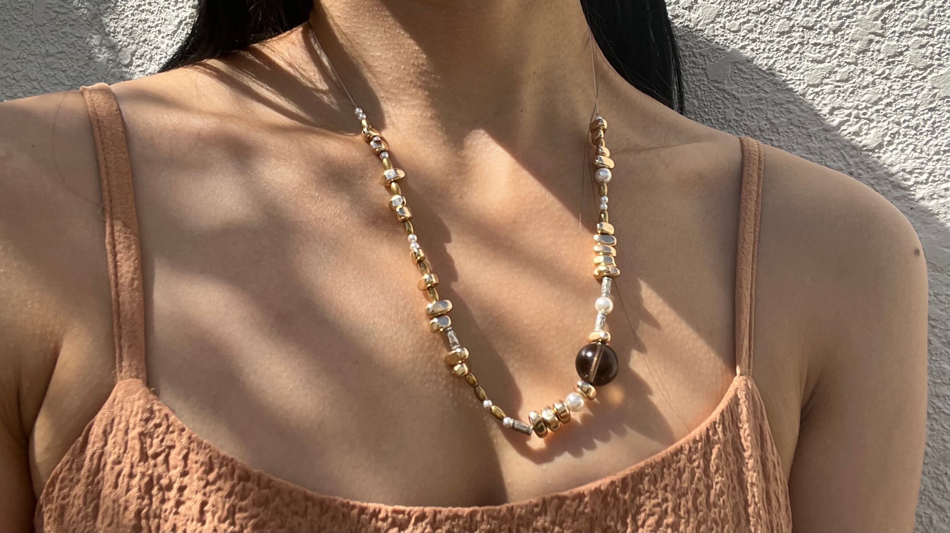 手作業で丁寧に作られたこのネックレスは、天然素材の個性を大切にしたデザインが特徴です。