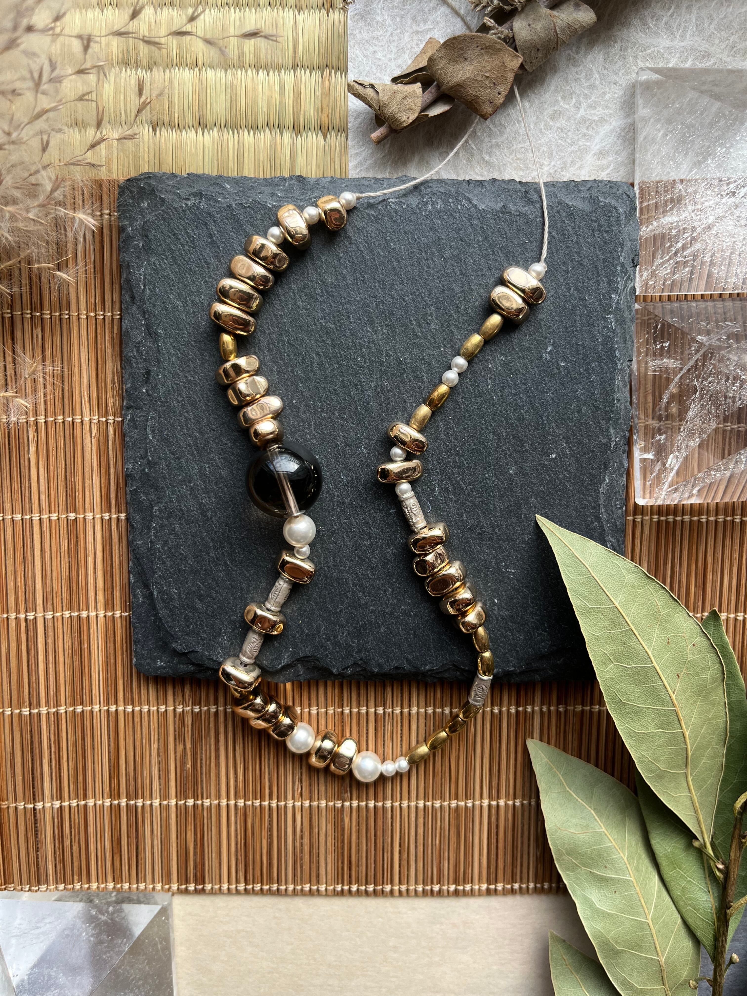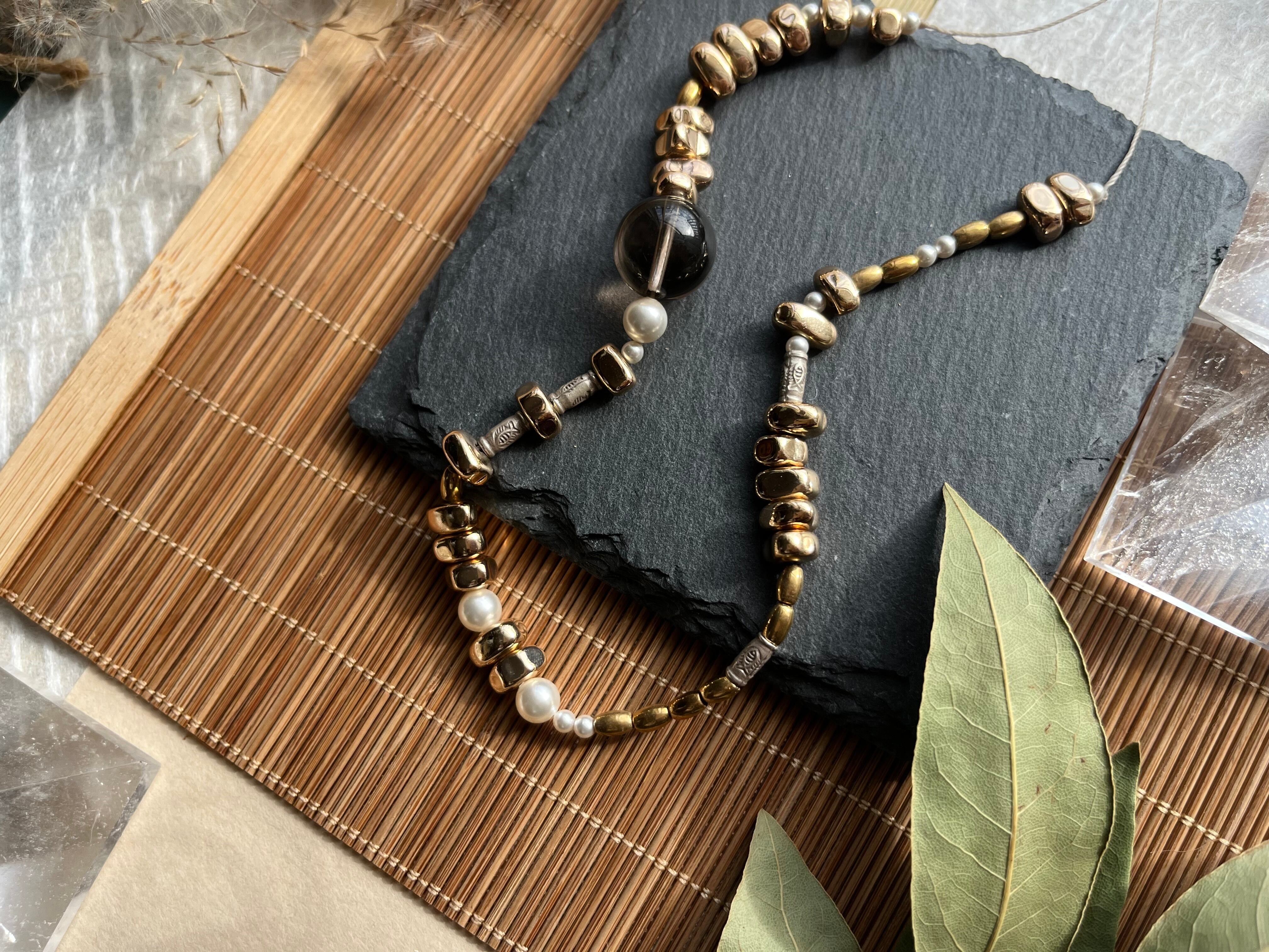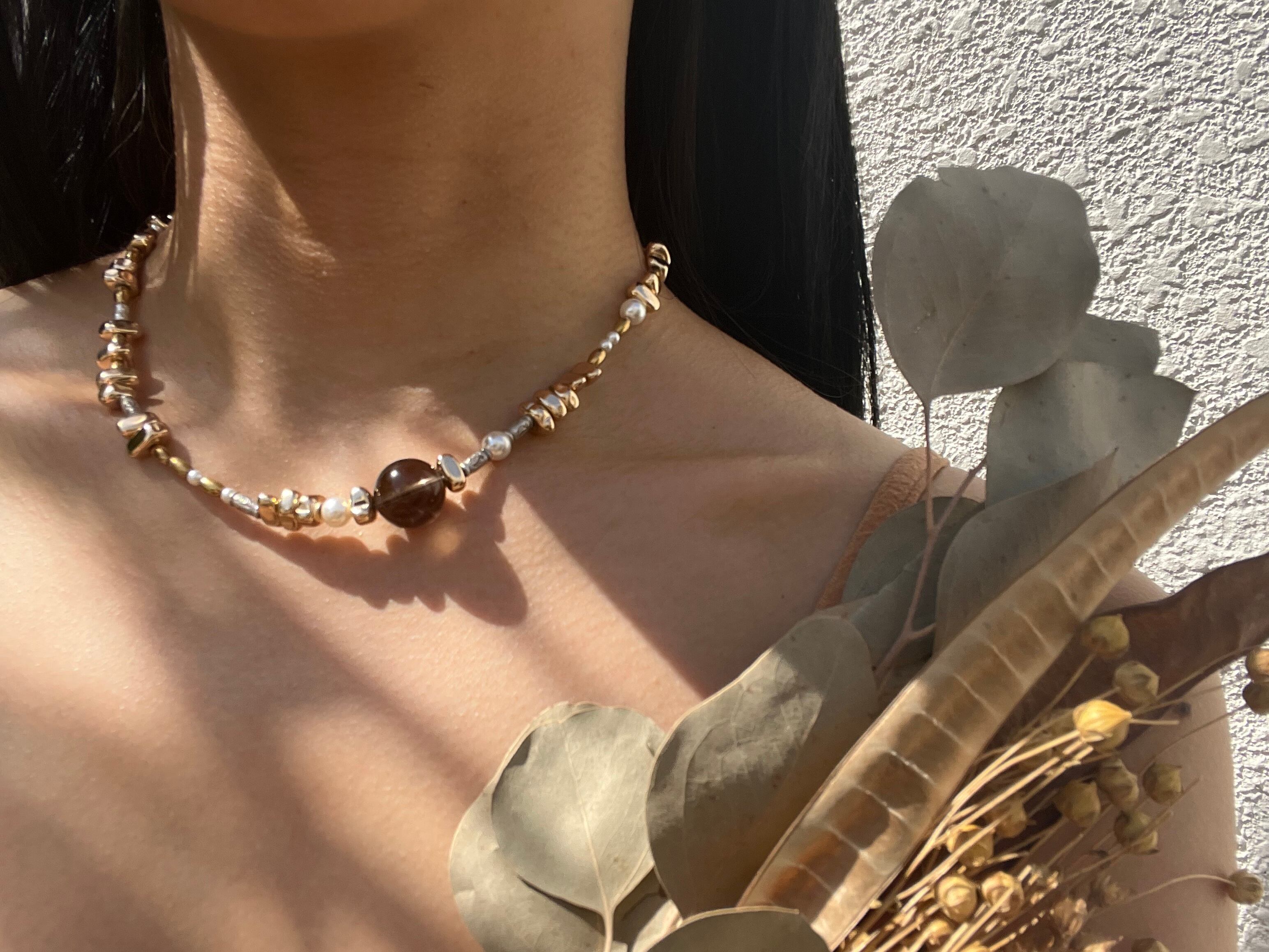 「NATURAL BEAUTY*自然の美」は、カレンシルバー、スモーキークウォーツ、ヘマタイト、スワロフスキーが織りなす魅力的なネックレスです。