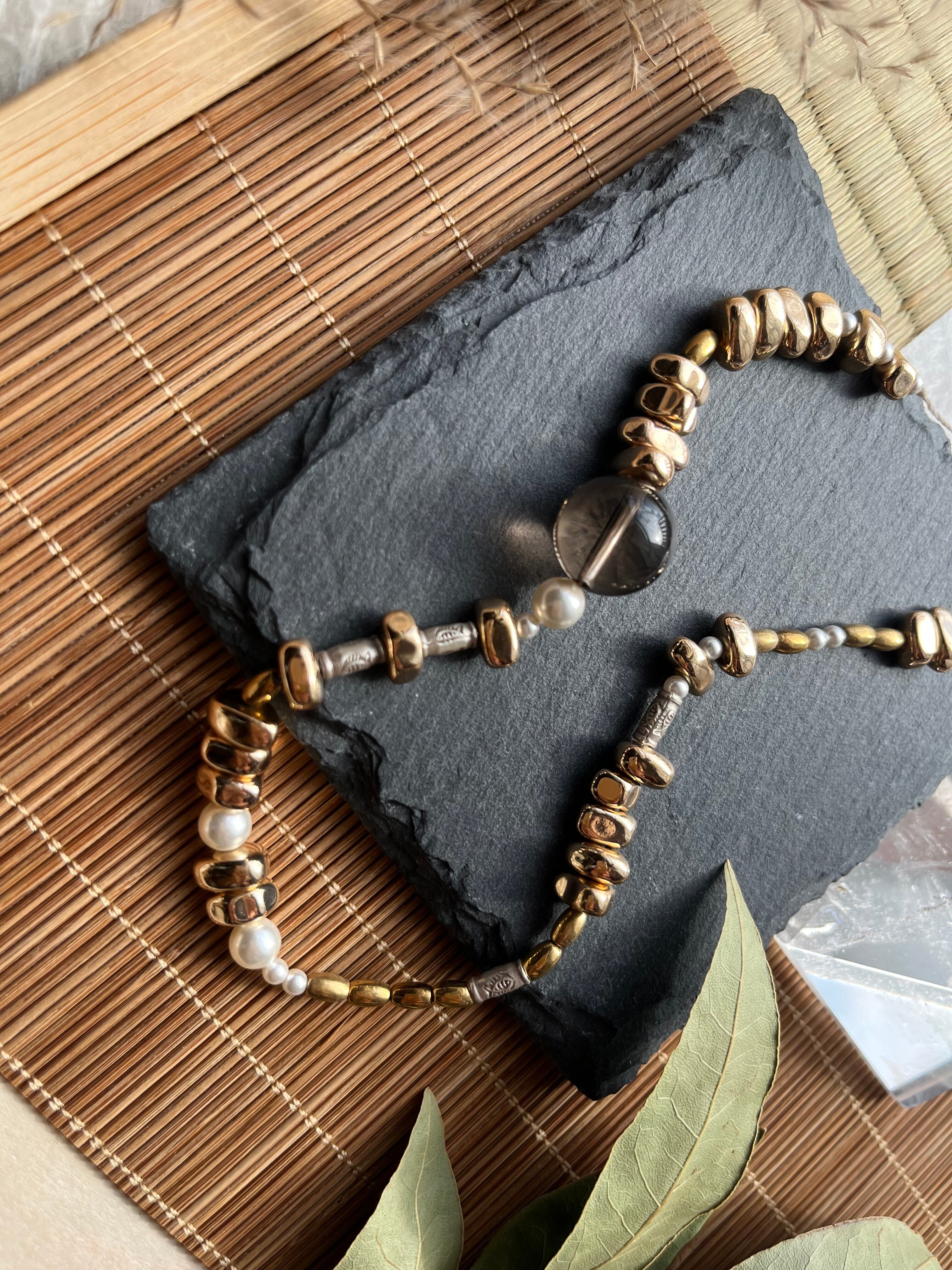 カレンシルバー、スモーキークウォーツ、ヘマタイト、スワロフスキーが調和し、あなたの存在感を引き立てます。