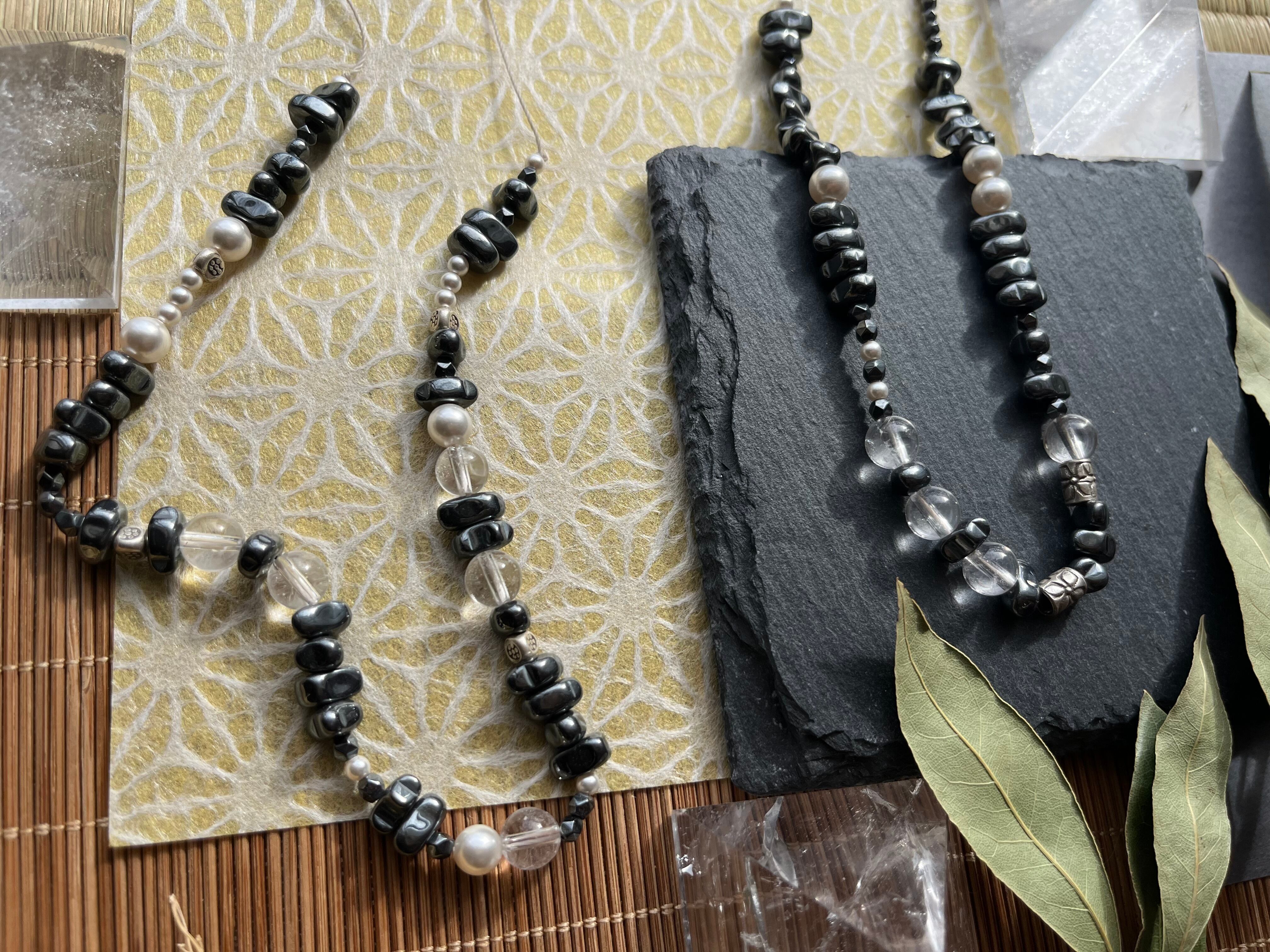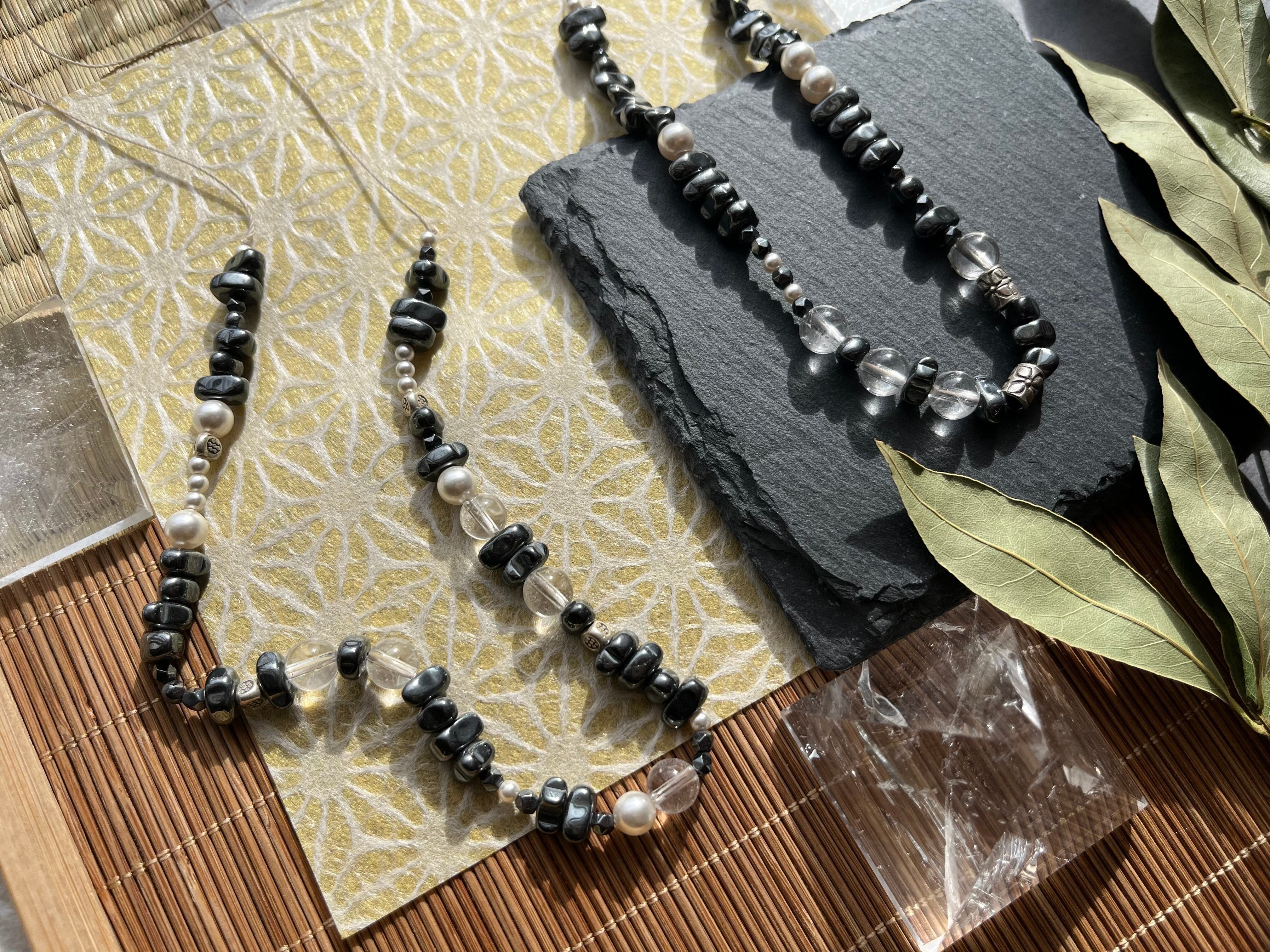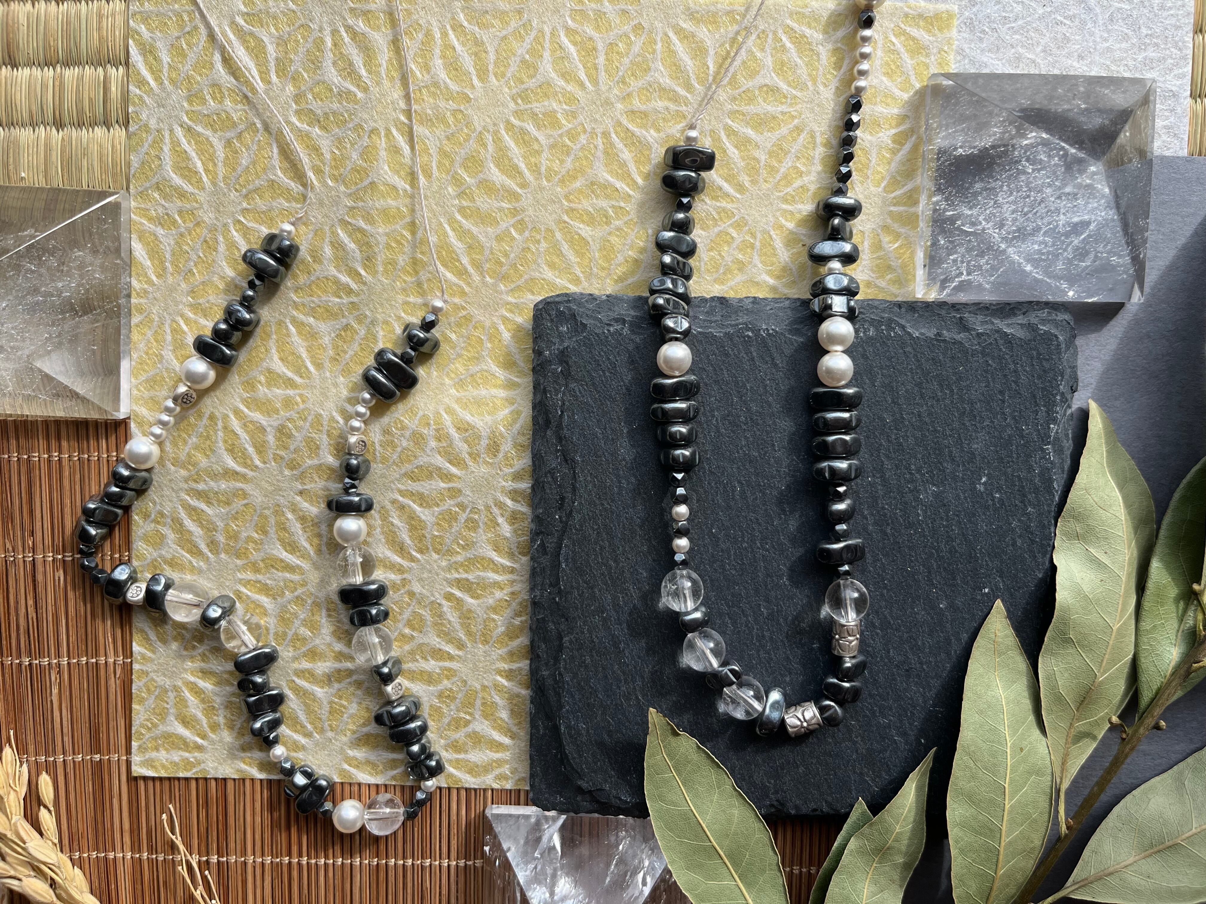 「NATURE'S HARMONY*自然の調和」は、カレンシルバー、ヘマタイト、水晶、スワロフスキーパールが織りなす魅力的なネックレスです。