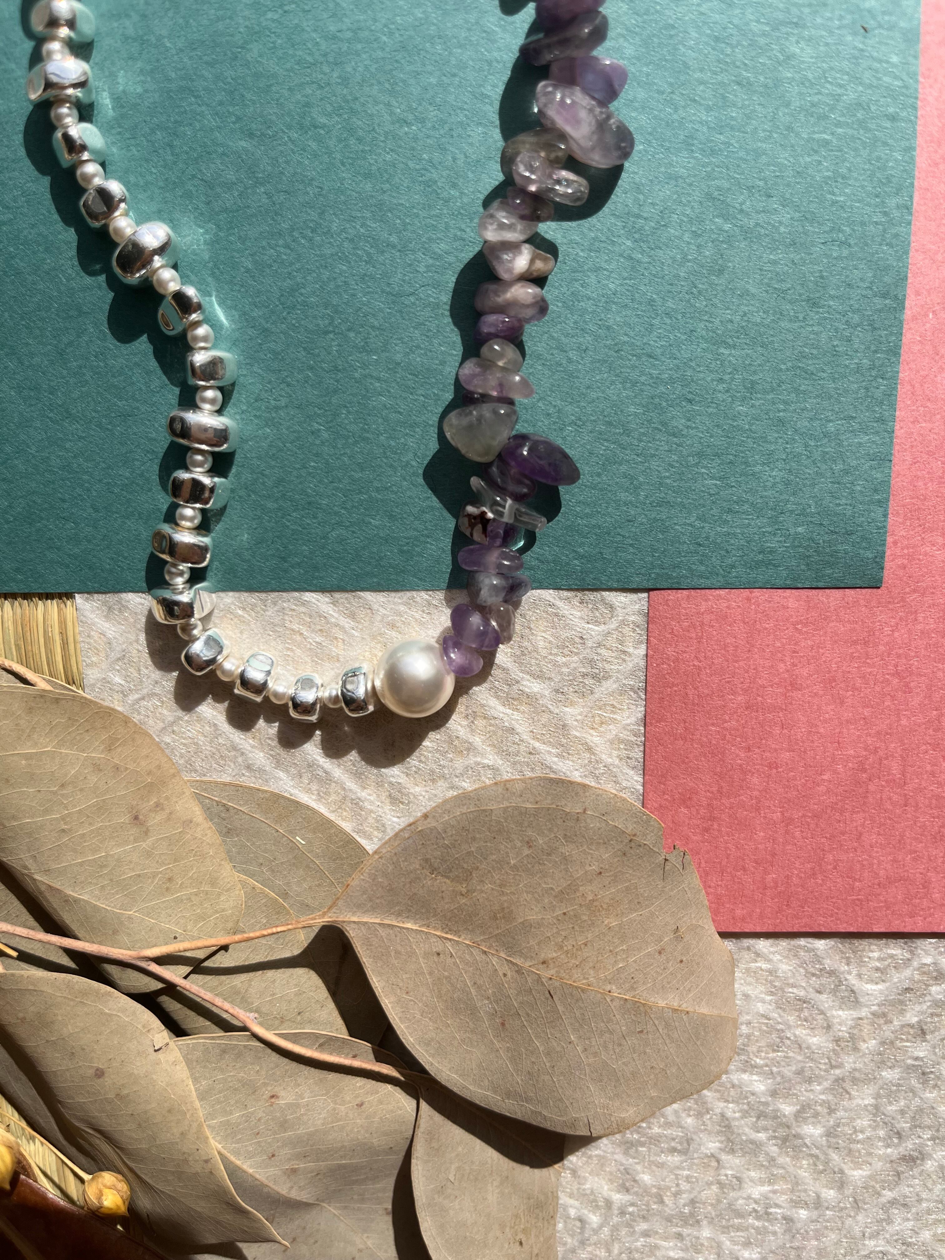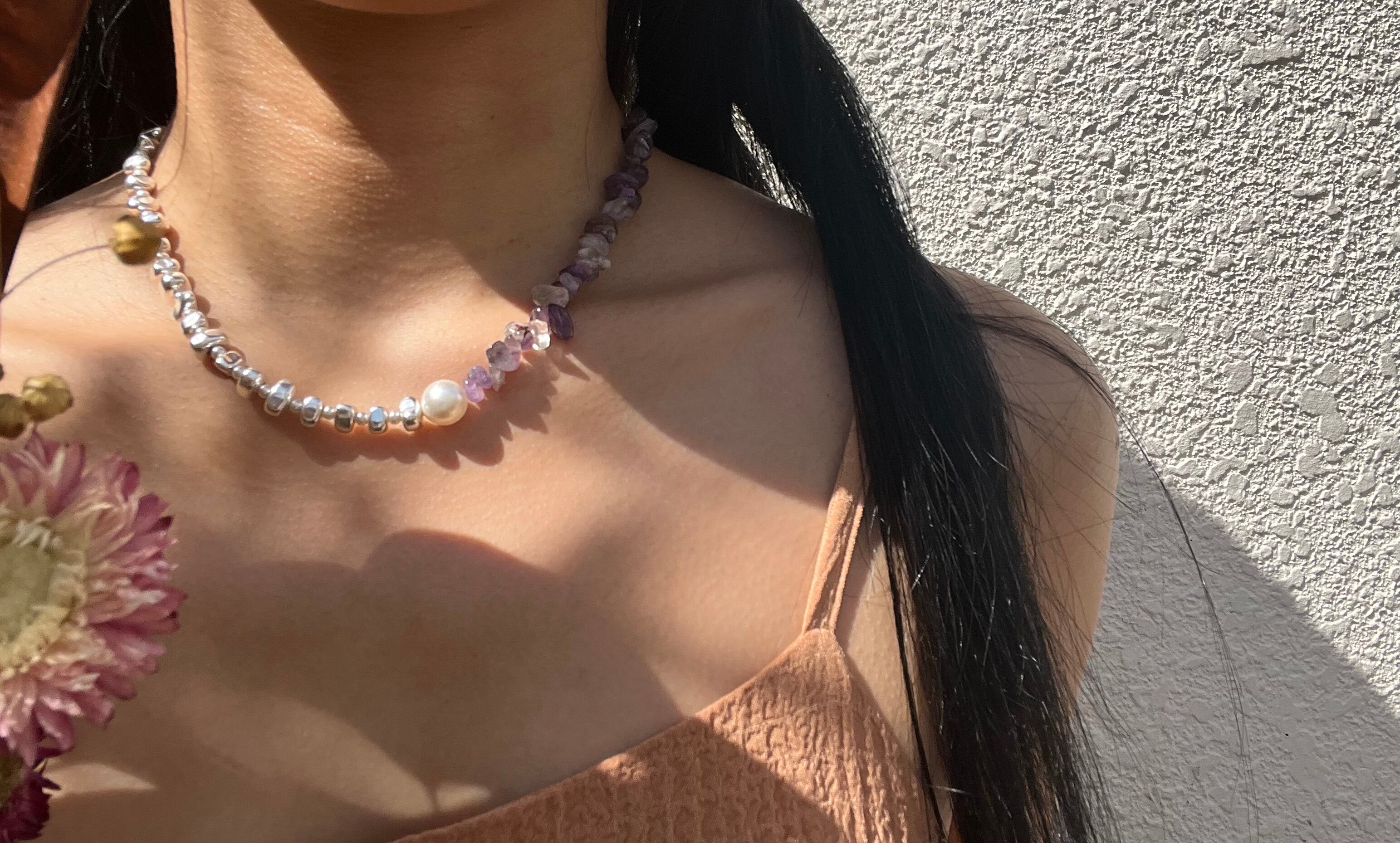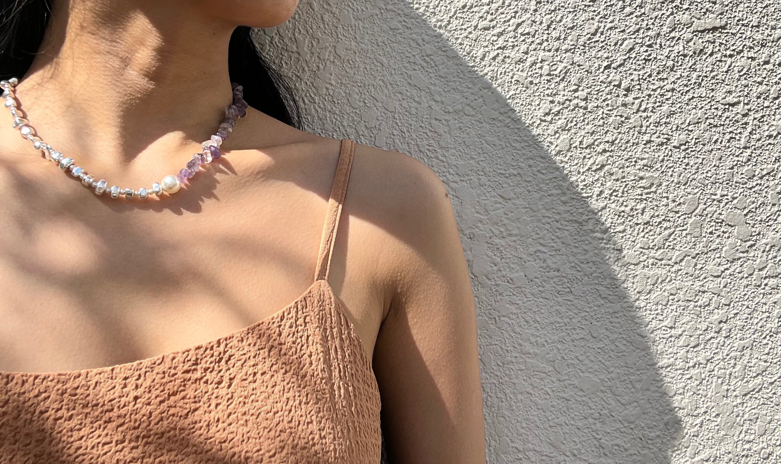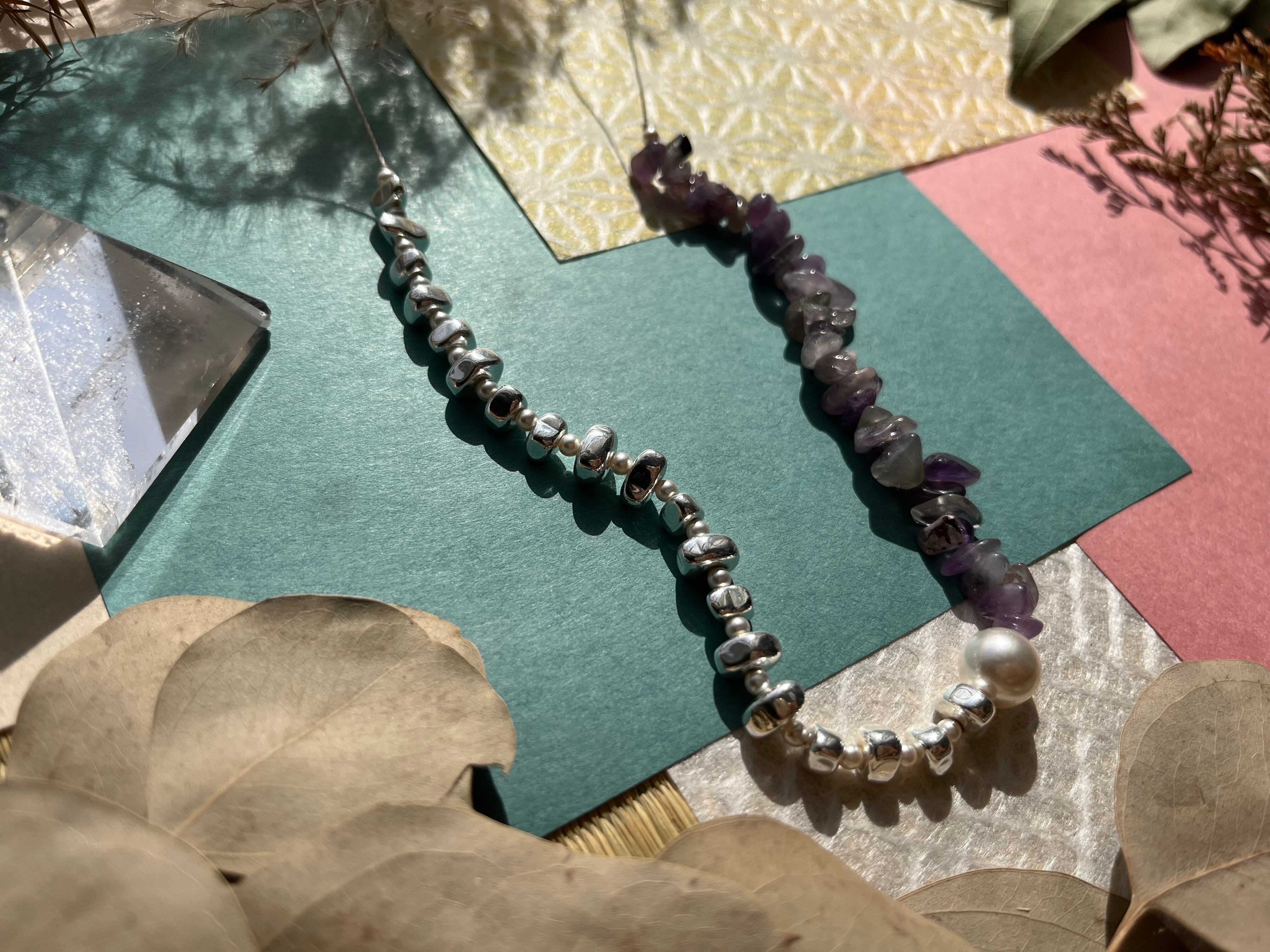 アメジスト、ヘマタイト、スワロフスキーパールが調和し、心に響くスタイルを演出します。