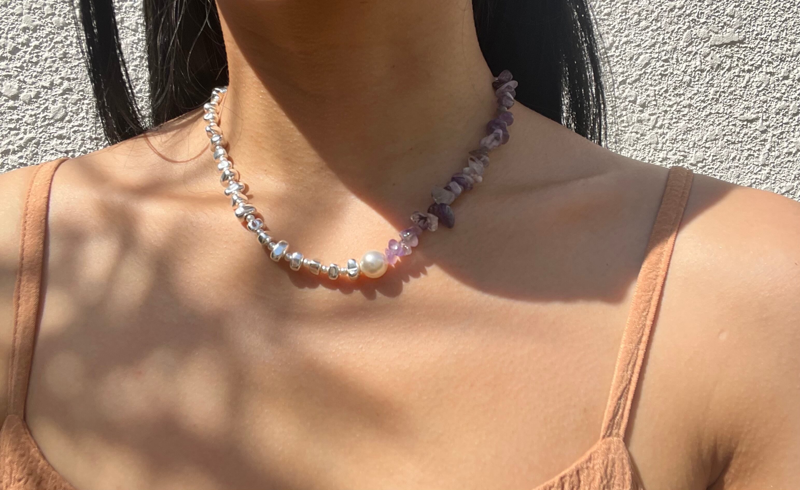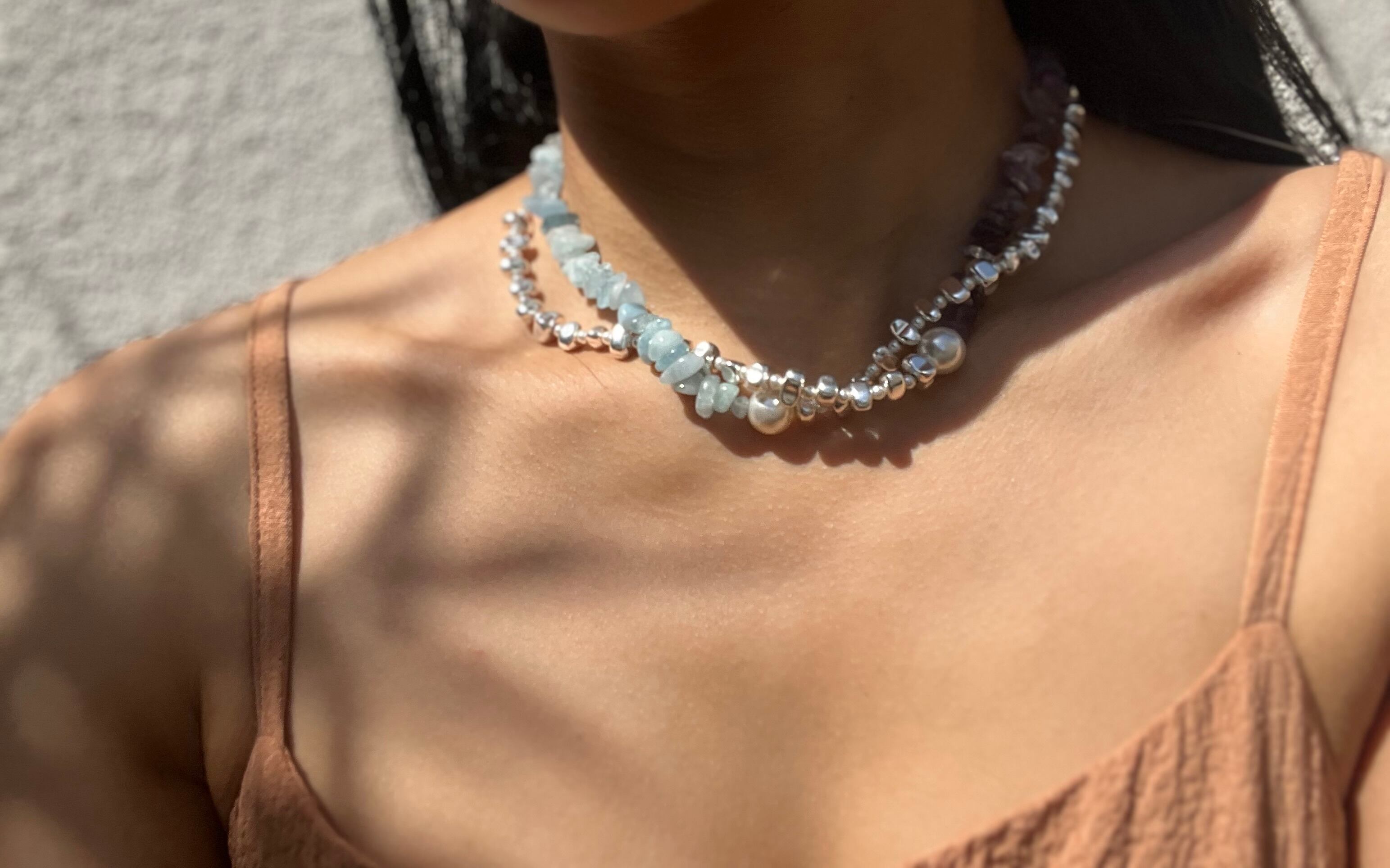 手作業で丁寧に作られたこのネックレスは、天然素材の個性を大切にしたデザインが魅力です。