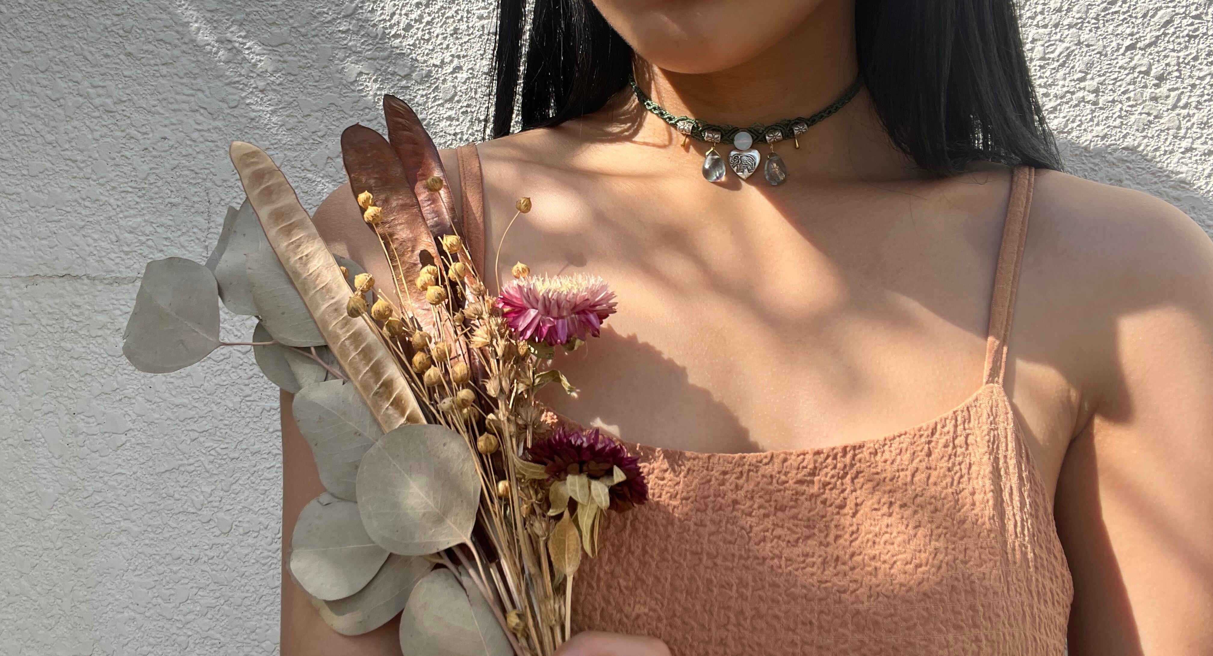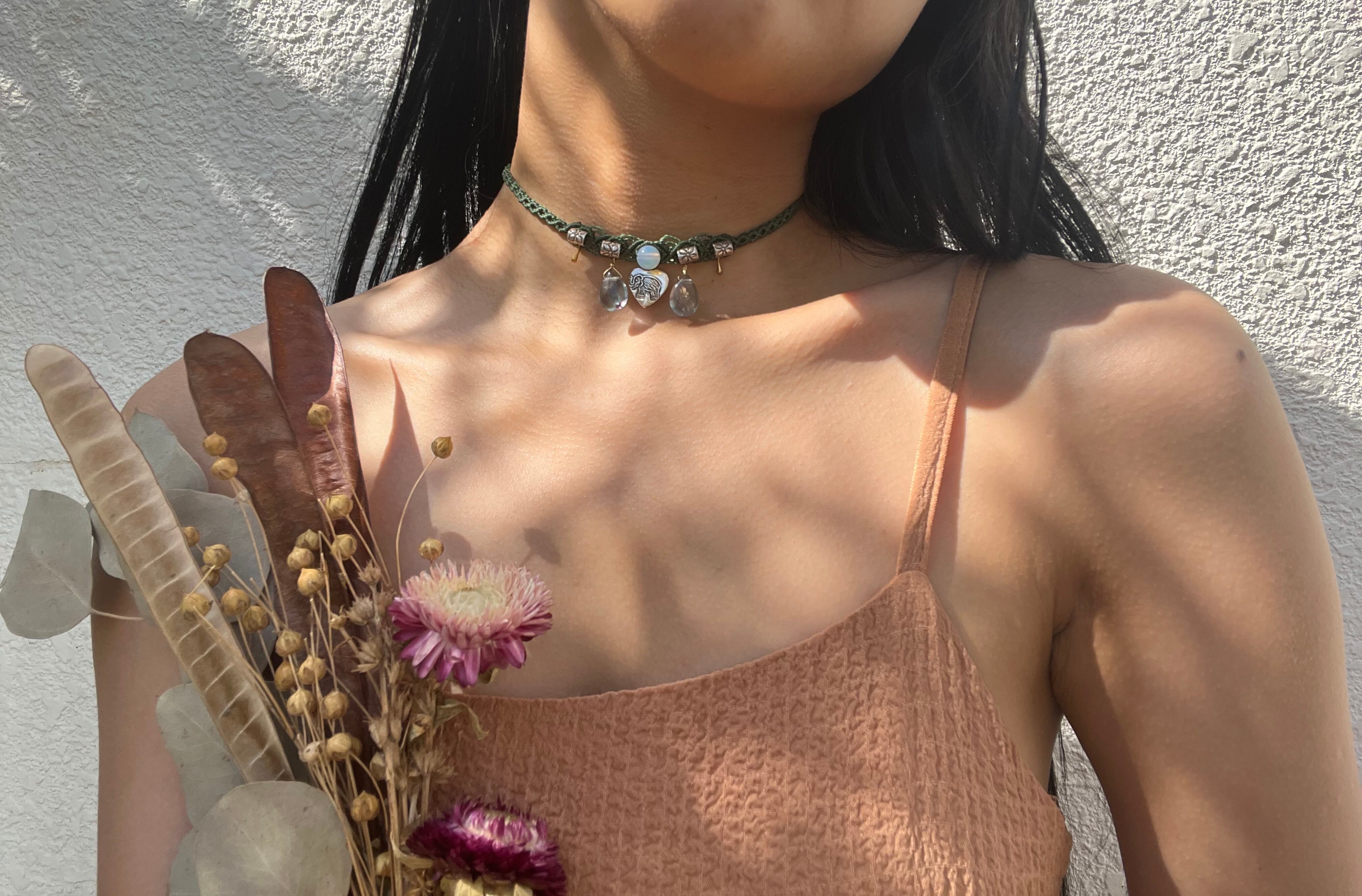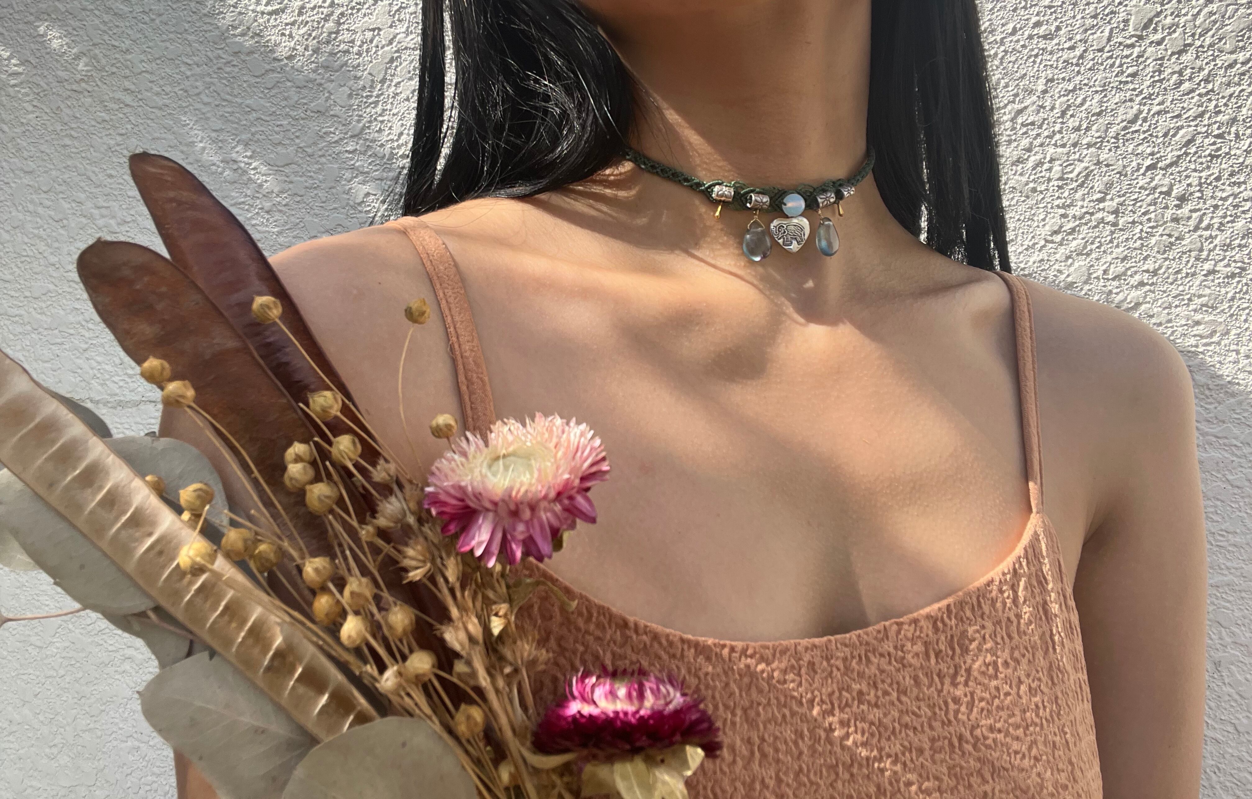 手作業で丁寧に作られたこのチョーカーは、天然素材の特性を最大限に生かしたデザインが特徴です。
