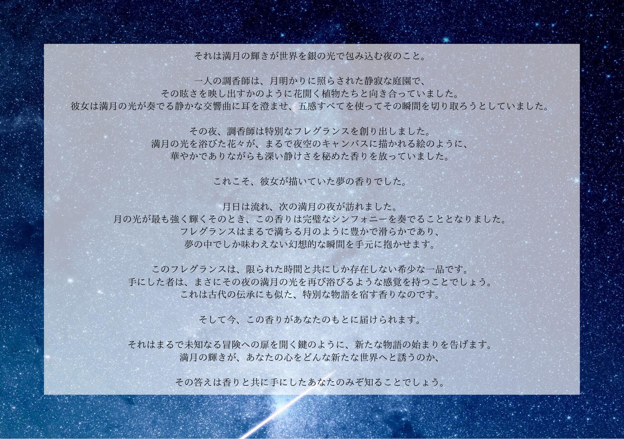 月の光が最も強く輝くそのとき、この香りは完璧なシンフォニーを奏でることとなりました。