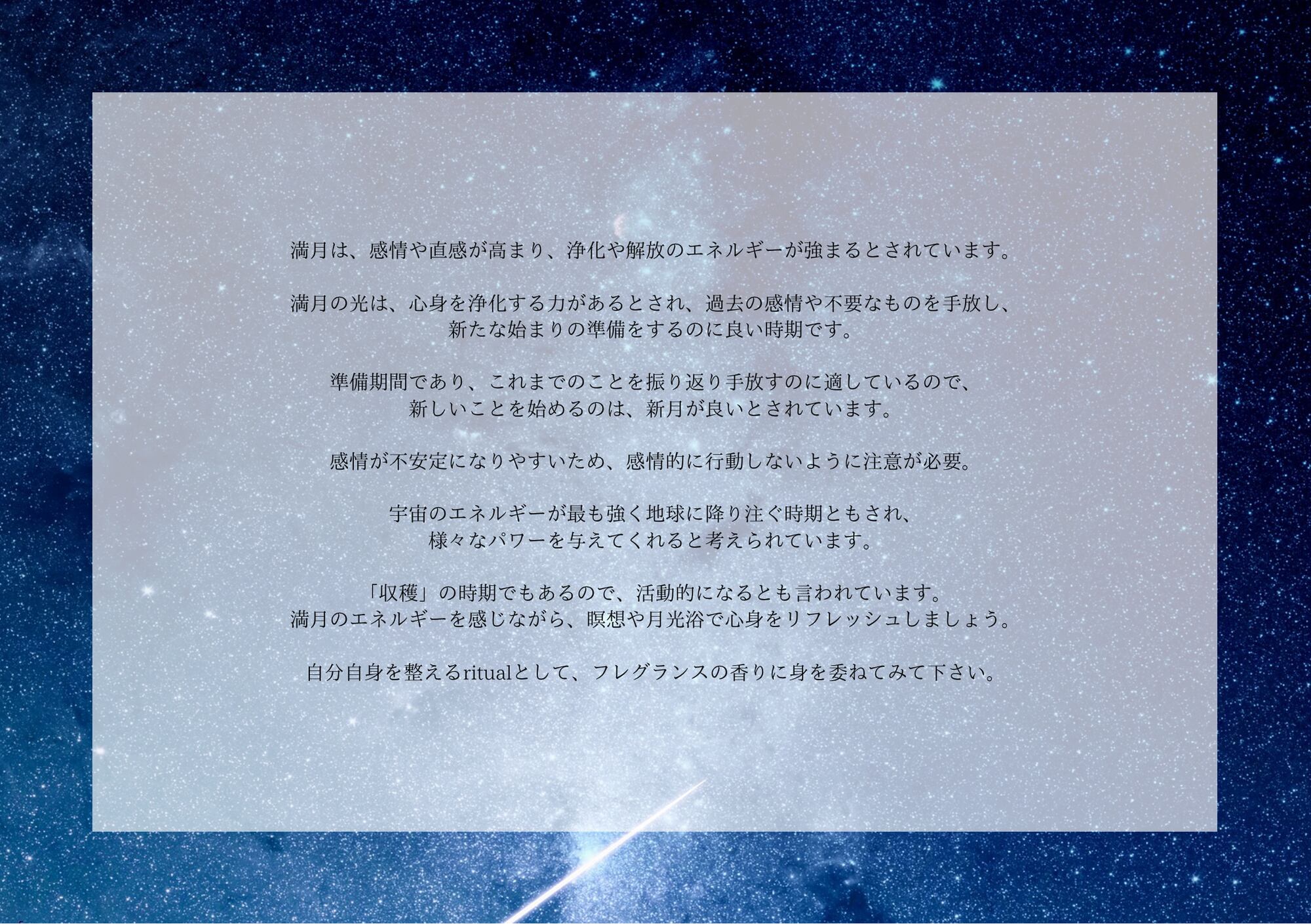 満月は、感情や直感が高まり、浄化や解放のエネルギーが強まるとされています。