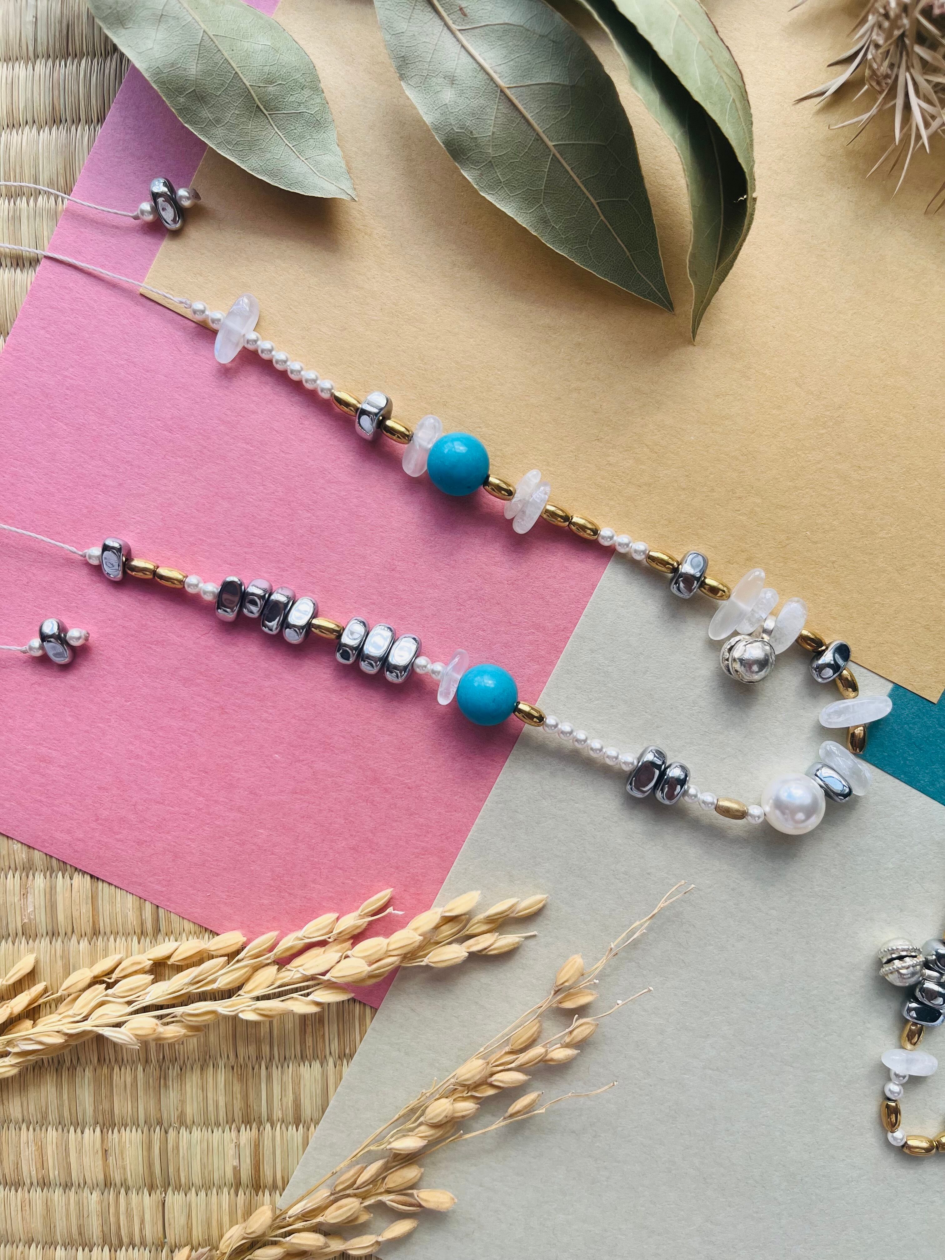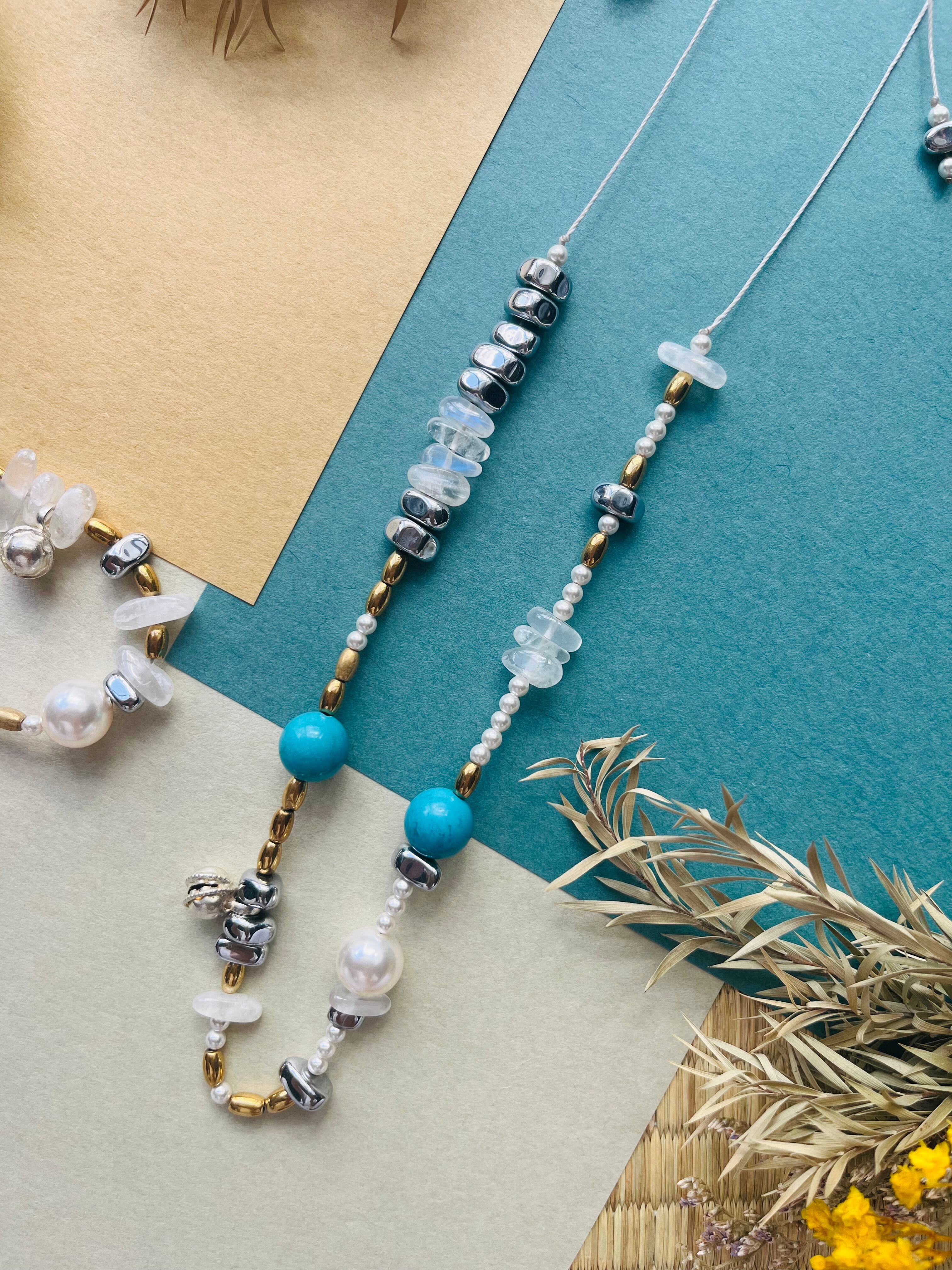 "このネックレスは、インディアントップ、ターコイズ、ヘマタイト、スワロフスキーパール、オパールの美しいコラボレーションが魅力の特別なアイテムです。洗練されたデザインが、あなたの魅力を引き立て、さまざまなシーンに華やかさを添えることでしょう。"