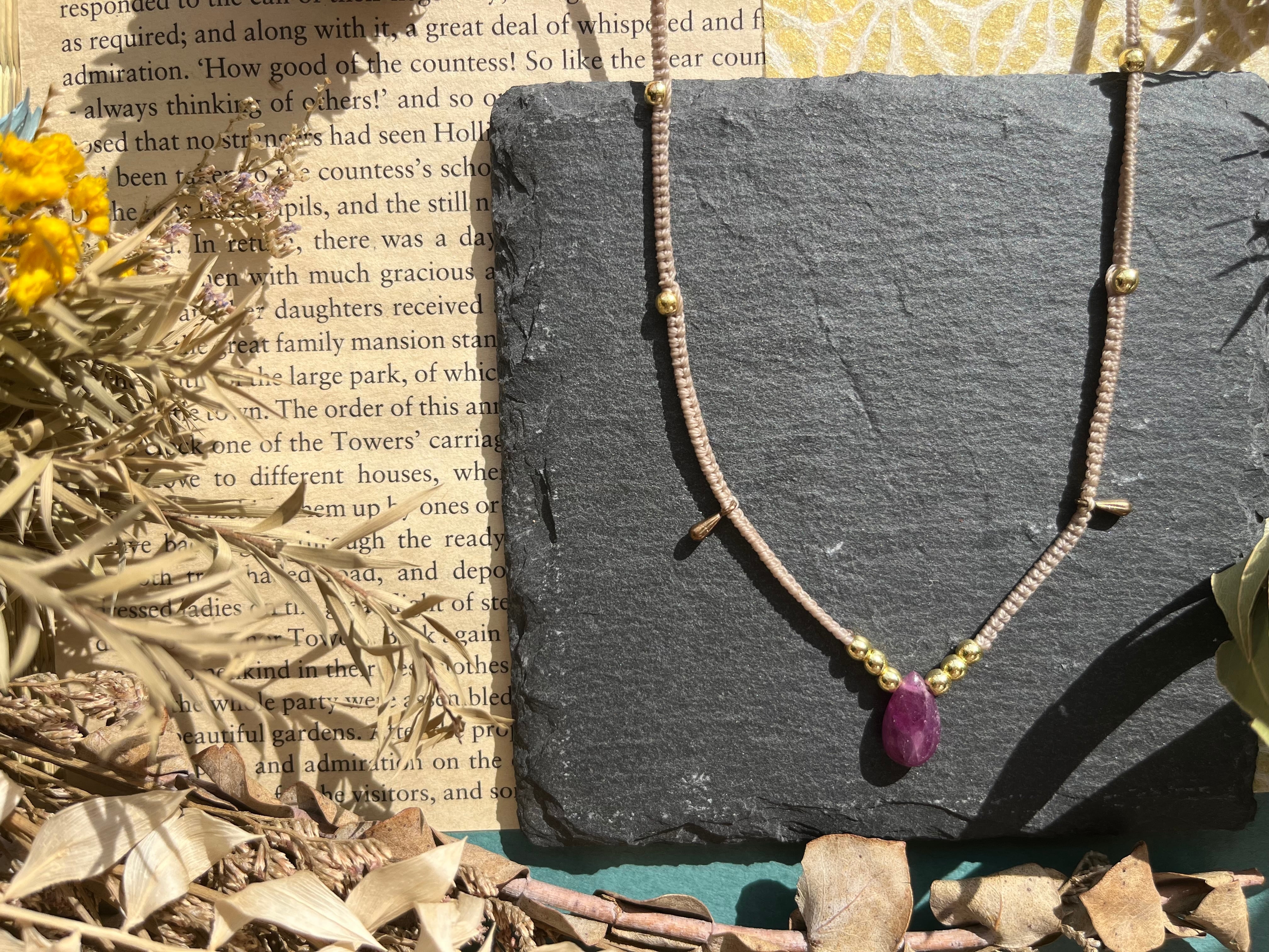 "このネックレスは、深みのあるルビーと力強いヘマタイトを組み合わせた洗練されたアイテムです。鮮やかな色合いがあなたのスタイルに華やかさを加え、独自の個性を引き立てます。シンプルながらも存在感のあるデザインは、普段使いから特別なシーンまで幅広くお楽しみいただけることでしょう。"