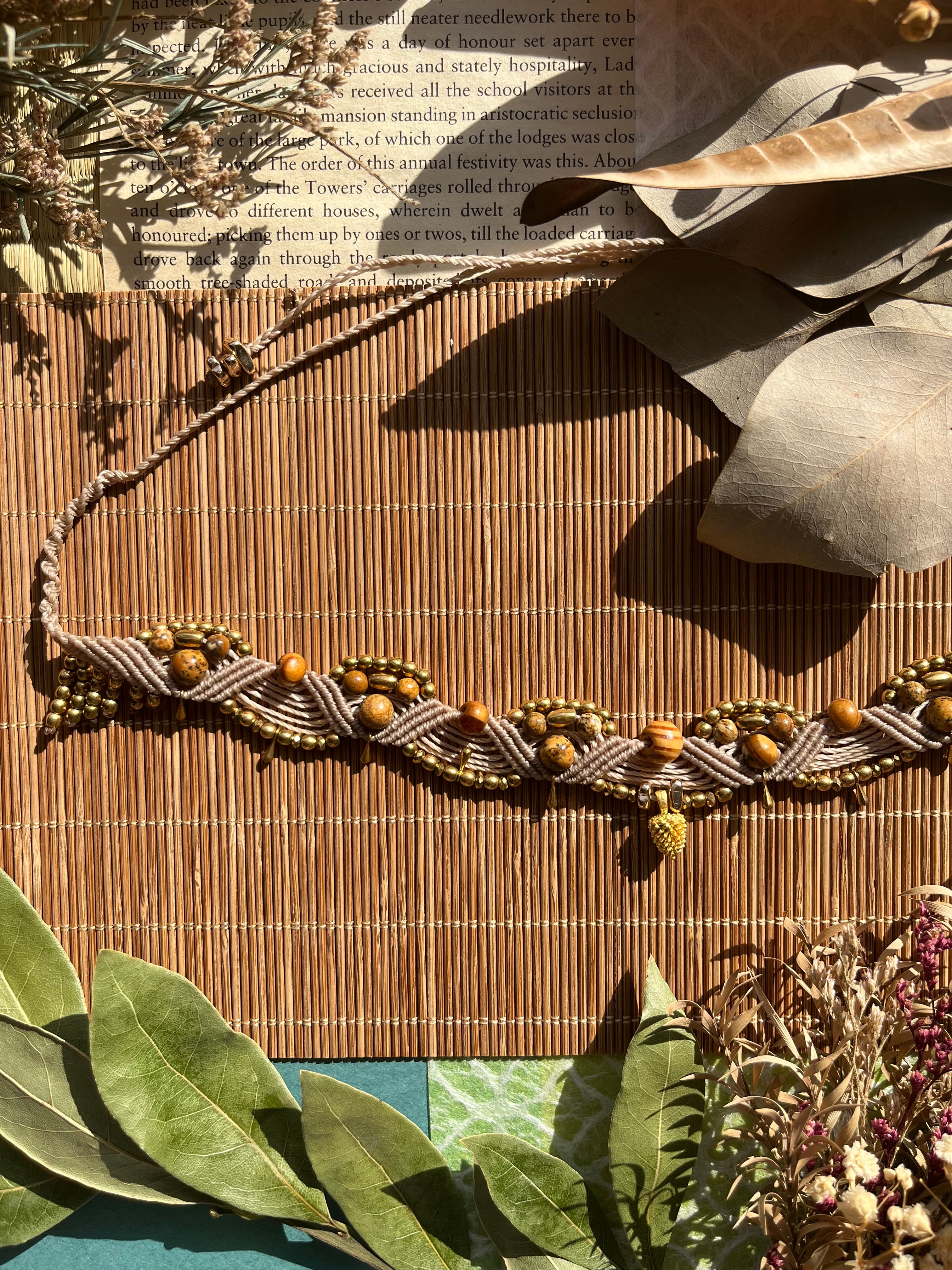 "このチョーカーは、伝統的な青海波模様と松ぼっくりのトップを組み合わせた、和の風情漂う魅力的なアイテムです。ヘマタイトと松のナチュラルな風合いが、あなたのスタイルに独自の個性を加え、シンプルでありながらも印象的な存在感を演出します。特別な日から普段使いまで、さまざまなシーンでお楽しみいただけることでしょう。"