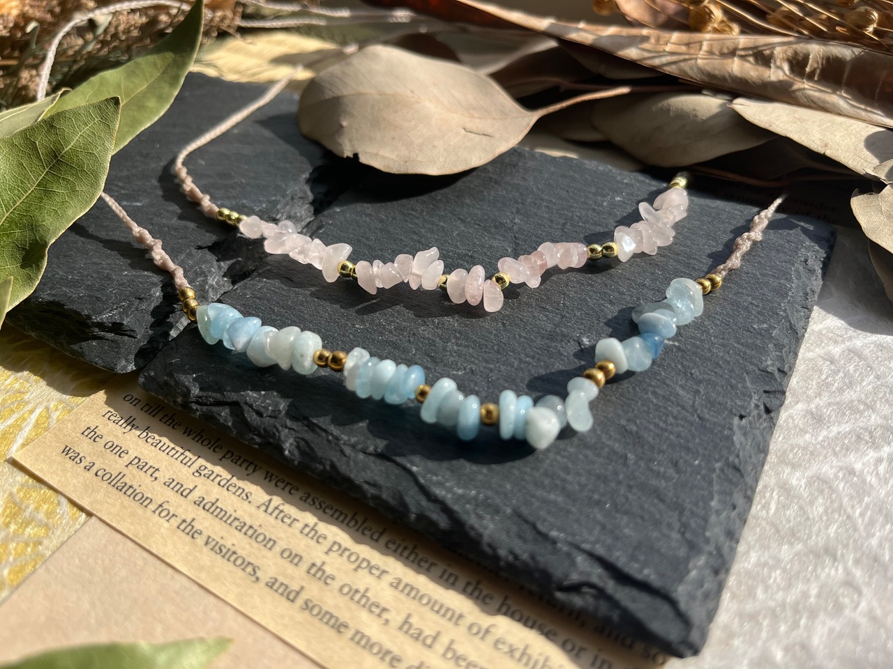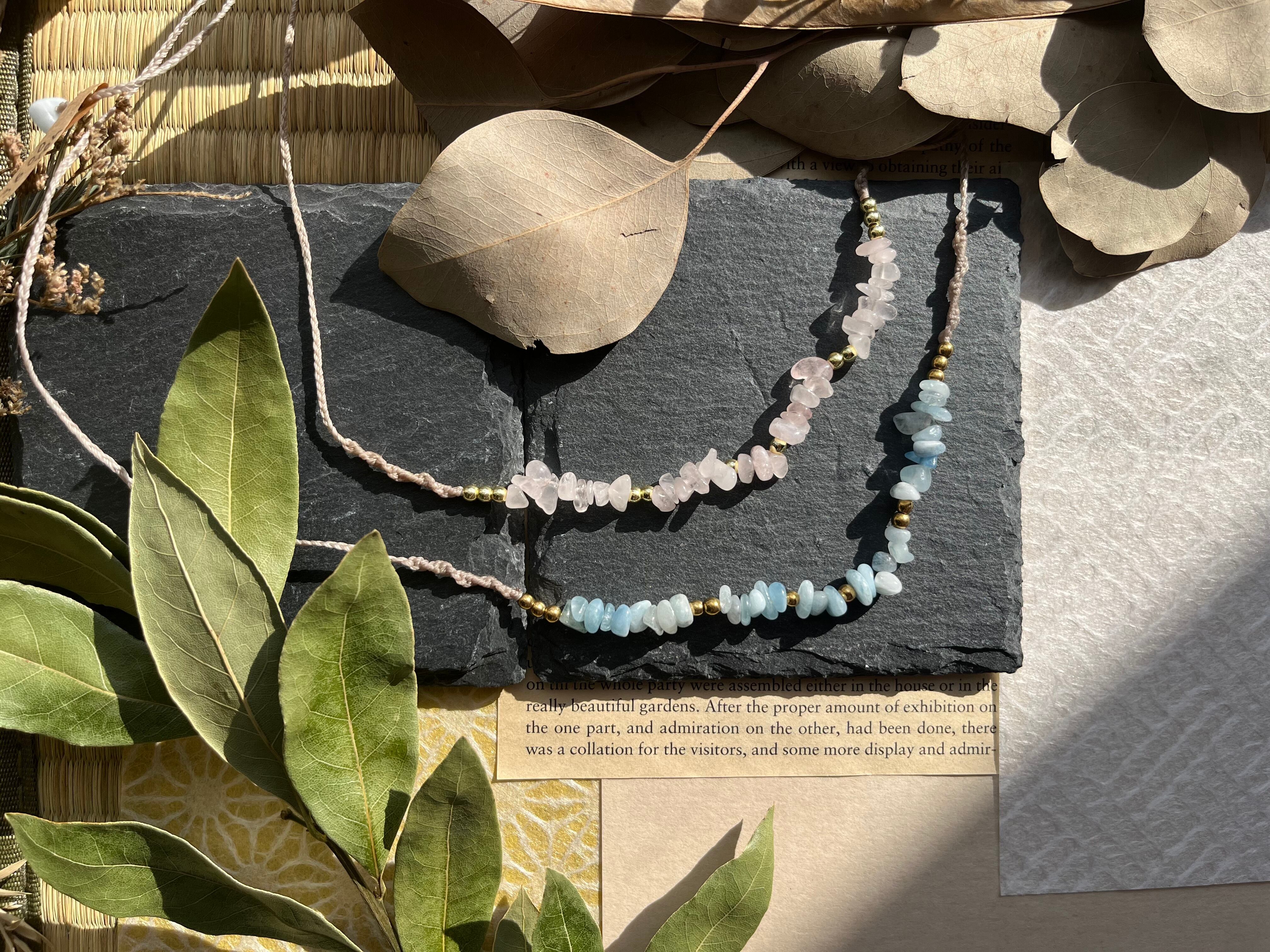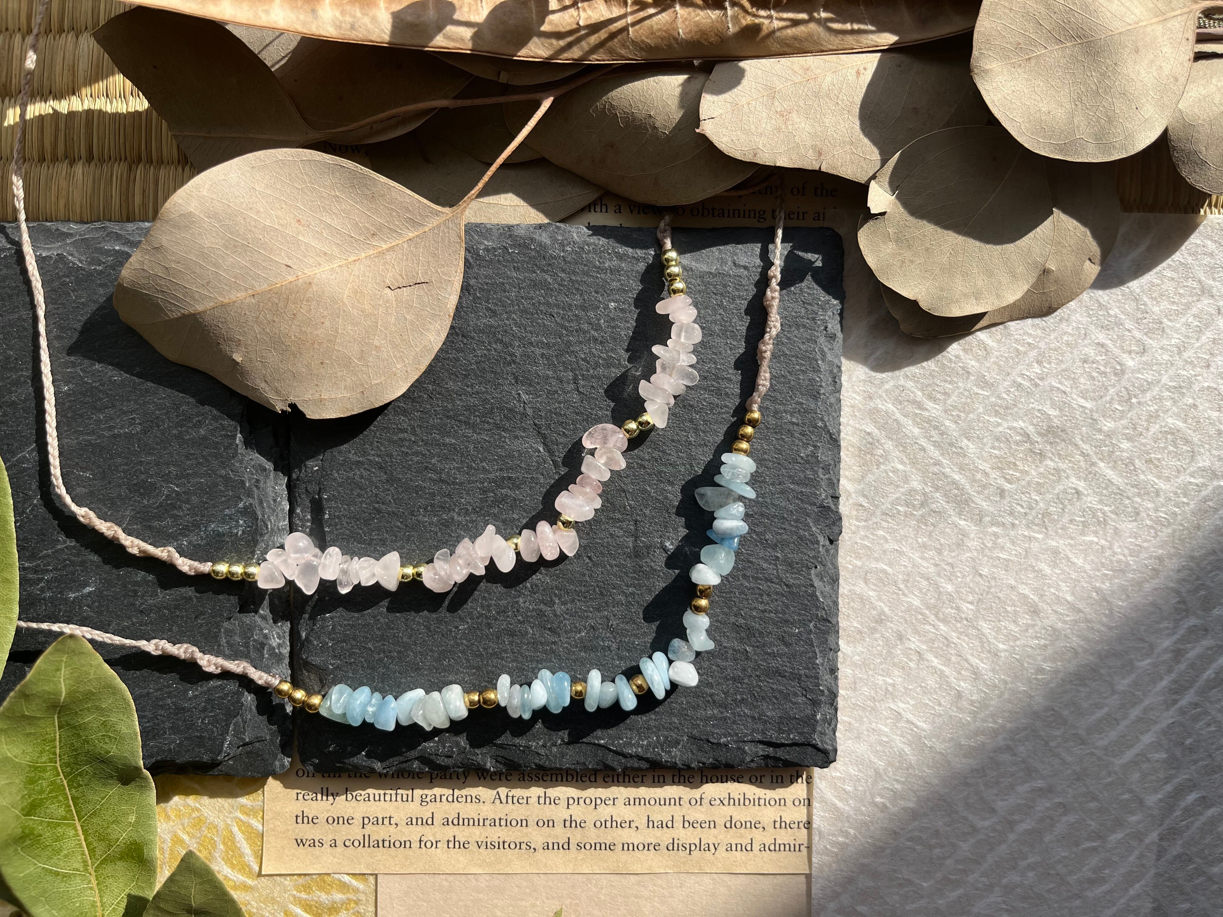 "このネックレスは、2色のローズクォーツとアクアマリン、ヘマタイトを組み合わせた、美しく魅力的なアイテムです。優しいピンクのローズクォーツと透き通ったアクアマリン、そしてクールなヘマタイトが織りなすハーモニーは、あなたのスタイルに特別なアクセントを与え、日常使いから特別な日の装いまで幅広くご利用いただけます。"