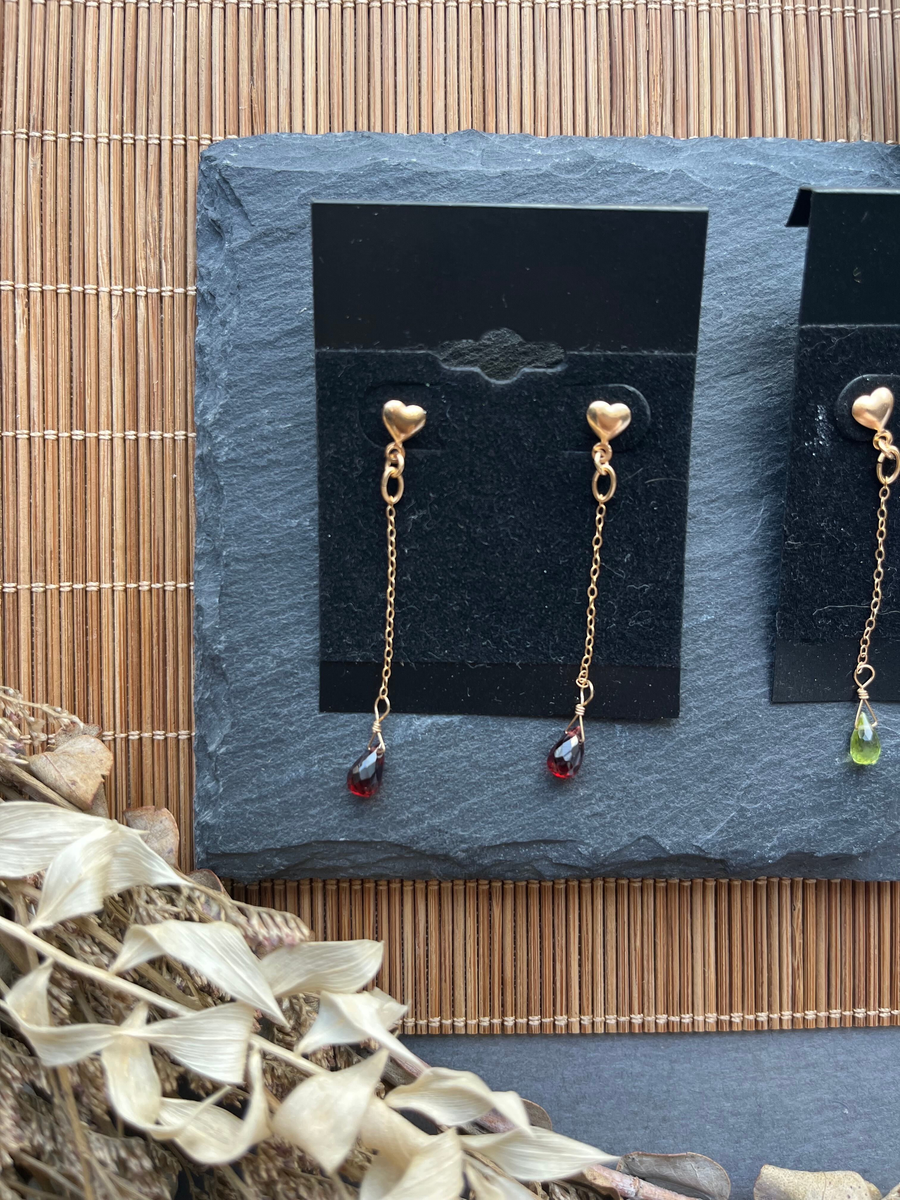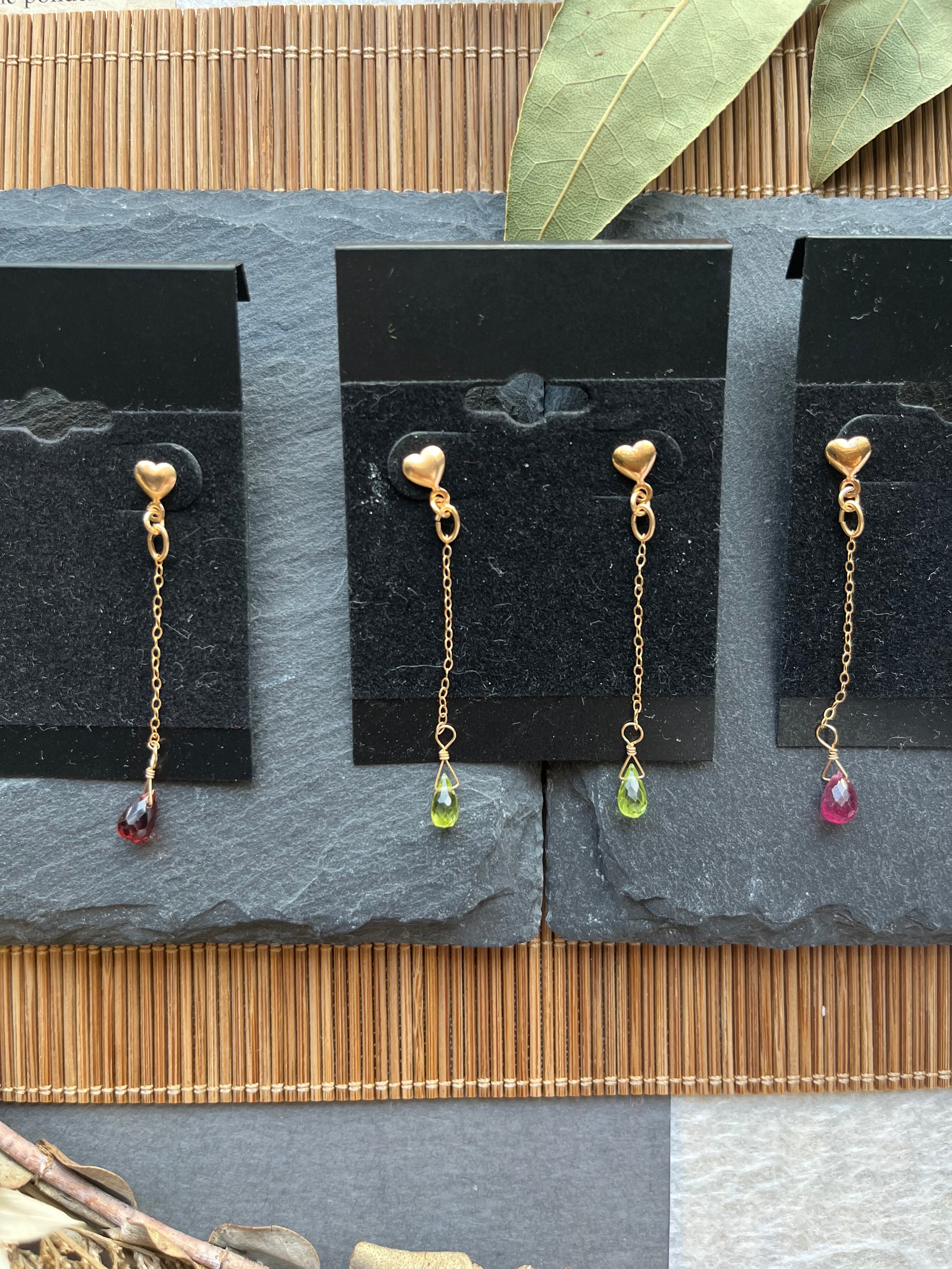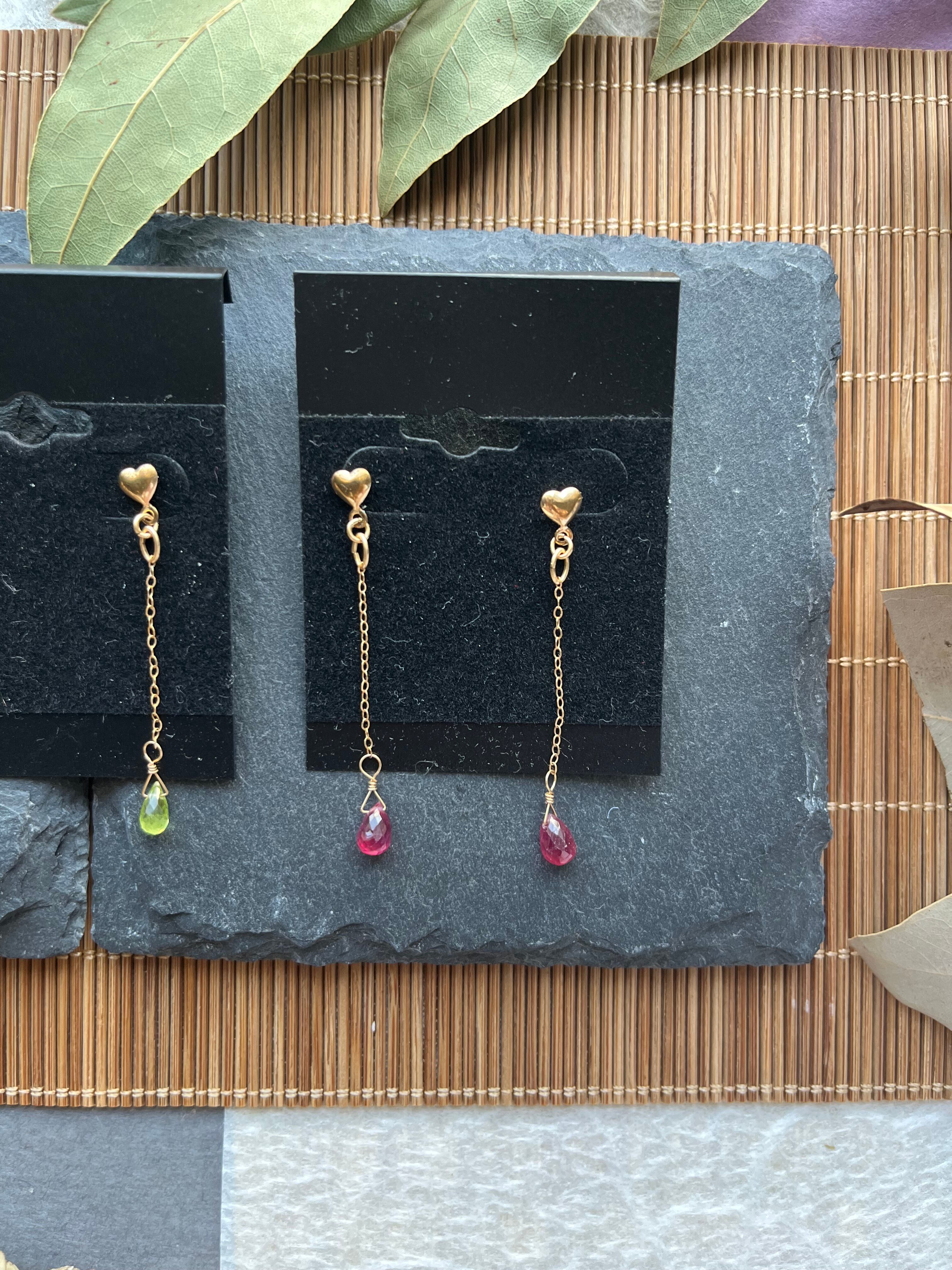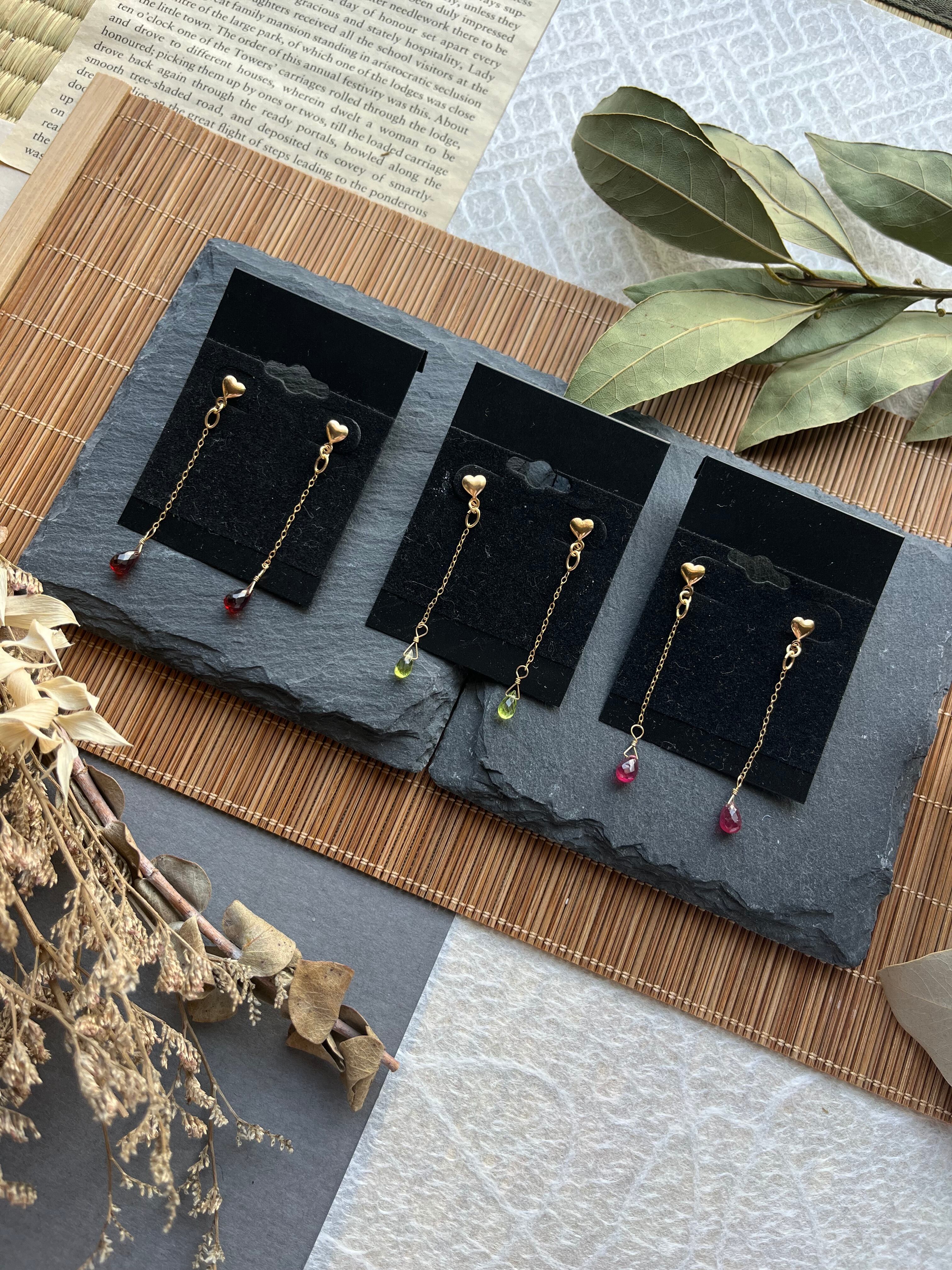 "このピアスは、14kgfのフレームに鮮やかなガーネット、清らかなペリドット、情熱的なルビーをあしらった、気品あふれるアイテムです。美しい宝石たちが、あなたのスタイルに華やかで特別な印象を与えます。特別な日から日常使いまで、さまざまなシーンで活躍すること間違いなしです!"