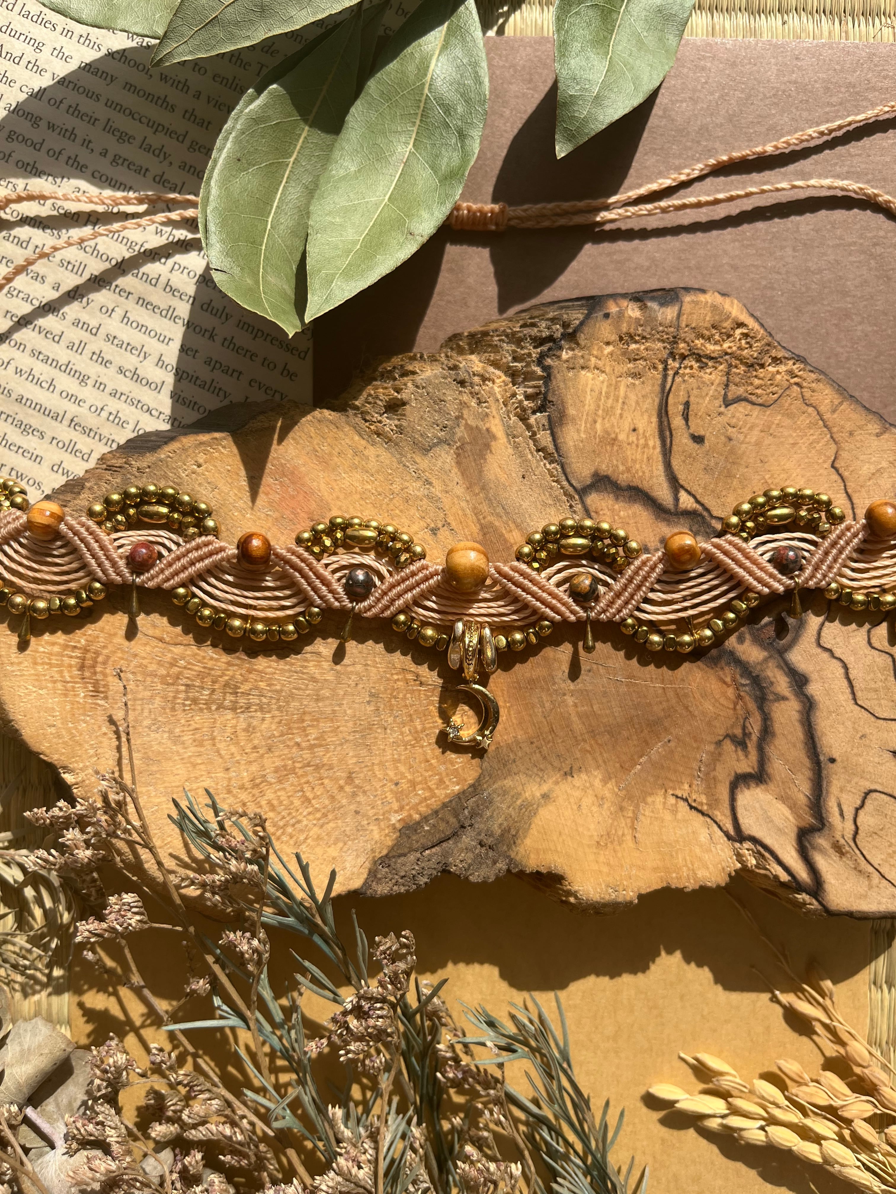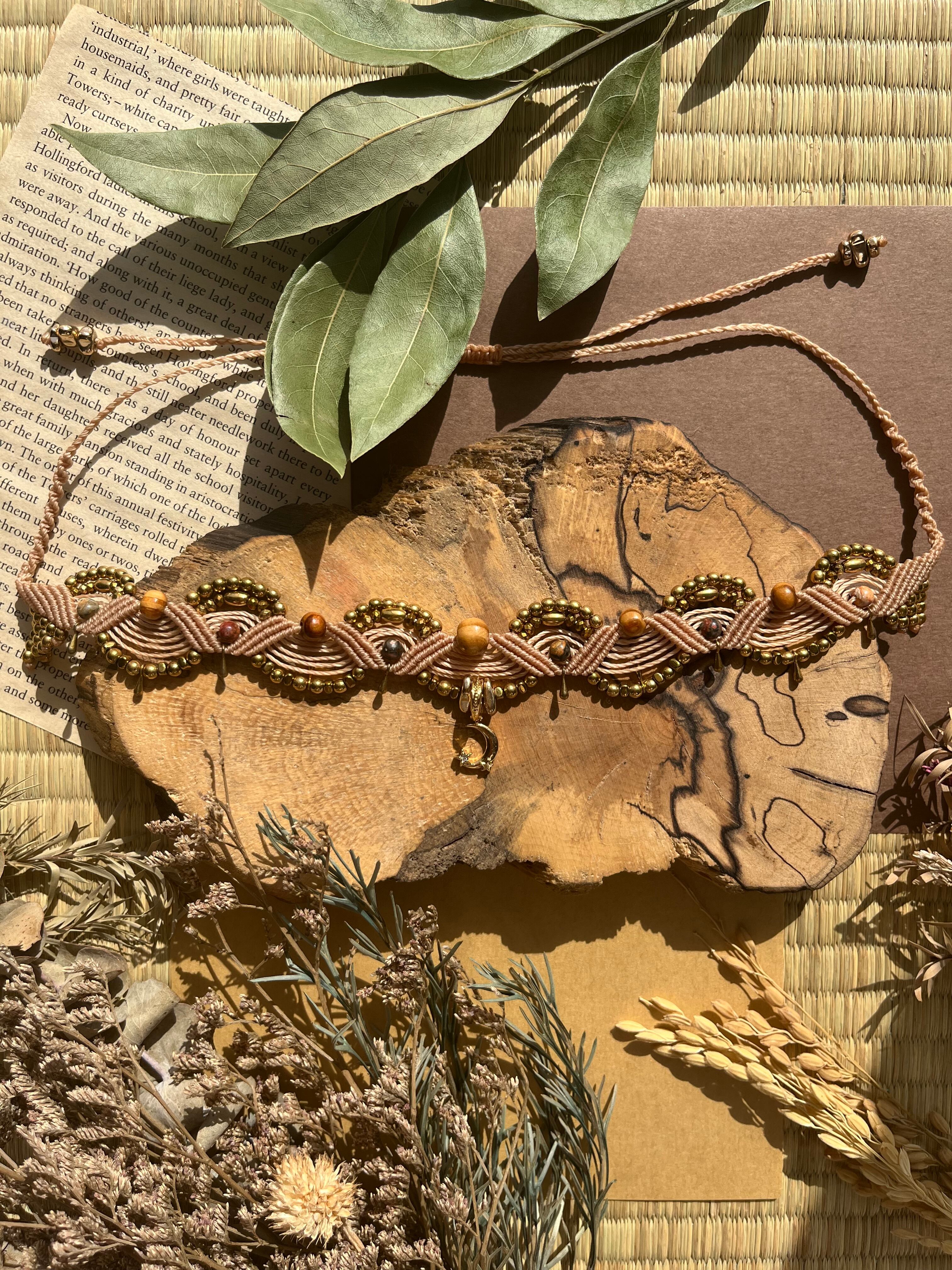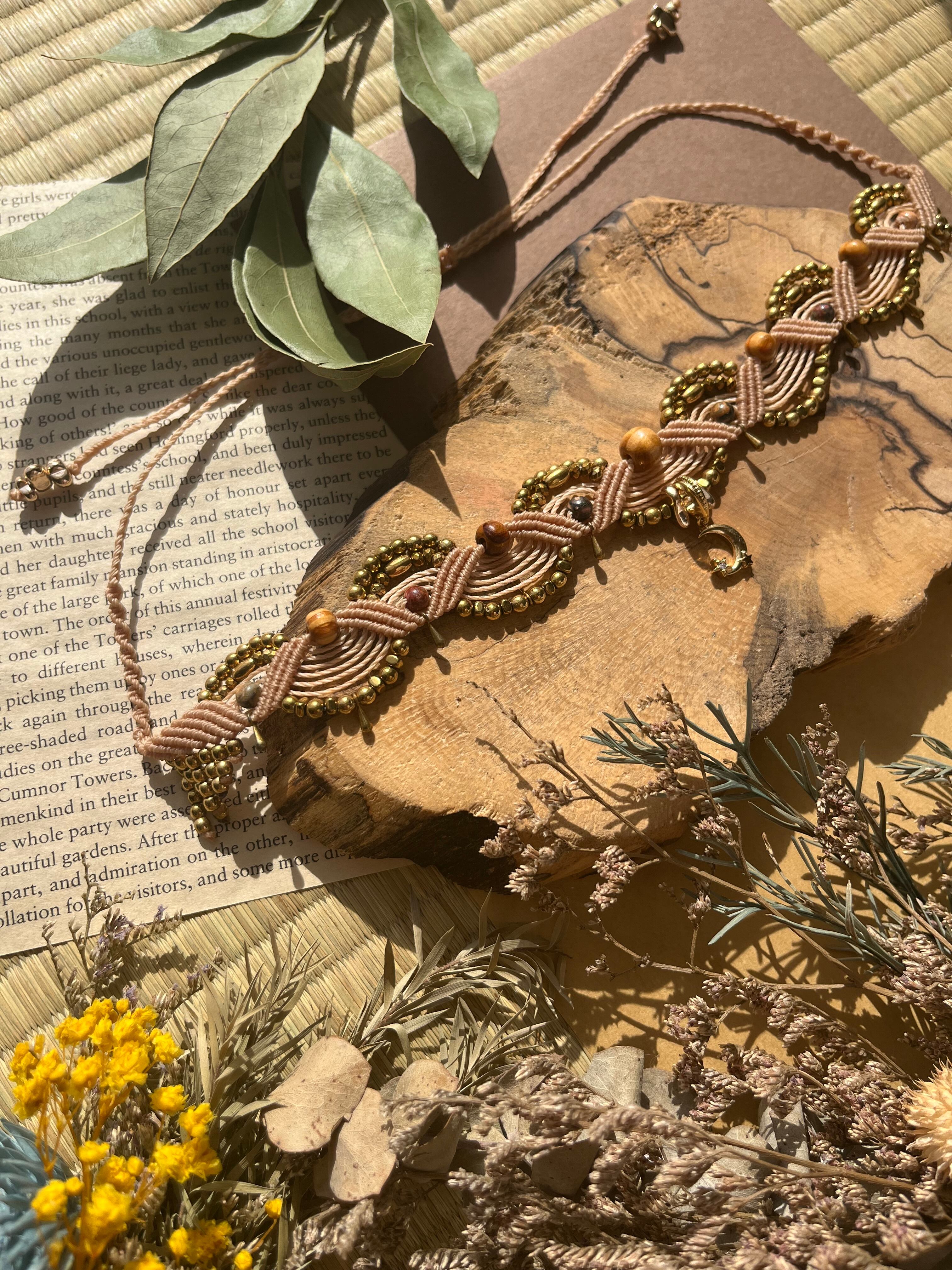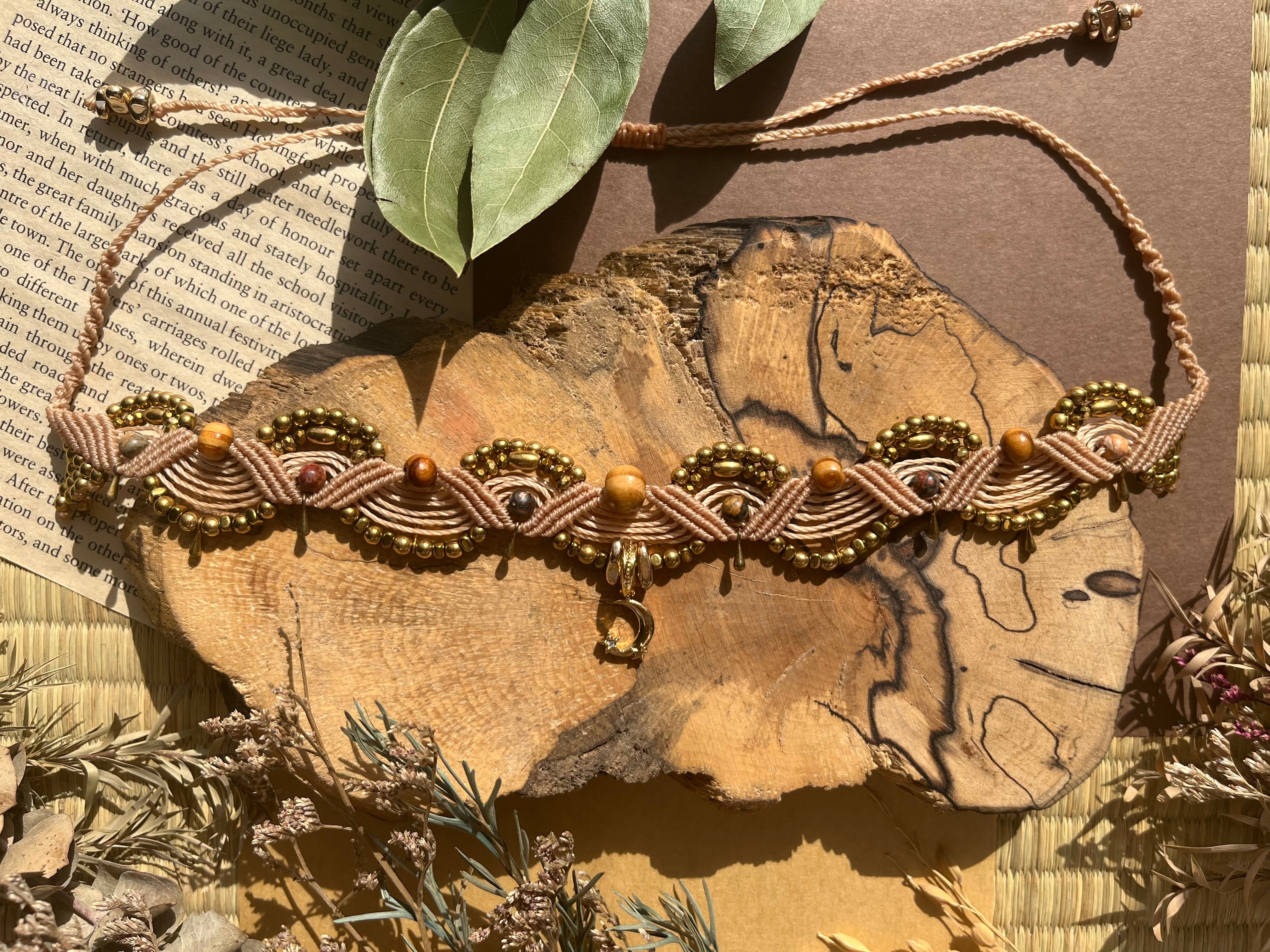 "このチョーカーは、美しい青海波模様のモチーフを持つ、魅力的なmoonトップとヘマタイト、松を組み合わせたエレガントなアイテムです。青海波模様の優雅さが、あなたのスタイルに特別な洗練をもたらし、様々なシーンでの活躍が期待できます!"