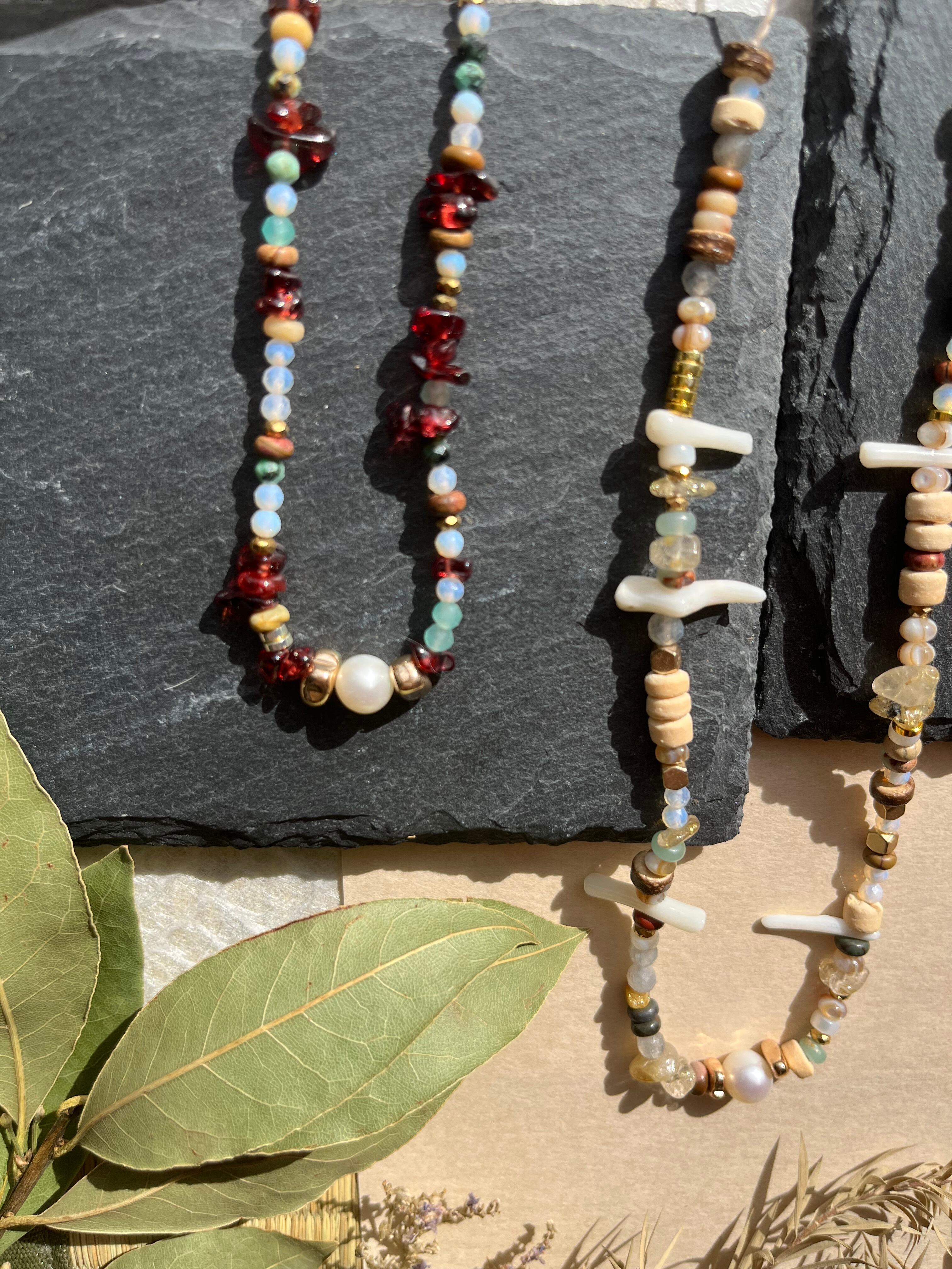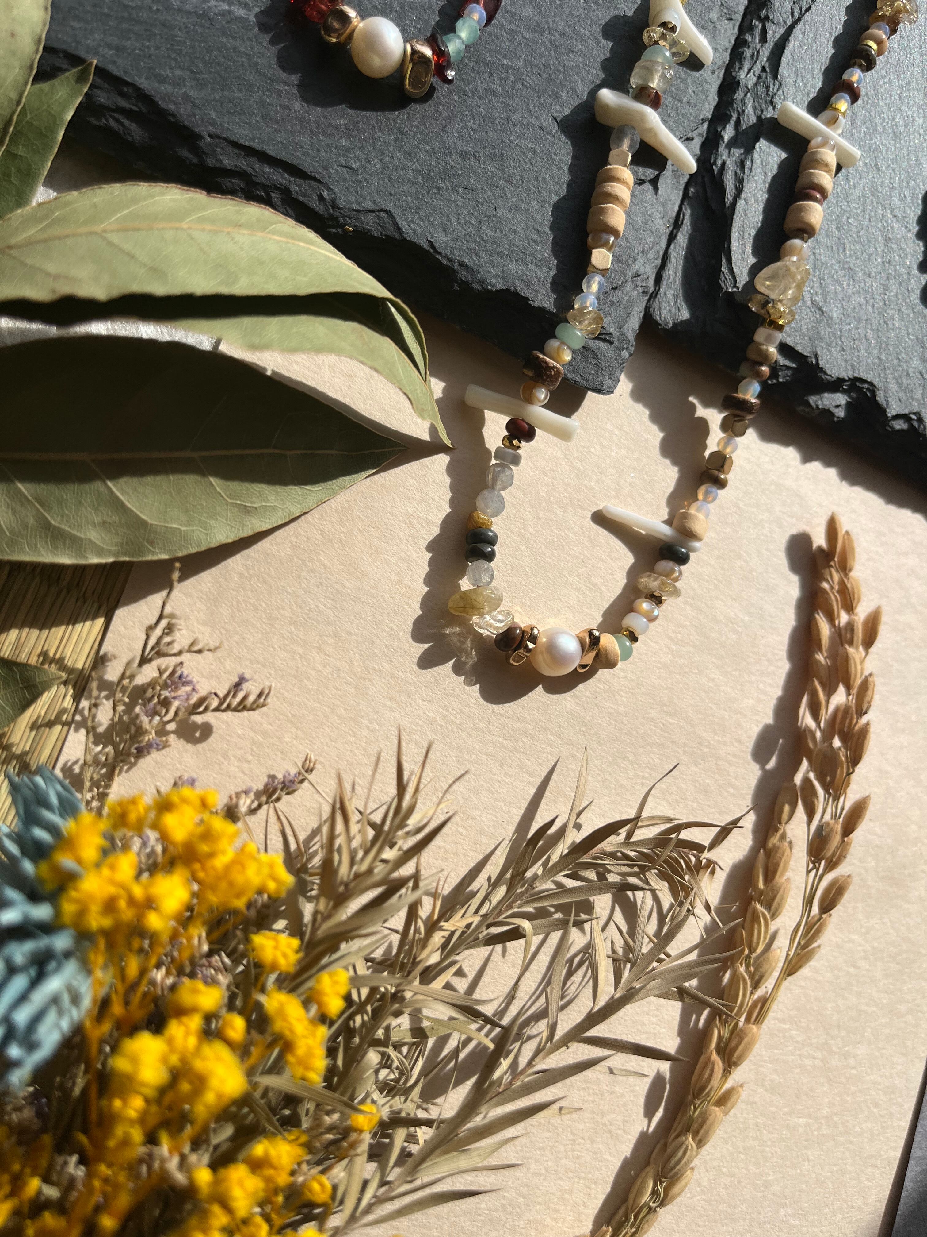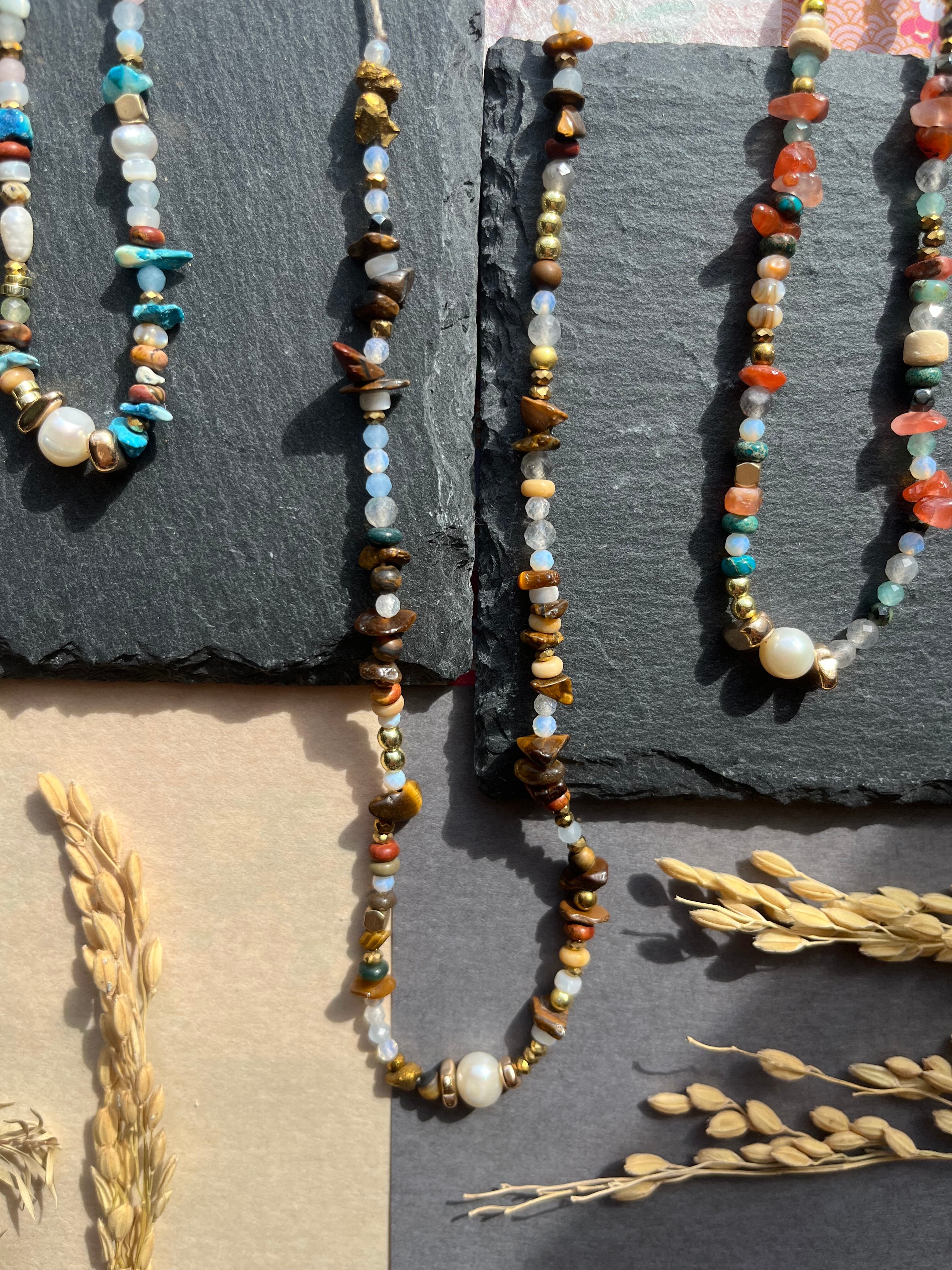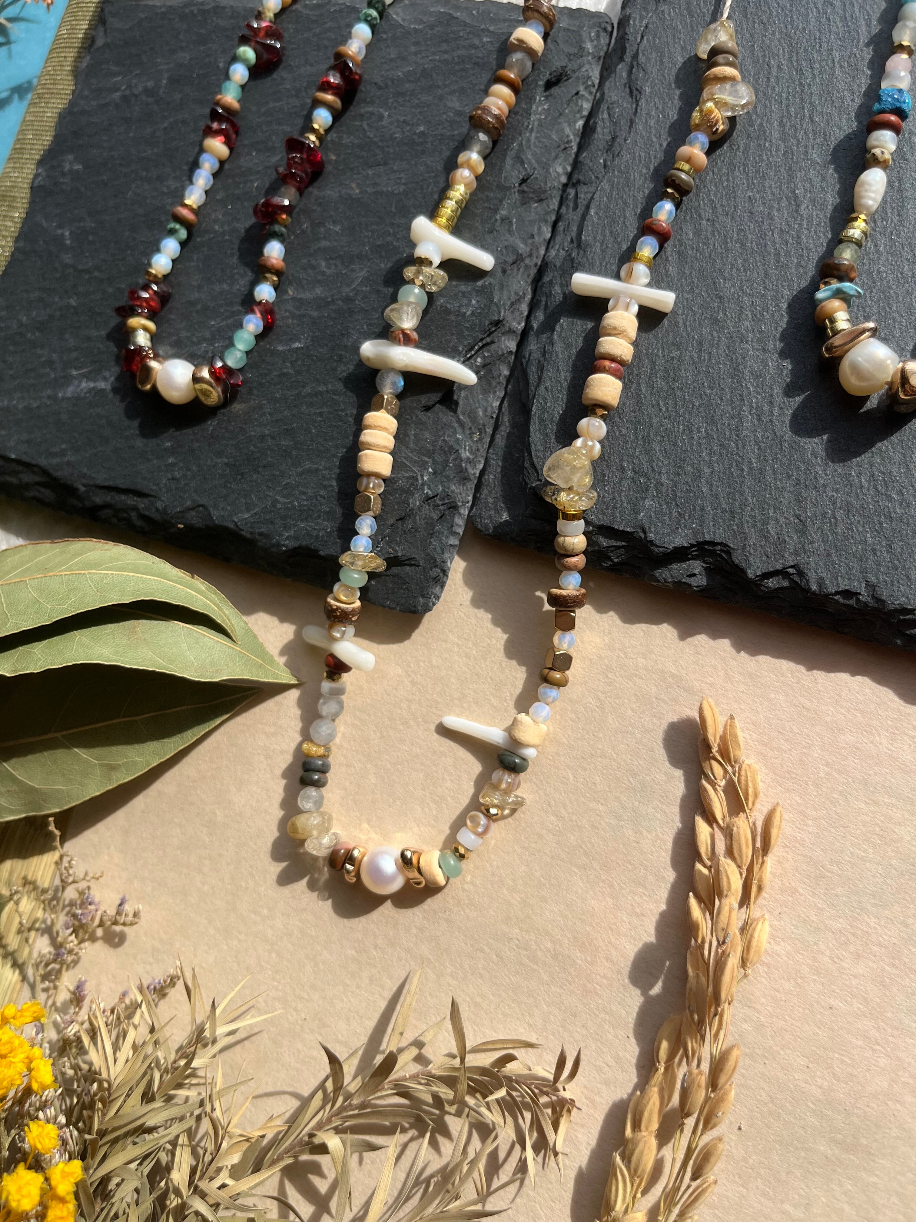 多様なシーンでご利用できるこのネックレスは、丁寧に手作業で仕上げられた逸品です。淡水パールの上品な輝きと、豊富な天然石の色合いが際立ち、あなたの個性を一層引き立てることでしょう。