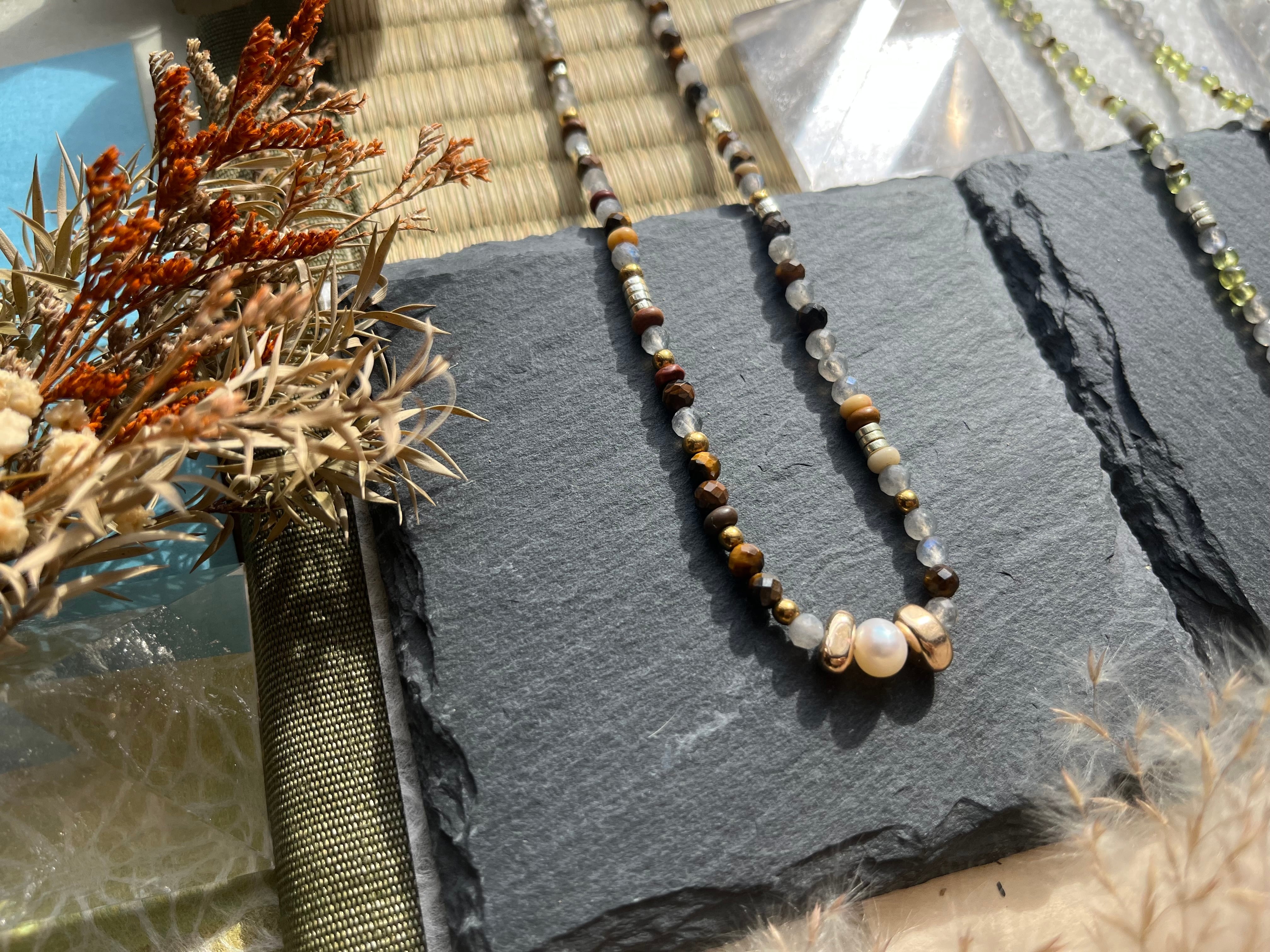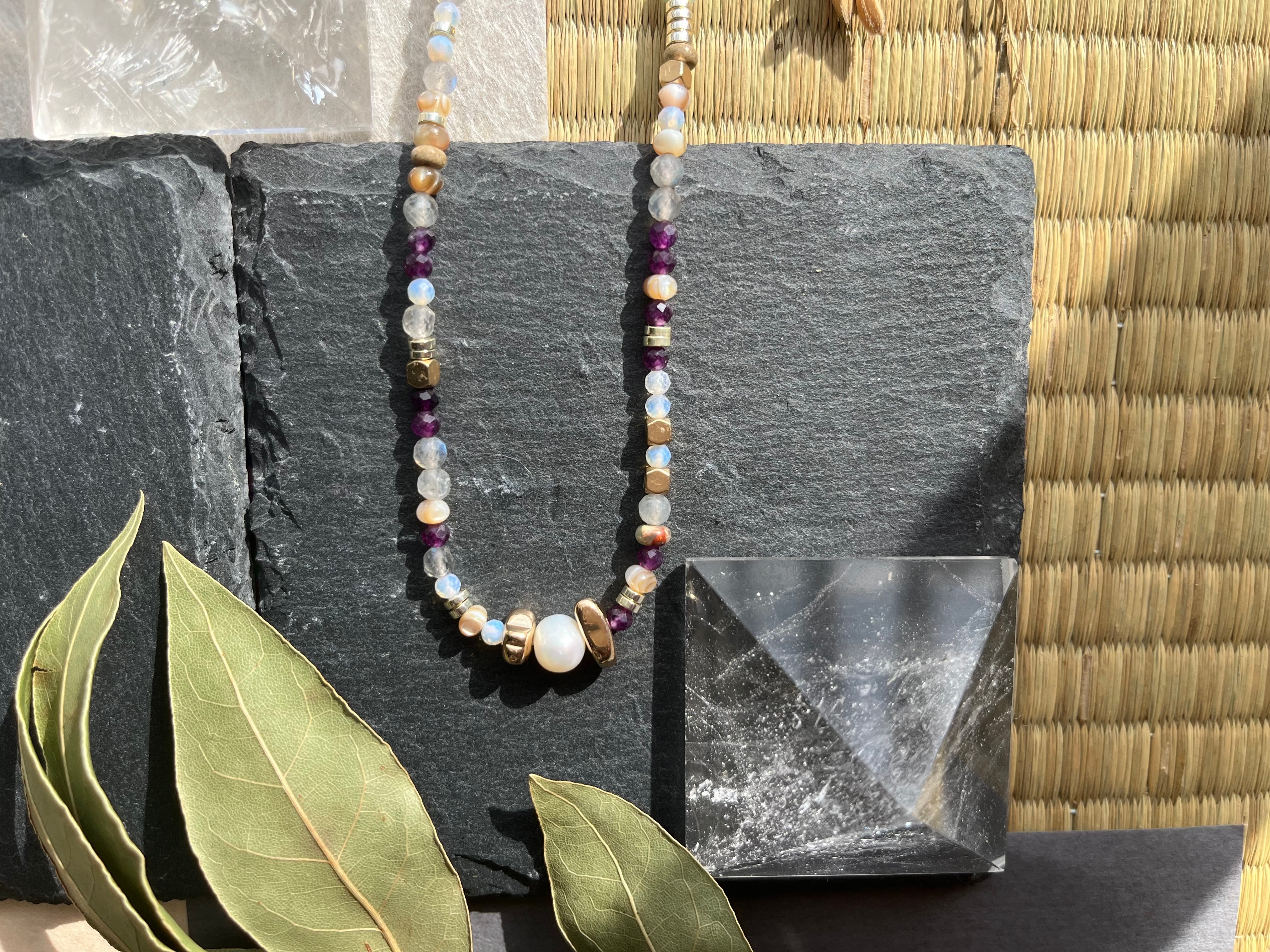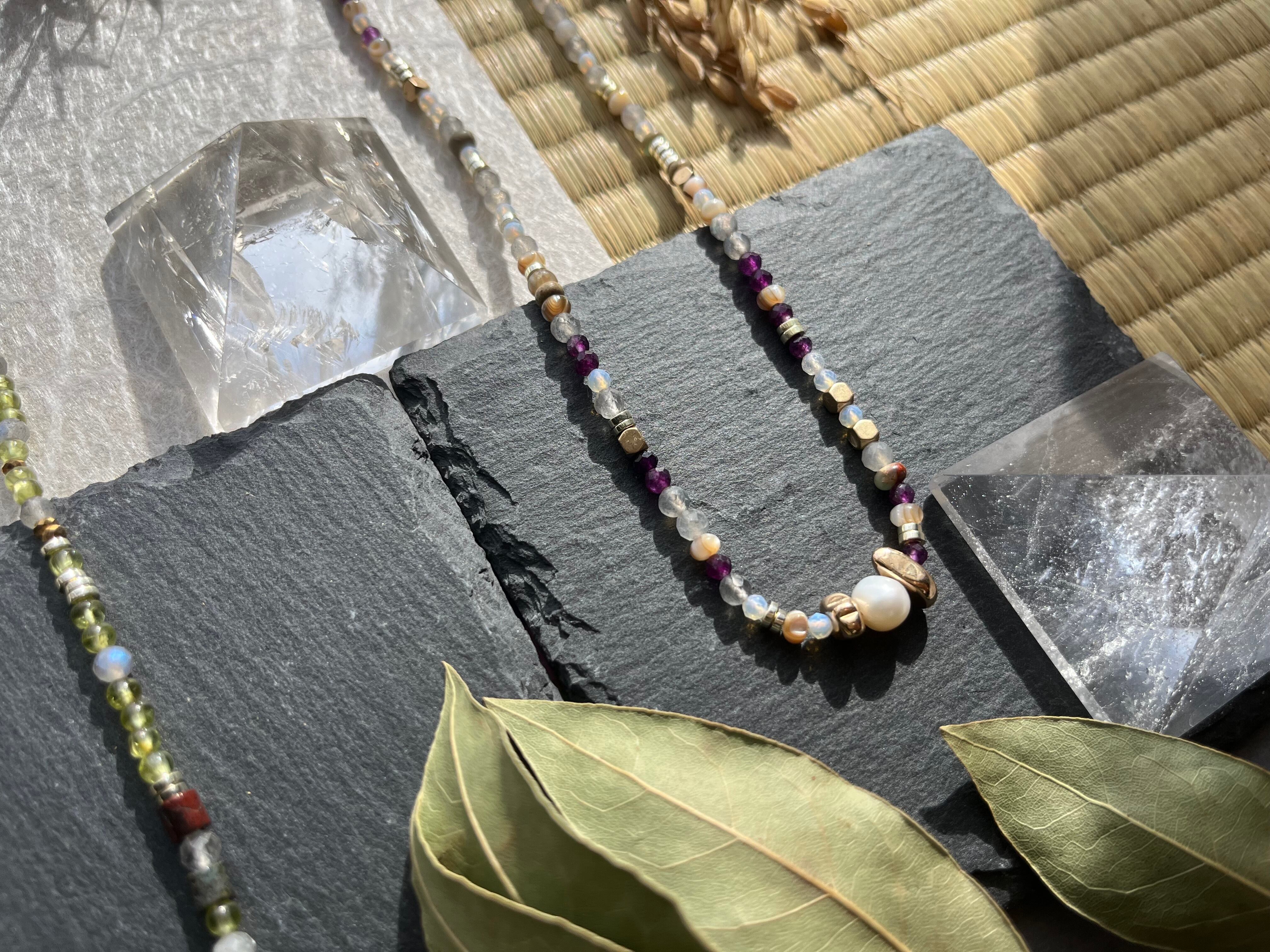多様なシーンでお楽しみいただけるこのネックレスは、丁寧に手作業で仕上げられた逸品です。淡水パールの美しい光沢と、天然石の多彩な色合いが際立ち、あなたの個性を一層引き立てることができるでしょう。