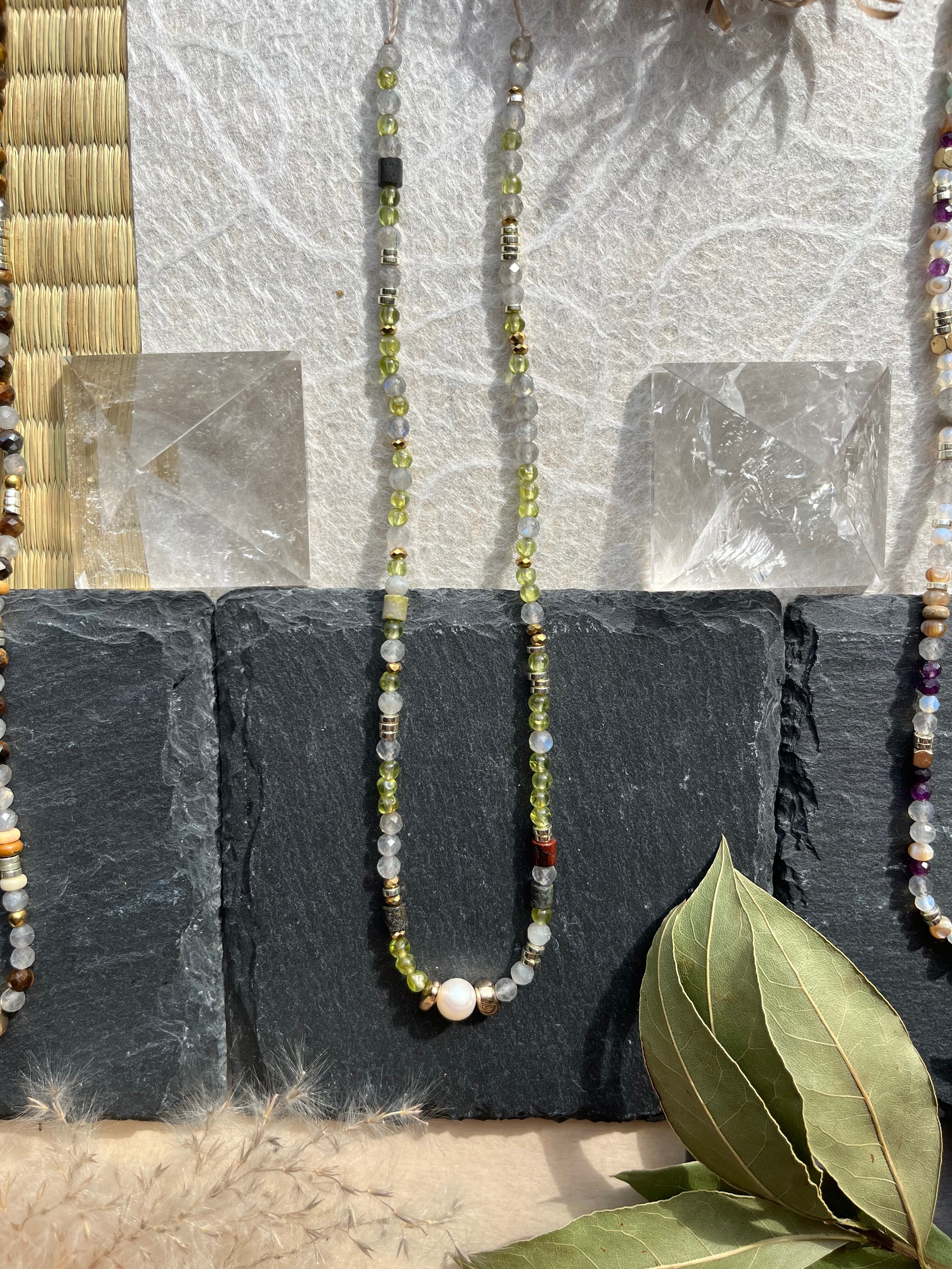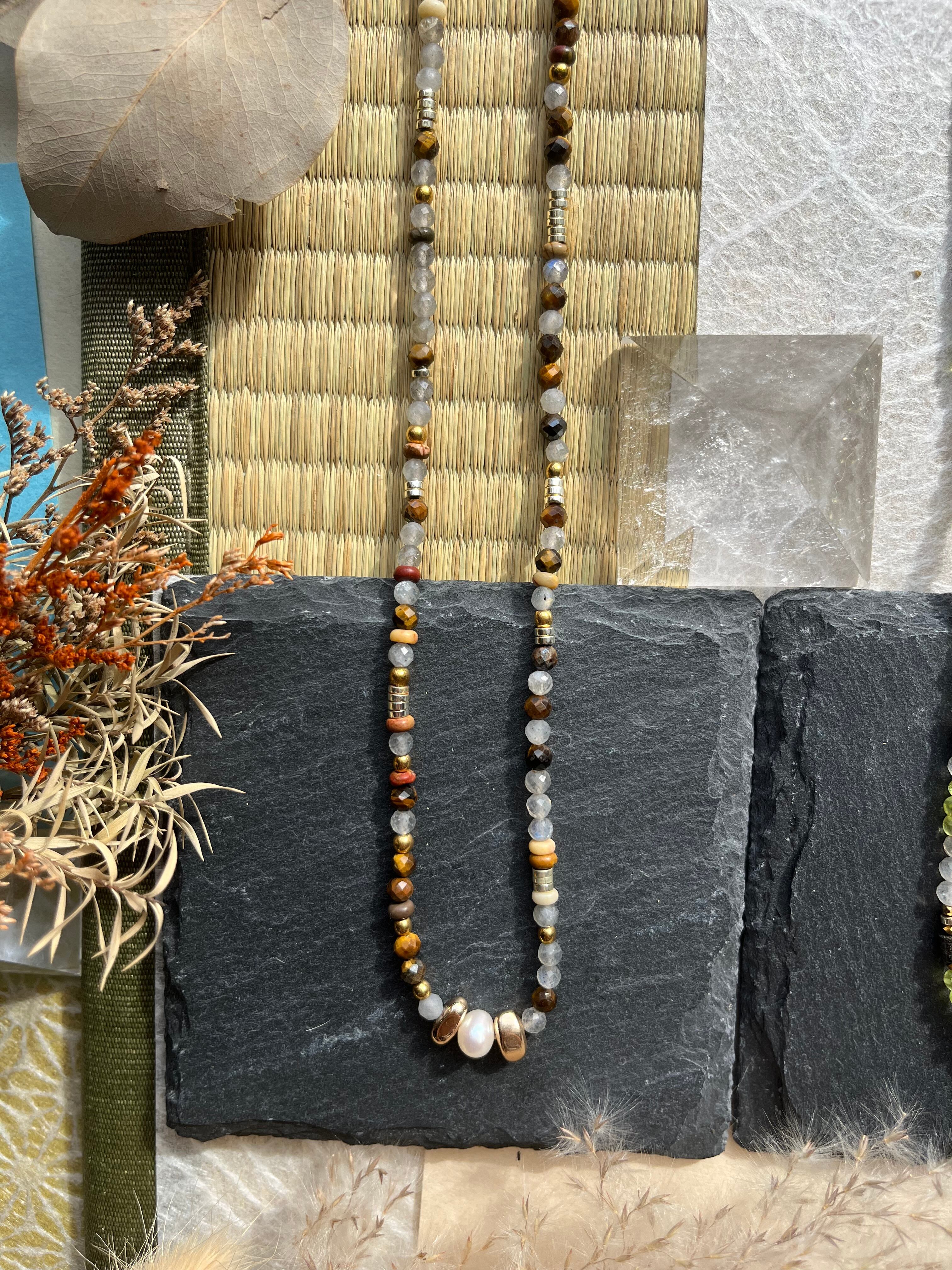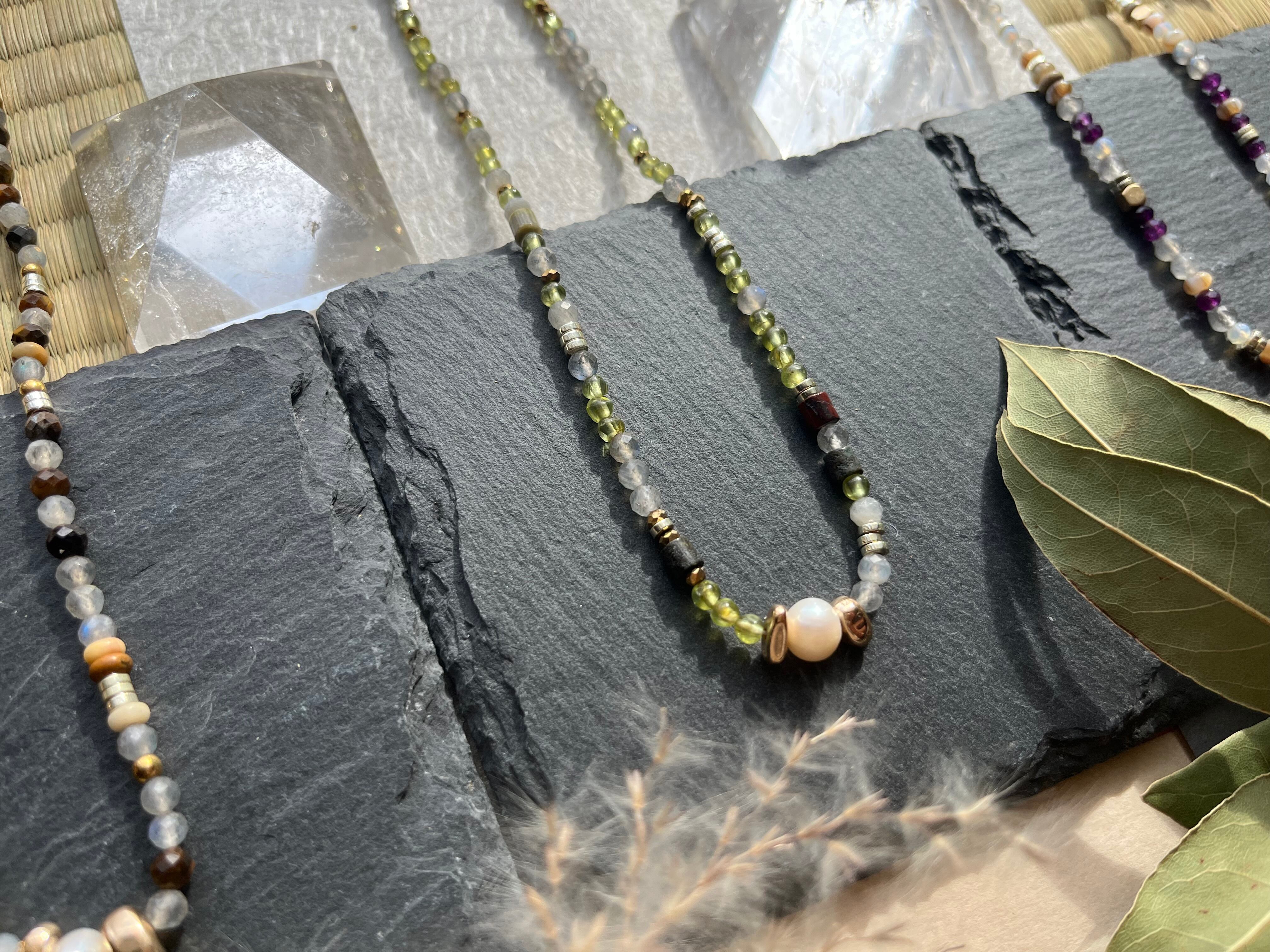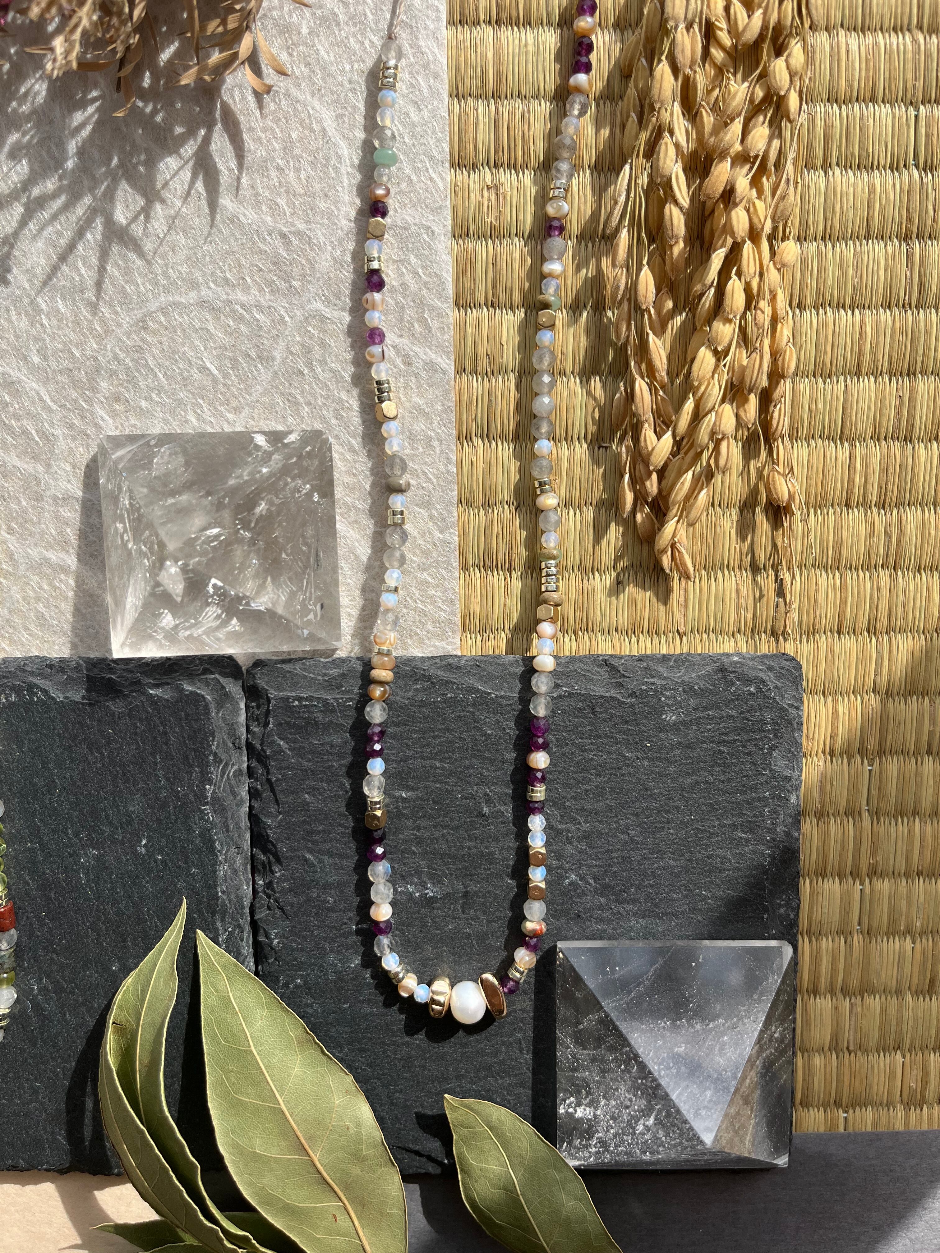 多様なシーンでお楽しみいただけるこのネックレスは、丁寧に手作業で仕上げられた逸品です。淡水パールの美しい光沢と、天然石の多彩な色合いが際立ち、あなたの個性を一層引き立てることができるでしょう。