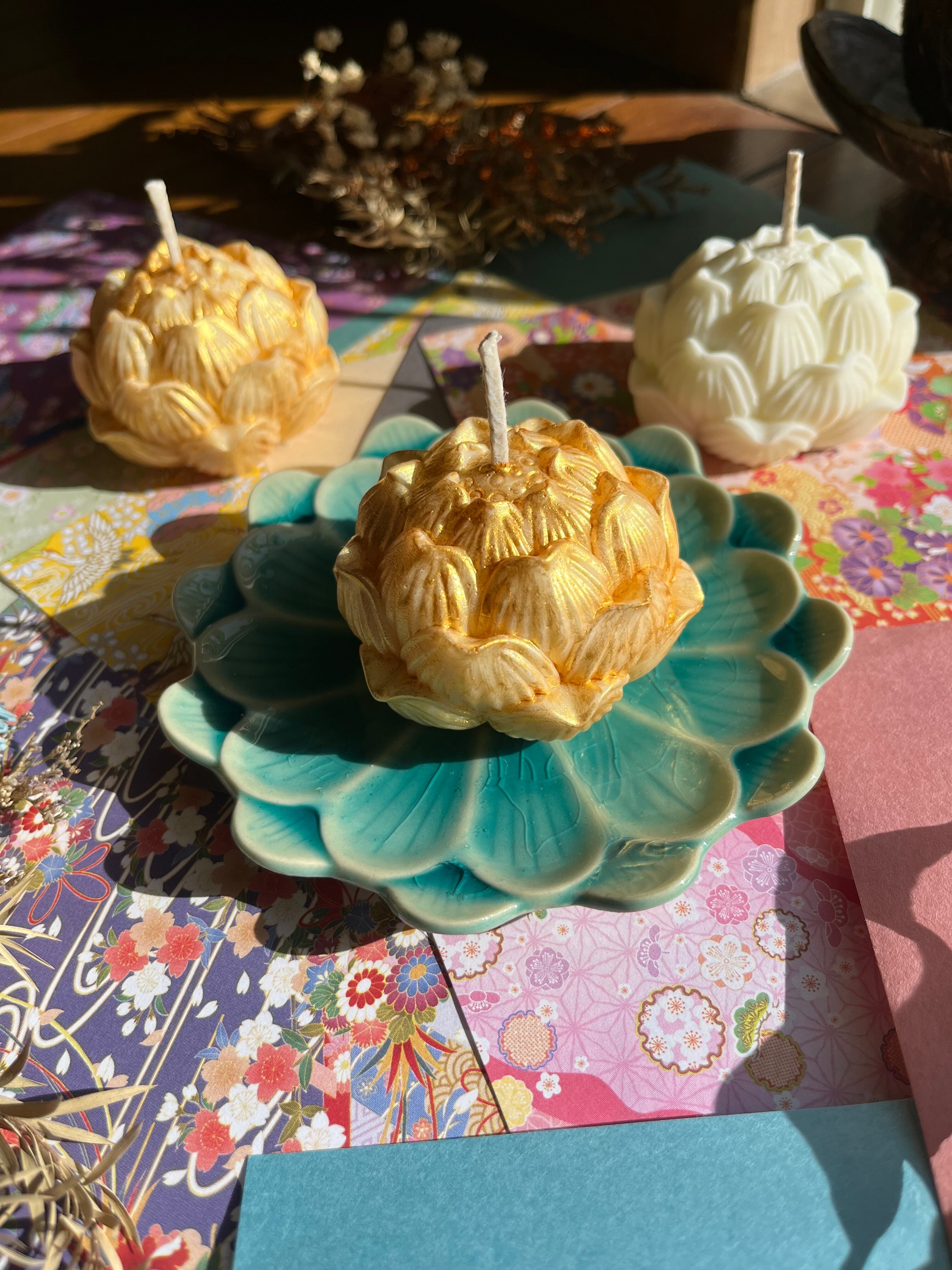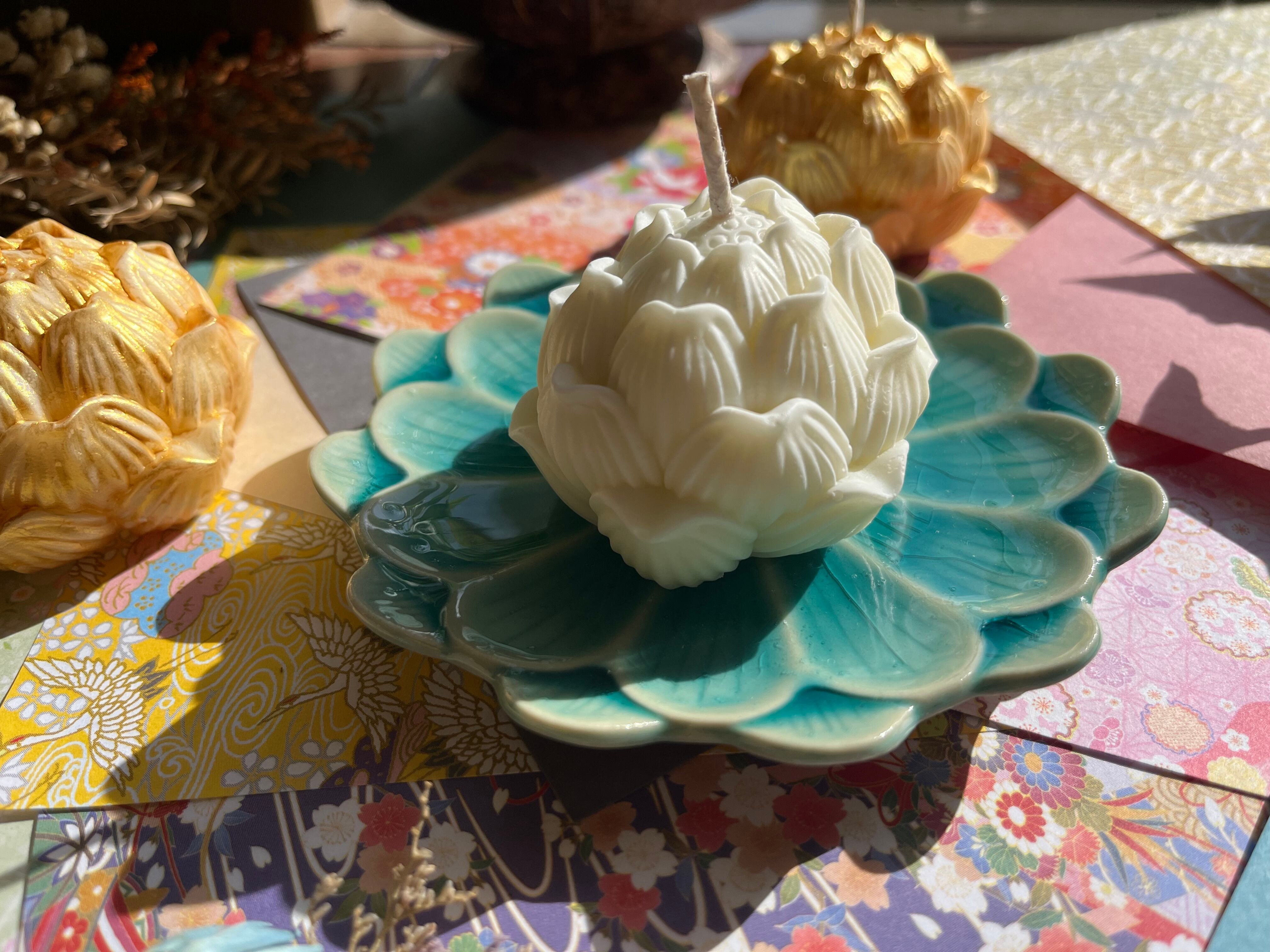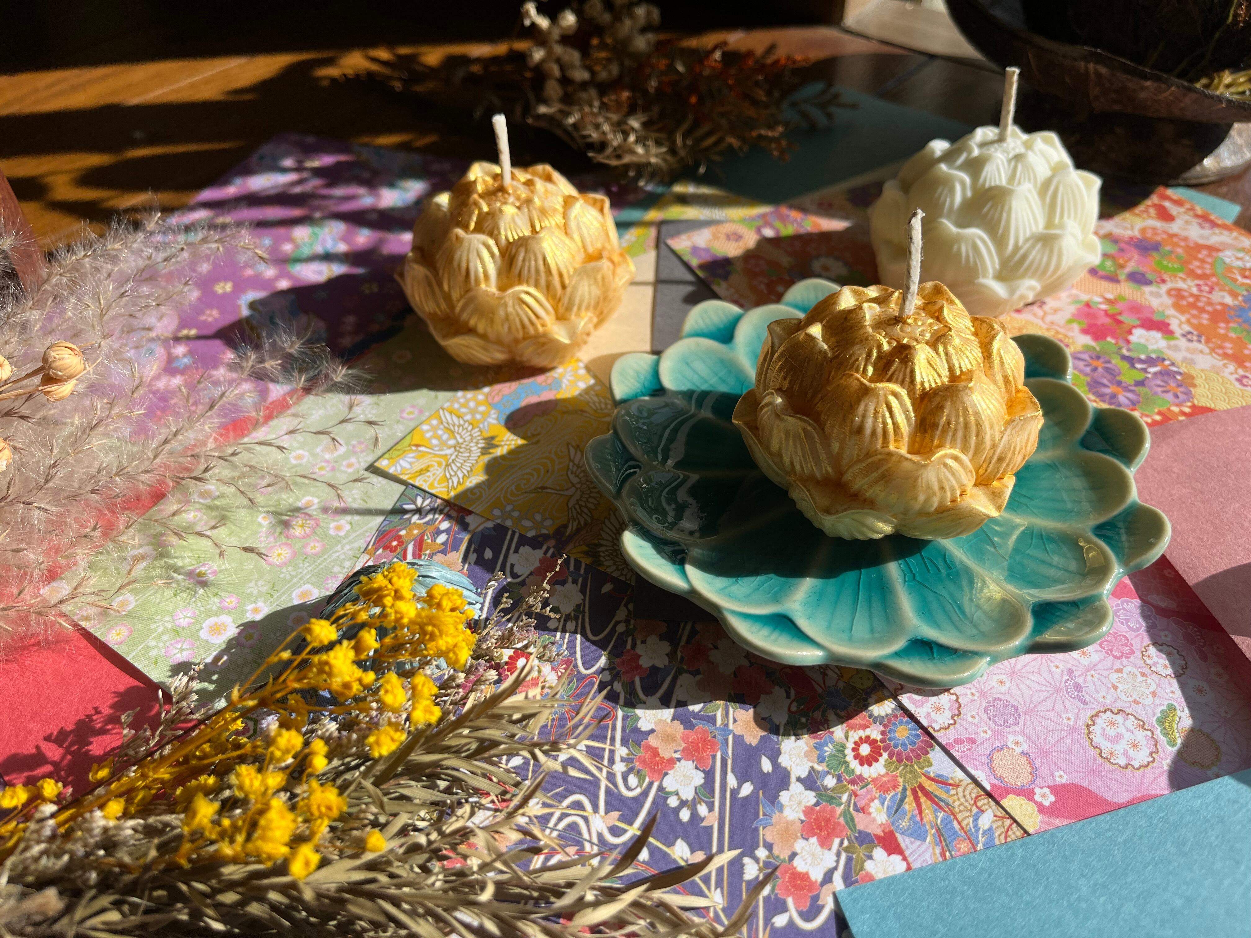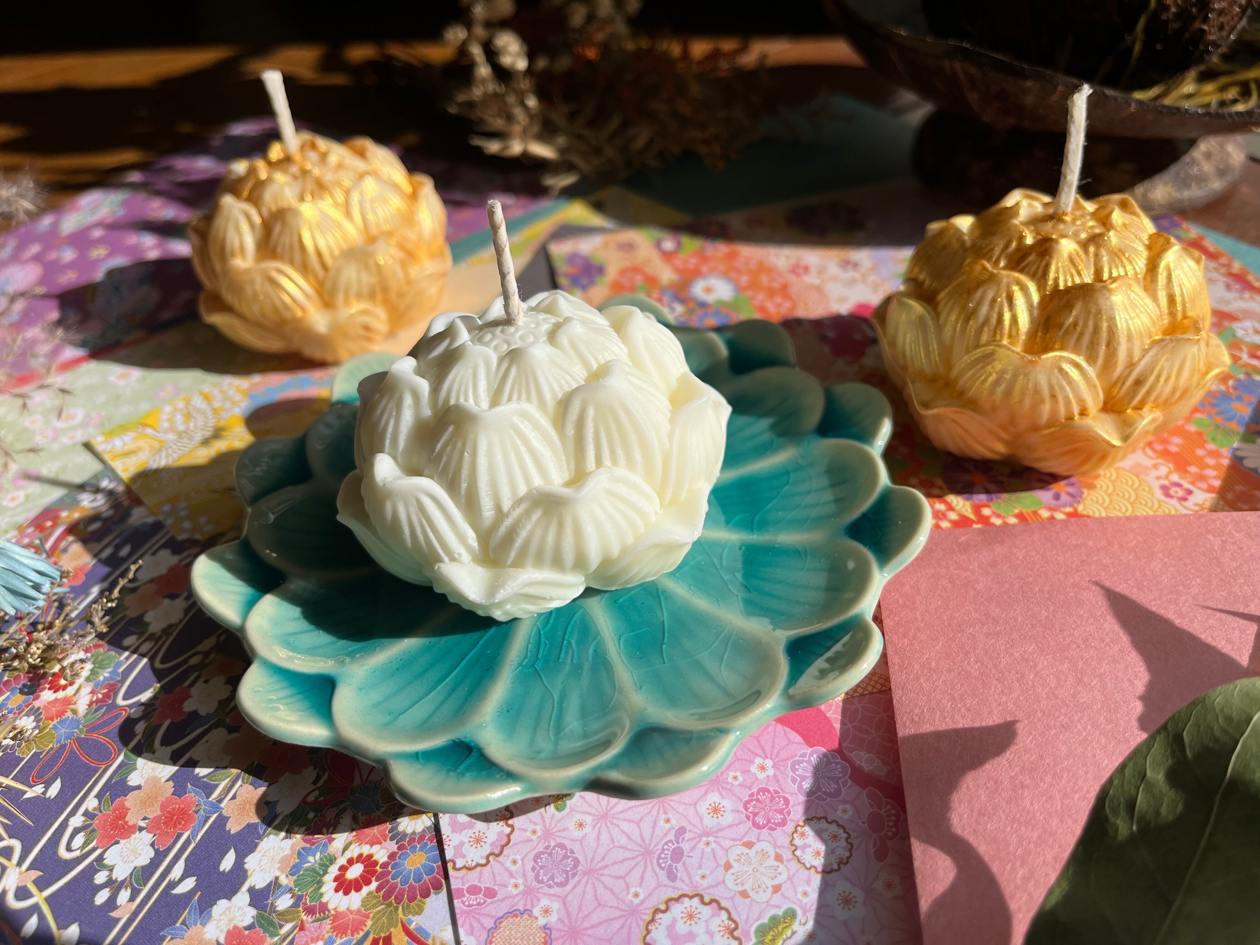 ゴールドタイプとノーマルタイプの2つの蓮デザインが、異なる印象を与えつつ、どちらも優雅さを演出します。キャンドルの優しい光と香りが、心を和ませる特別な空間を作り出します。