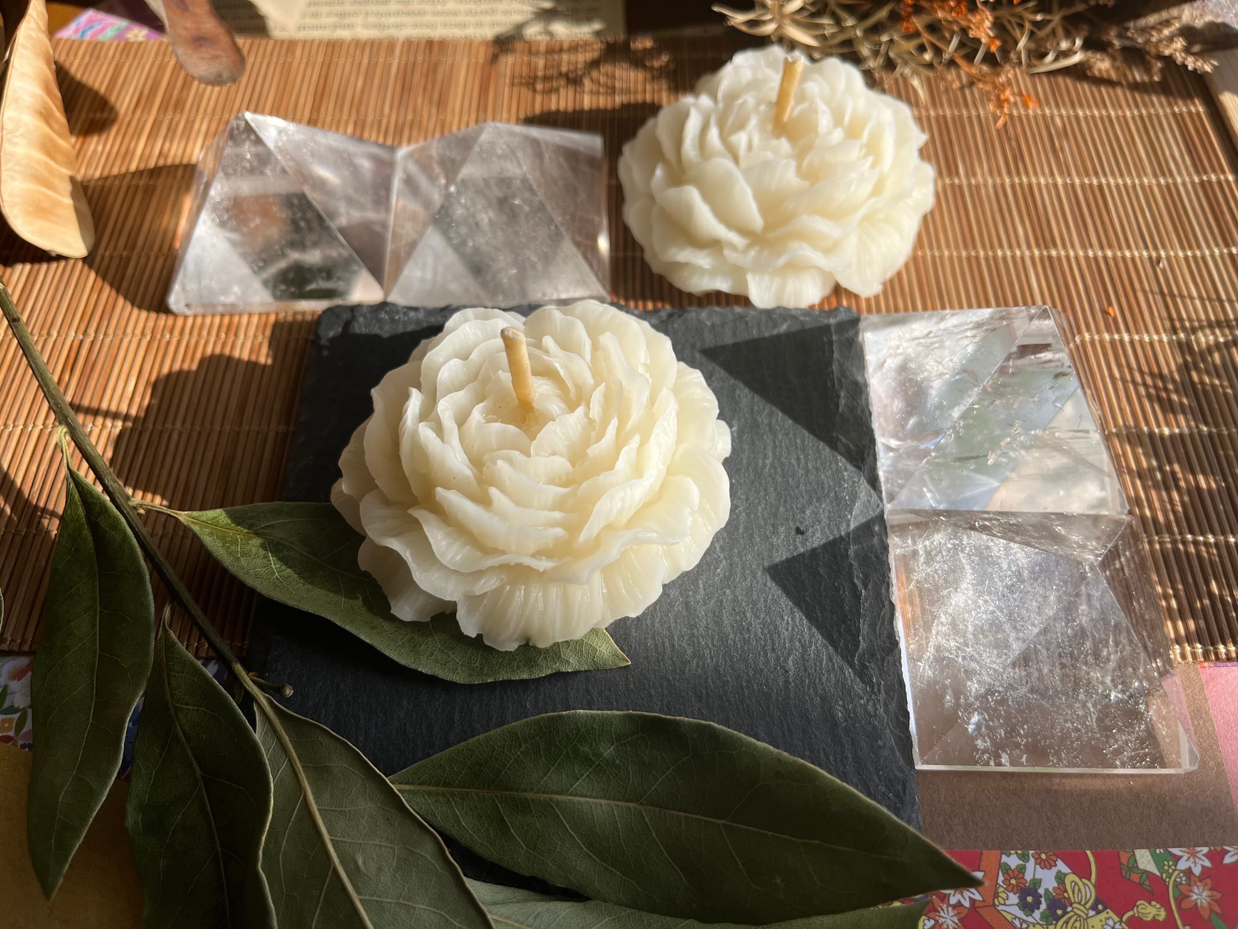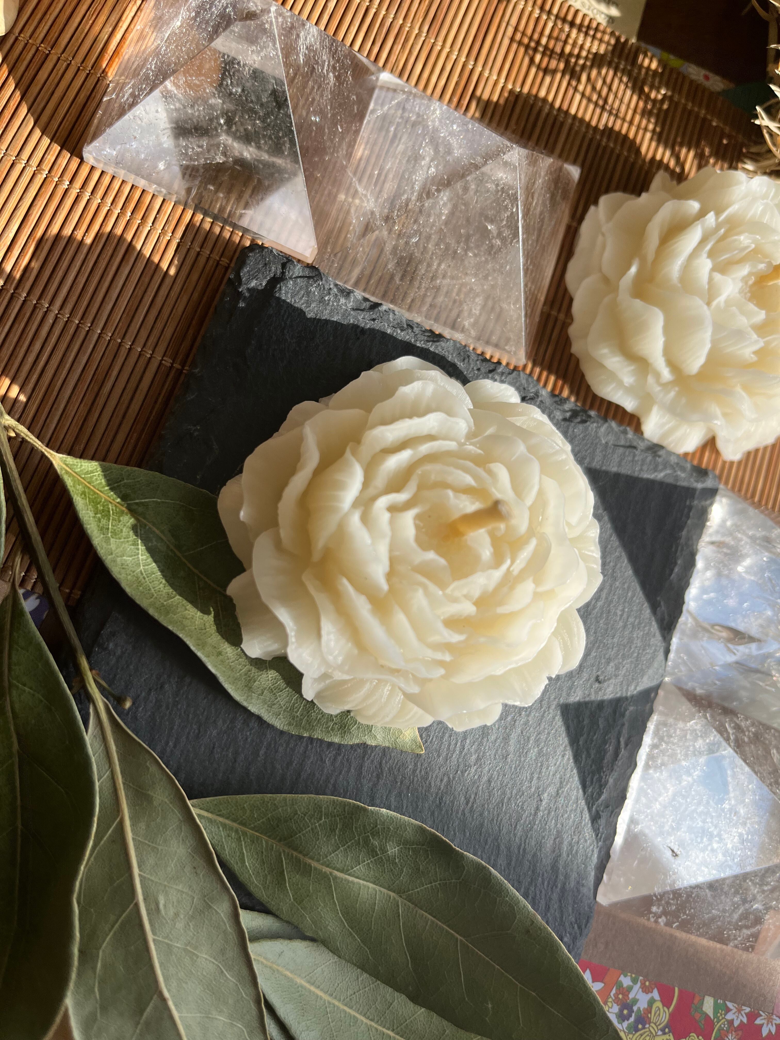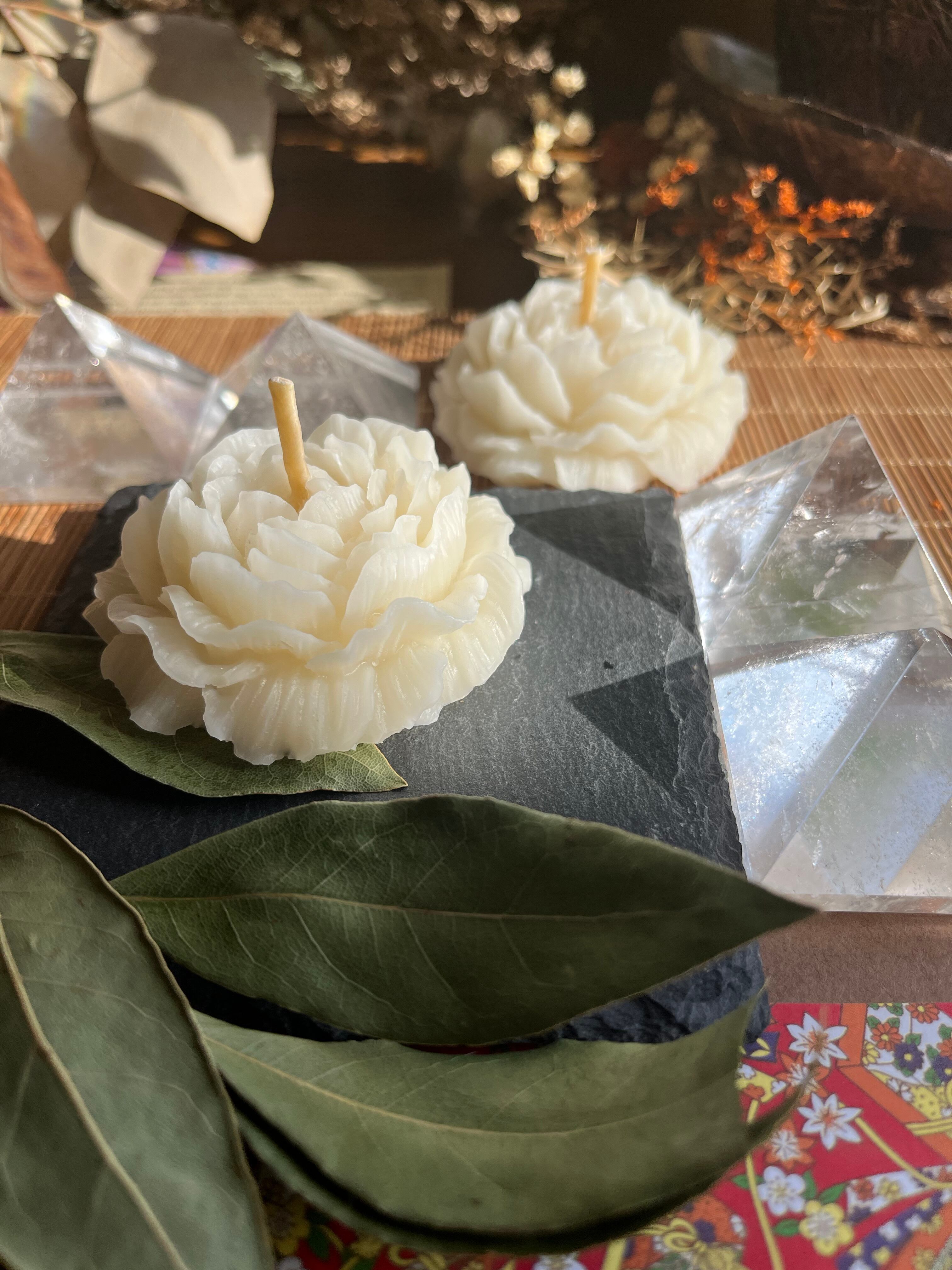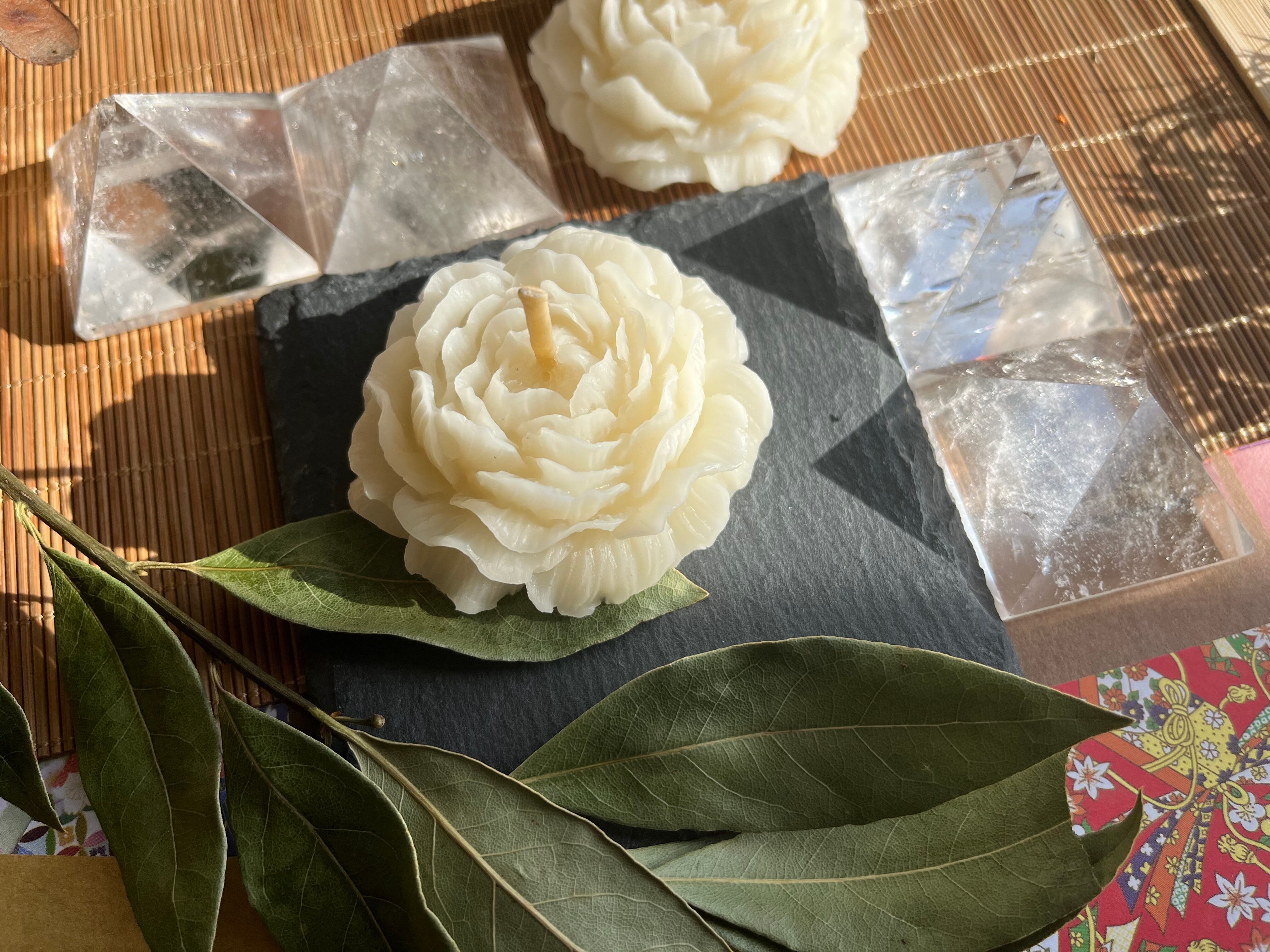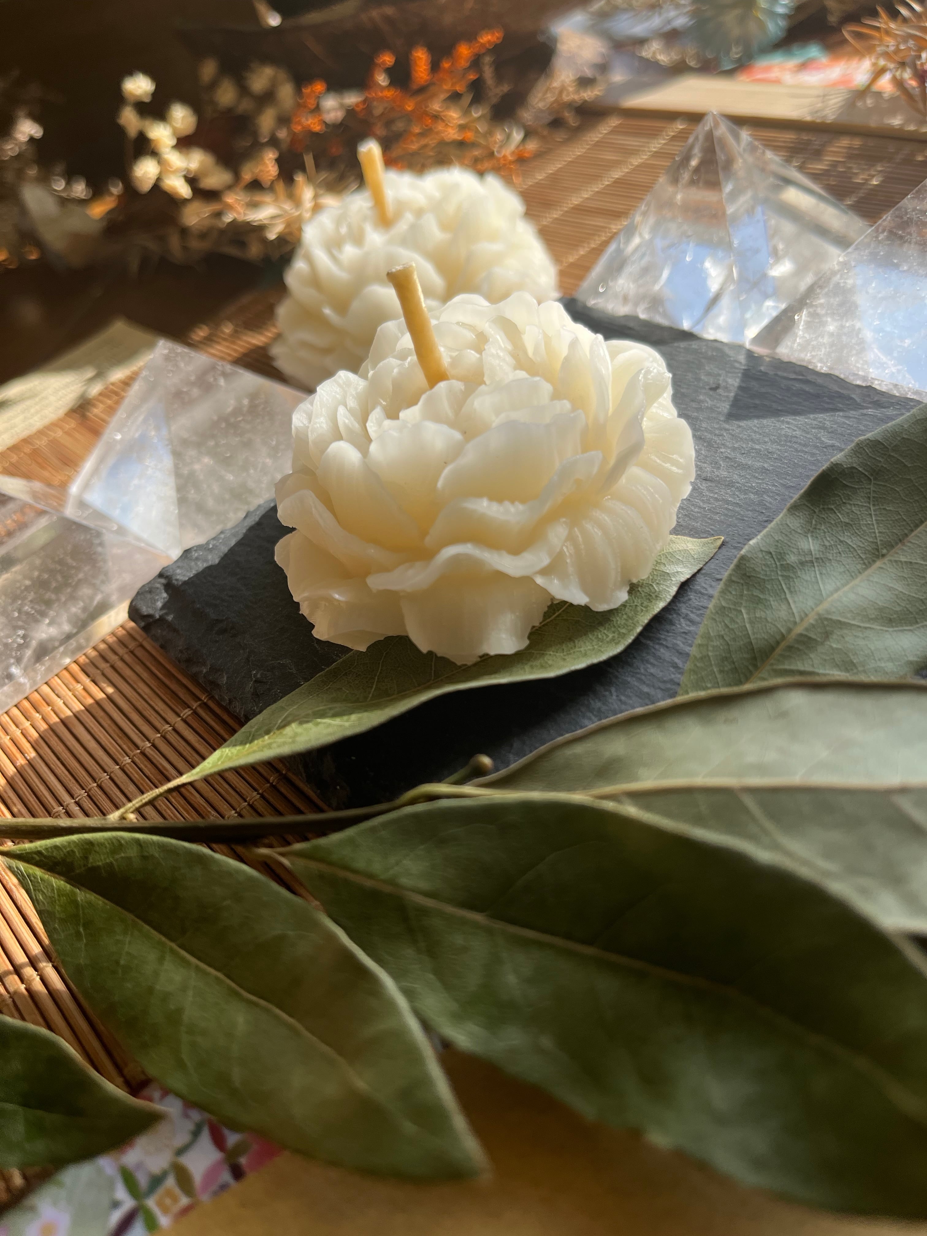 "このホワイト蜜蝋キャンドルは、エレガントな牡丹のデザインが特徴のアイテムです。優雅な香りと美しいビジュアルが調和し、あなたの空間に特別な癒しをもたらします!"