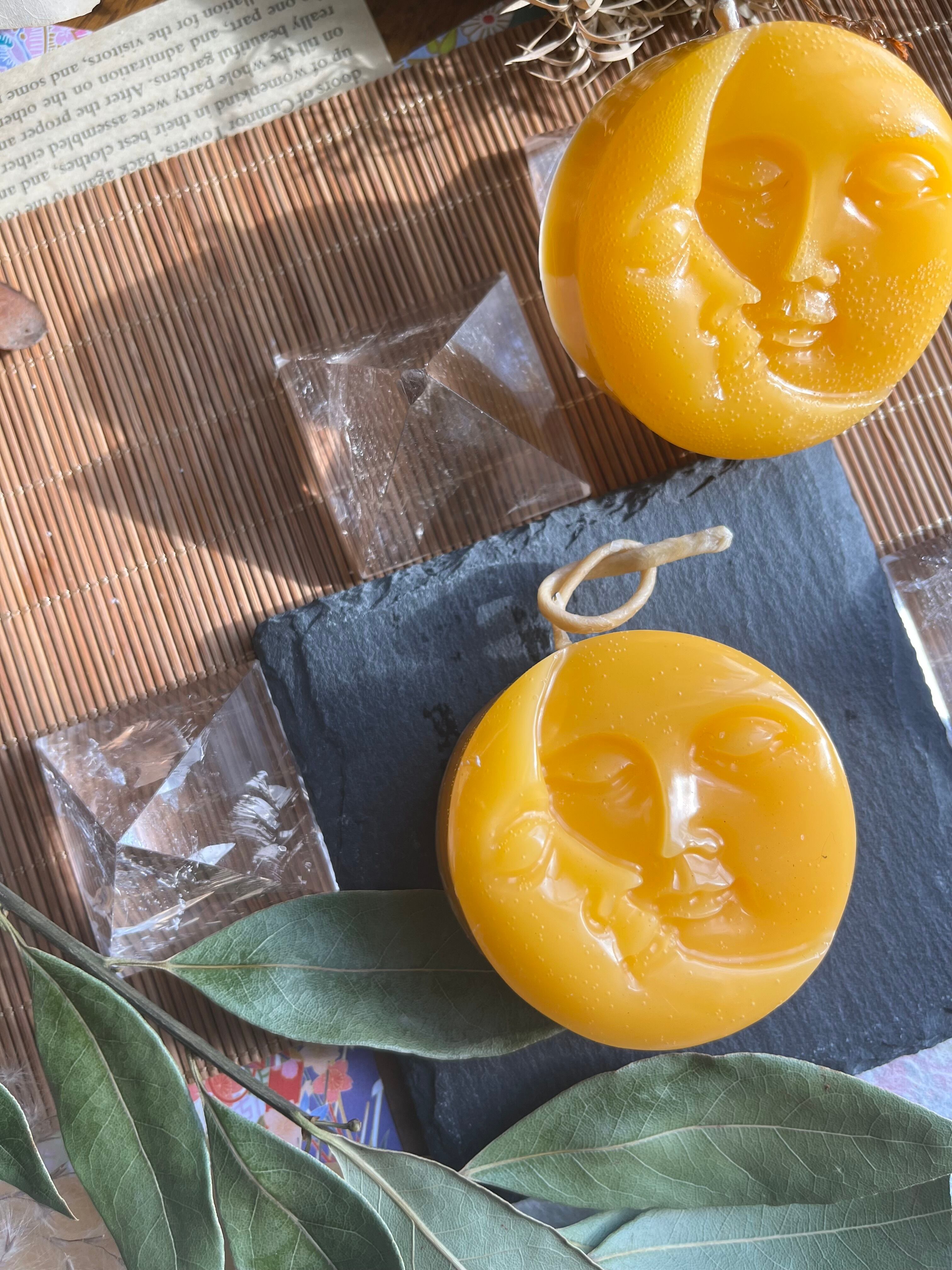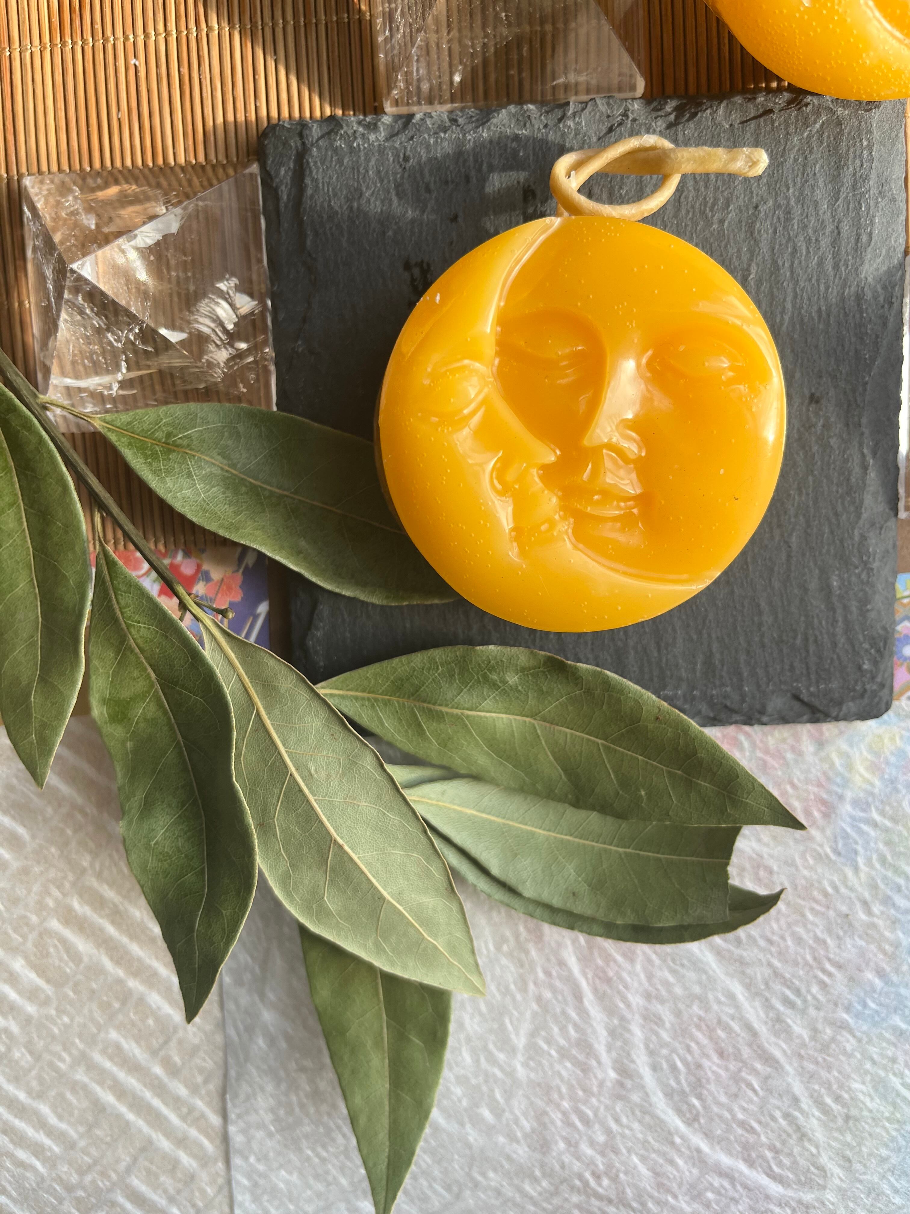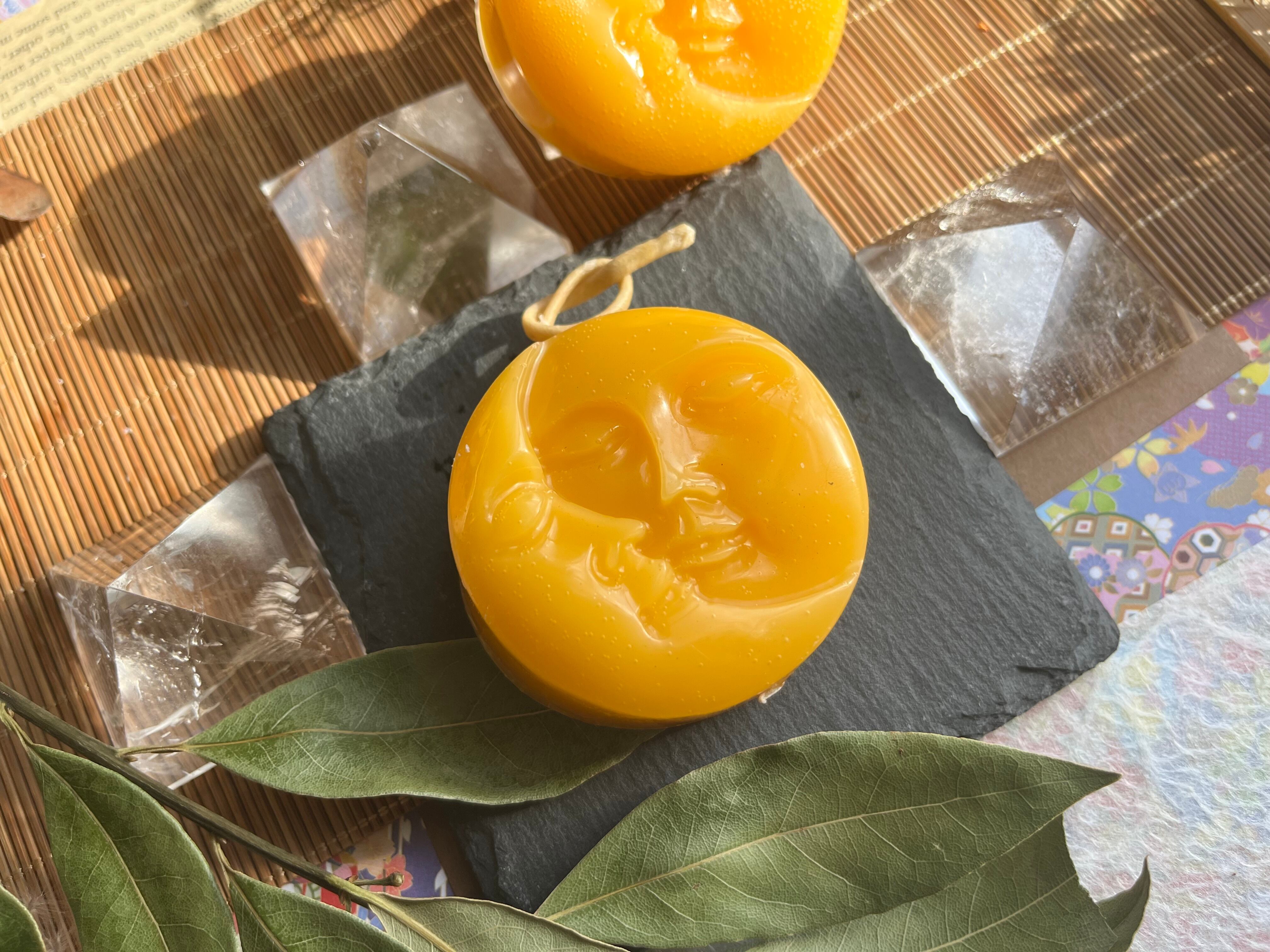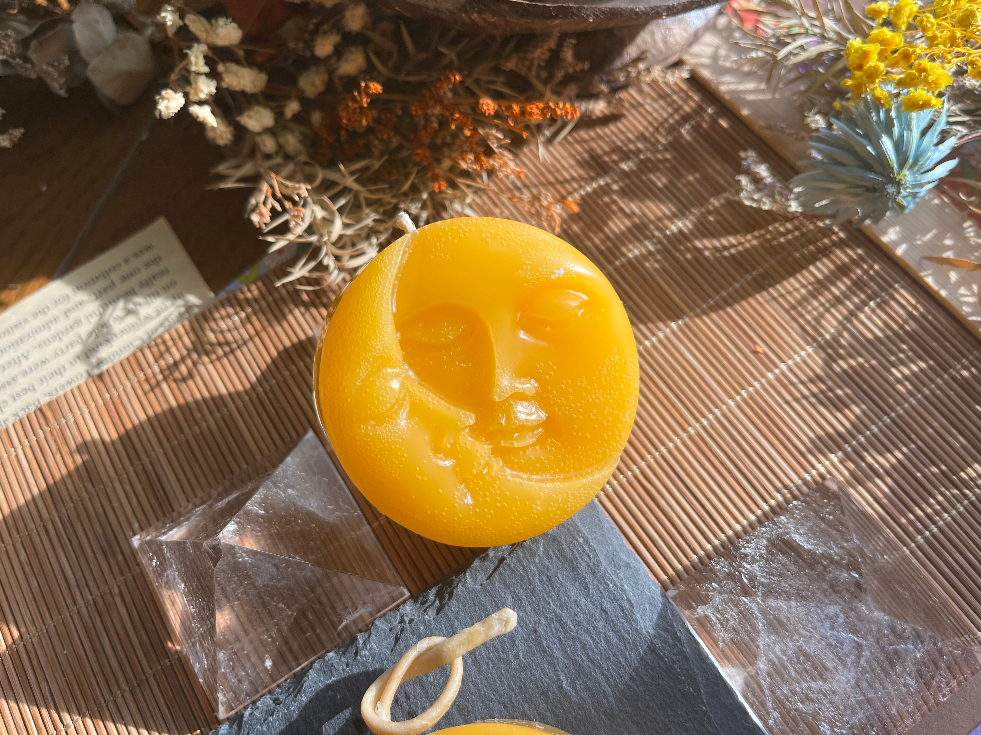 "この月と太陽*yellow蜜蝋キャンドルは、自然の美と神秘をテーマにしたデザインが特徴のアイテムです。優しい光と温かい香りが調和し、あなたの空間に特別な癒しをもたらします!"