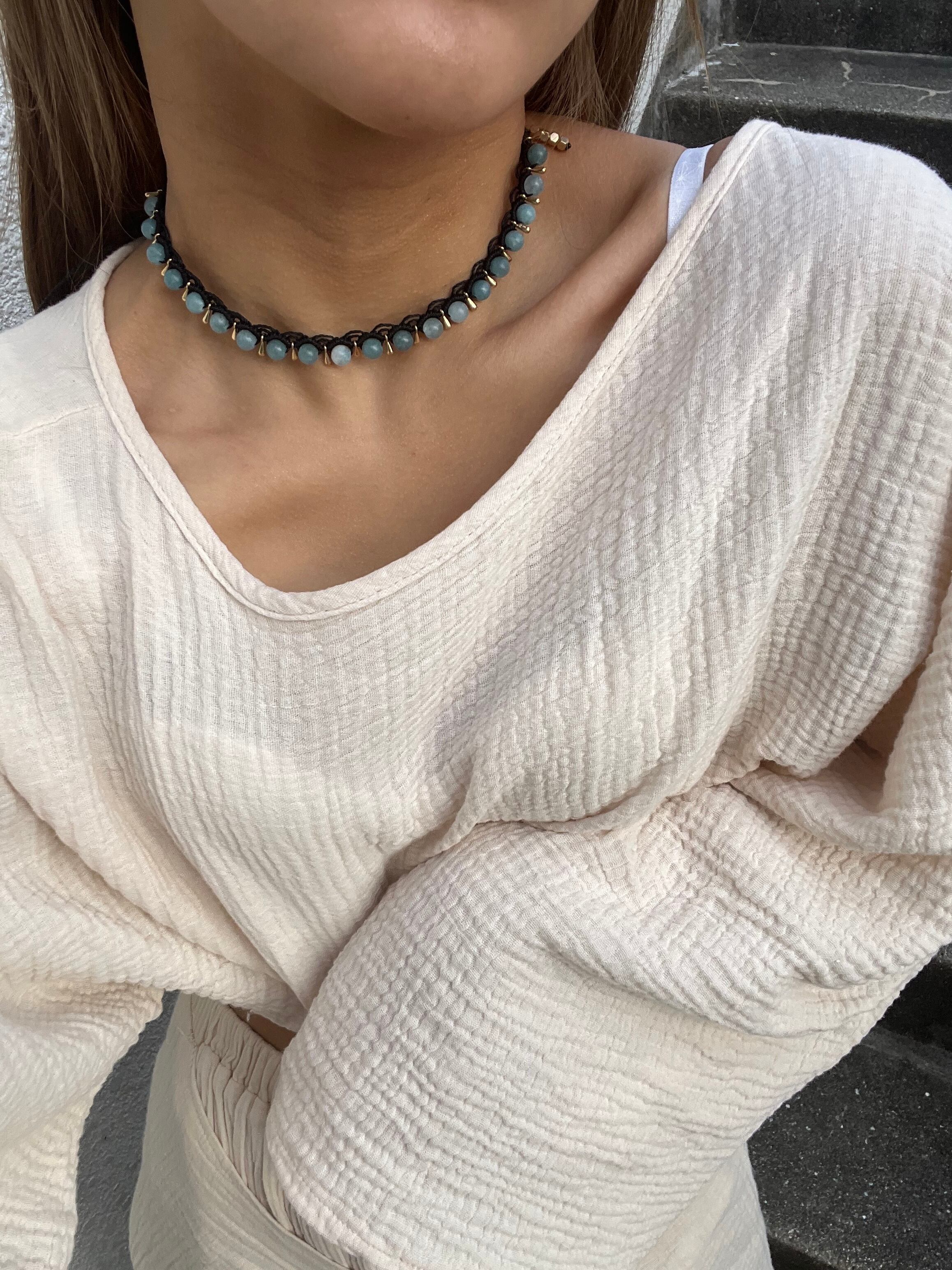 手作業で丁寧に作られたこのチョーカーは、天然素材の特性を生かしたデザインが特徴です。