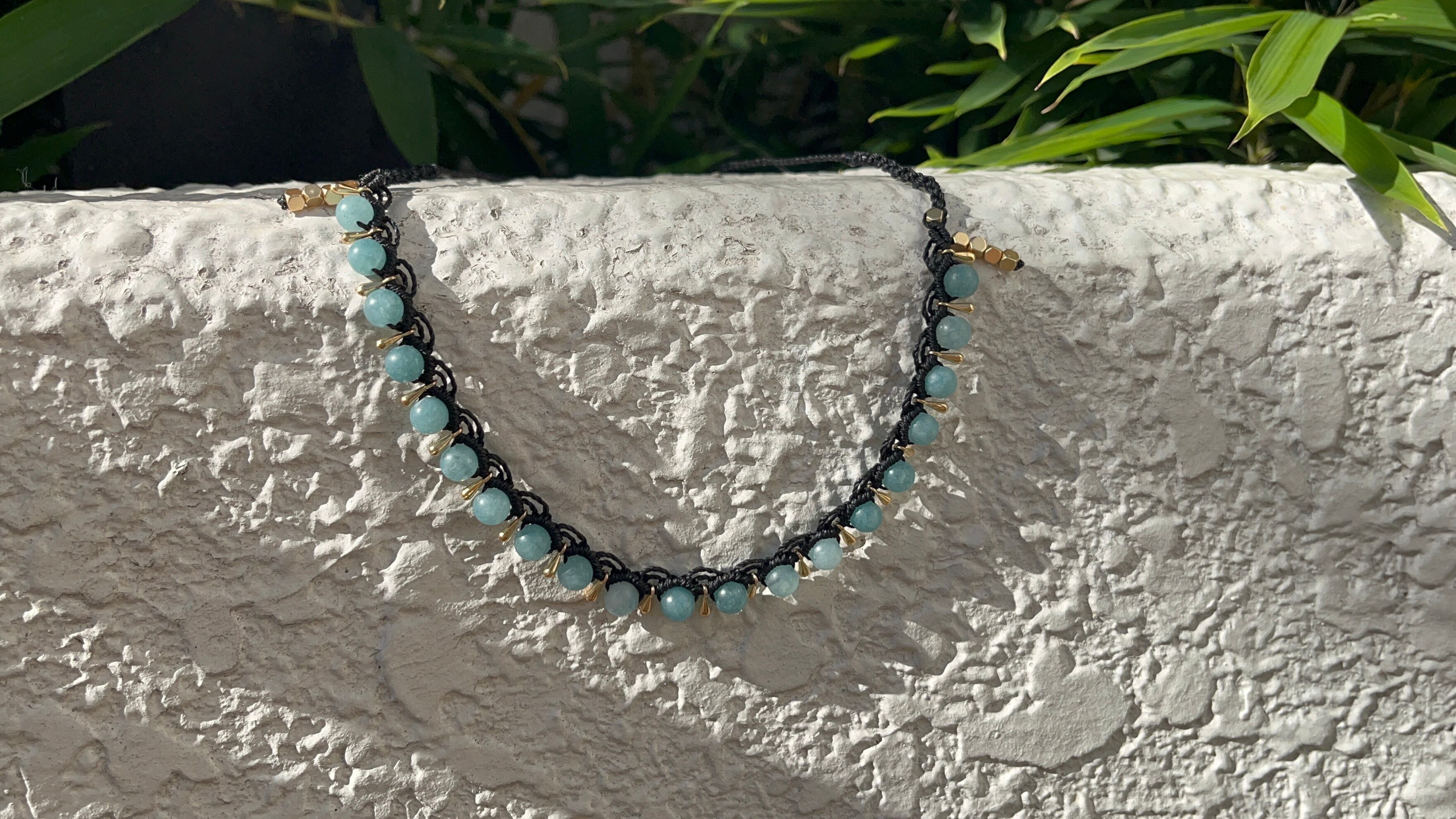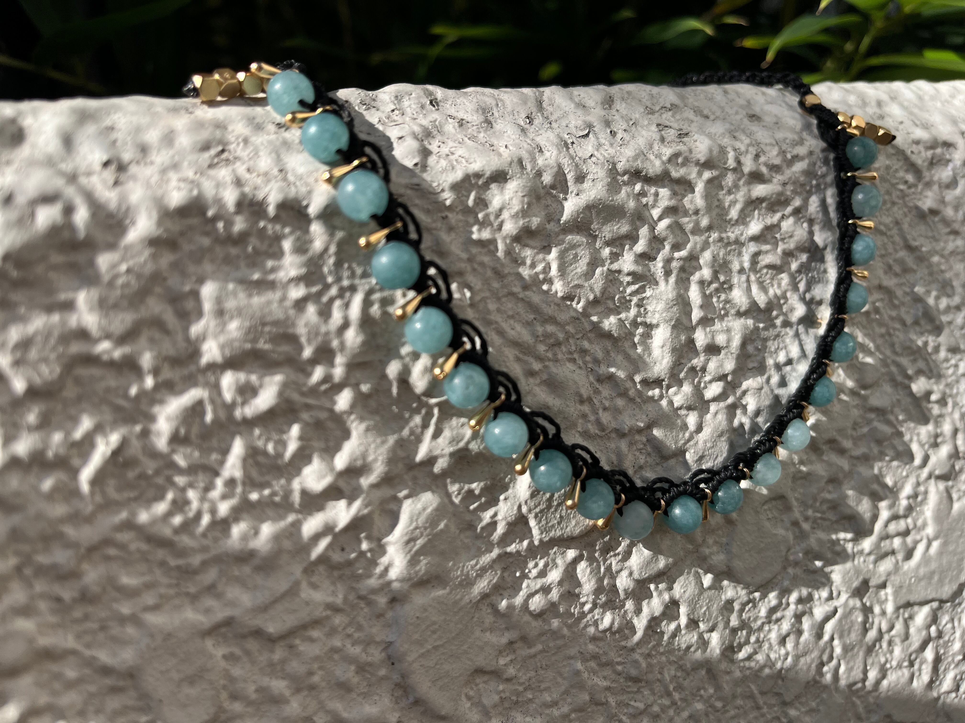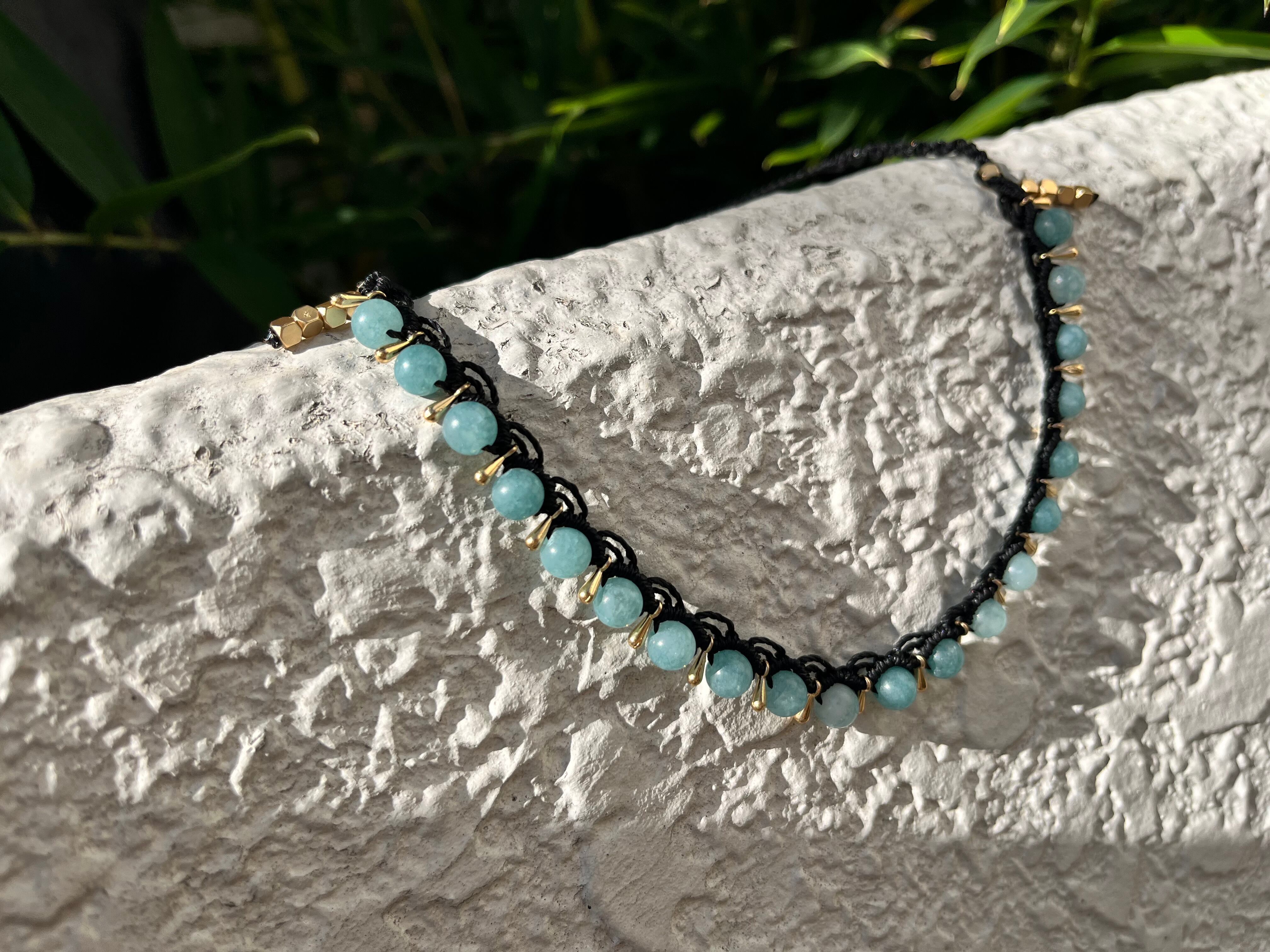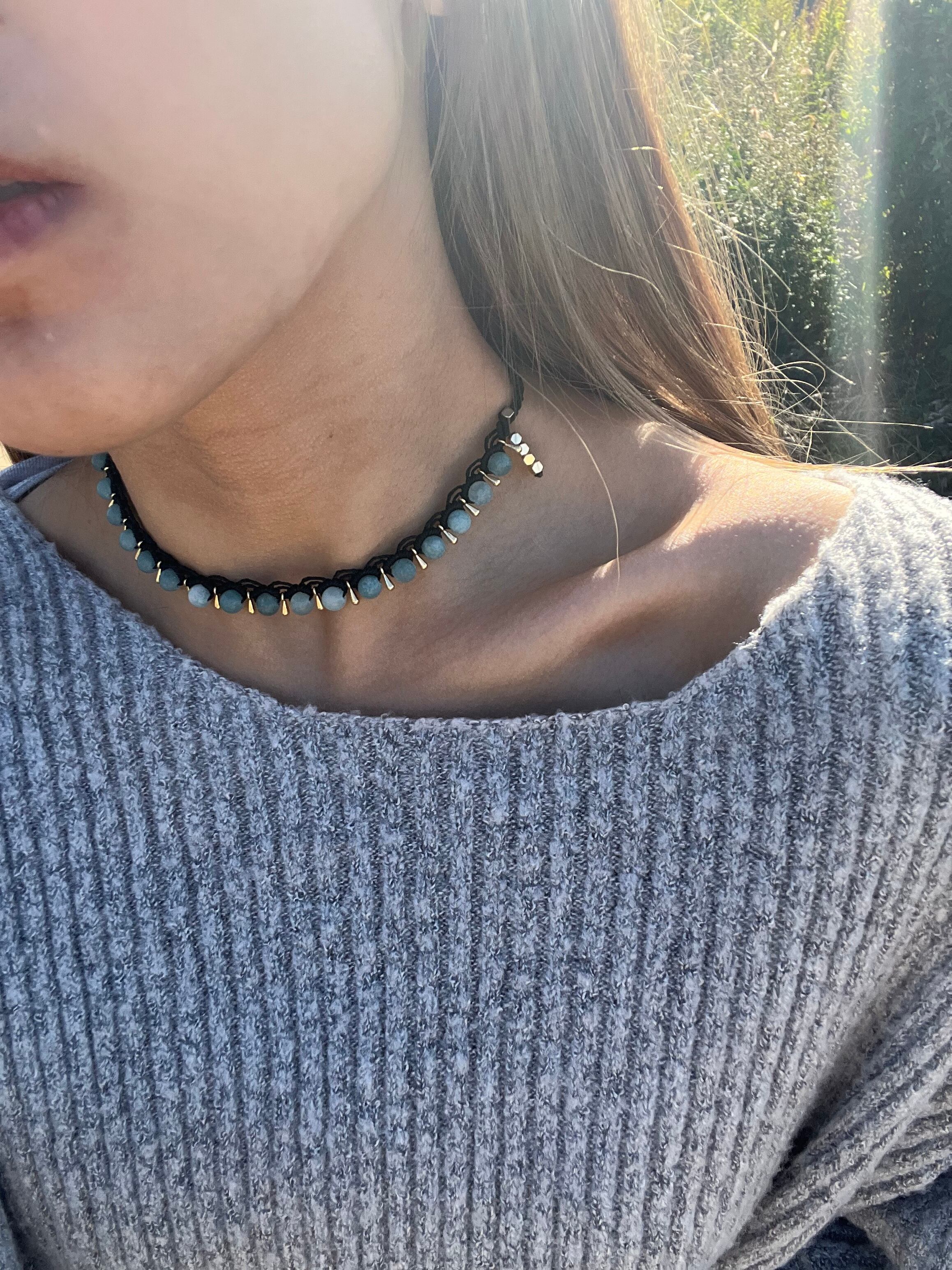 ブラックカラーとマットアクアマリン、ヘマタイトが見事に調和し、シックなスタイルにクールなエッセンスを加えます。このチョーカーを身に着けることで、特別な日からカジュアルな日常まで、あなたの魅力を引き立てることができるでしょう。