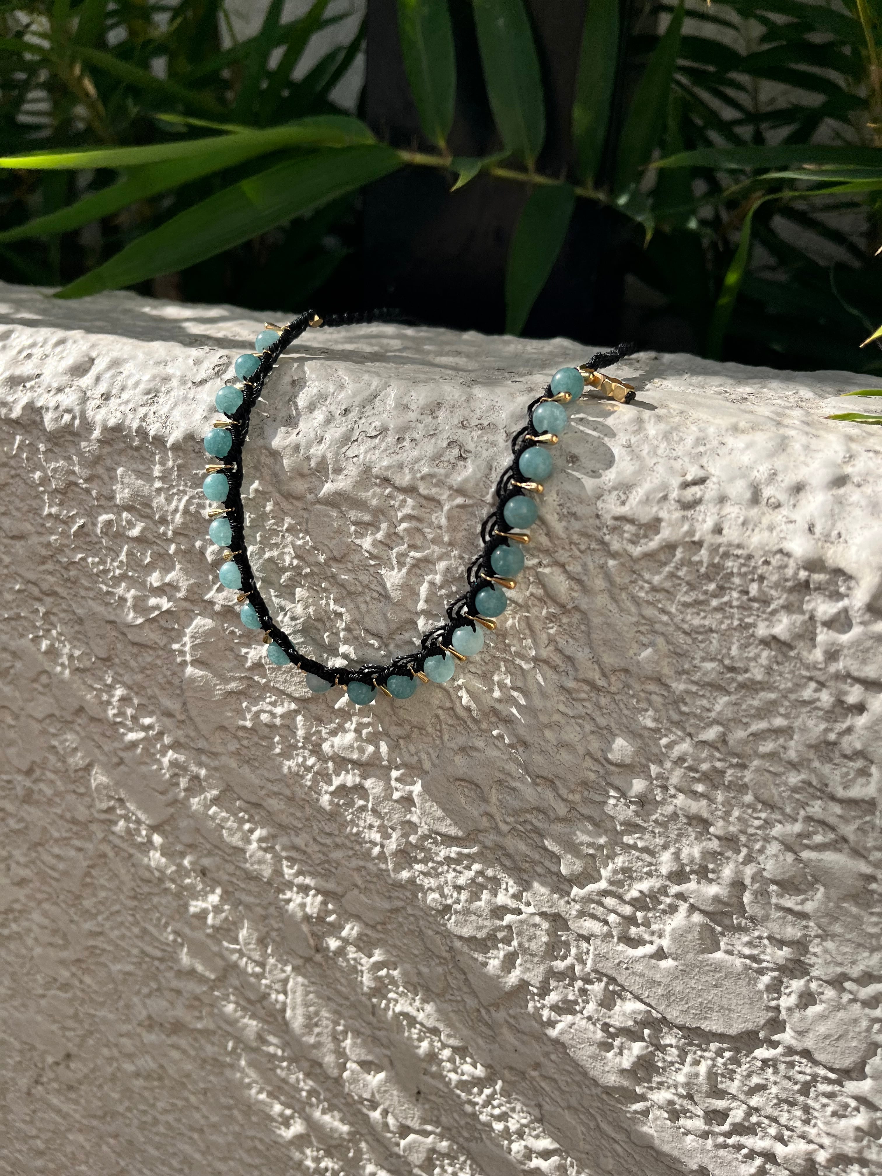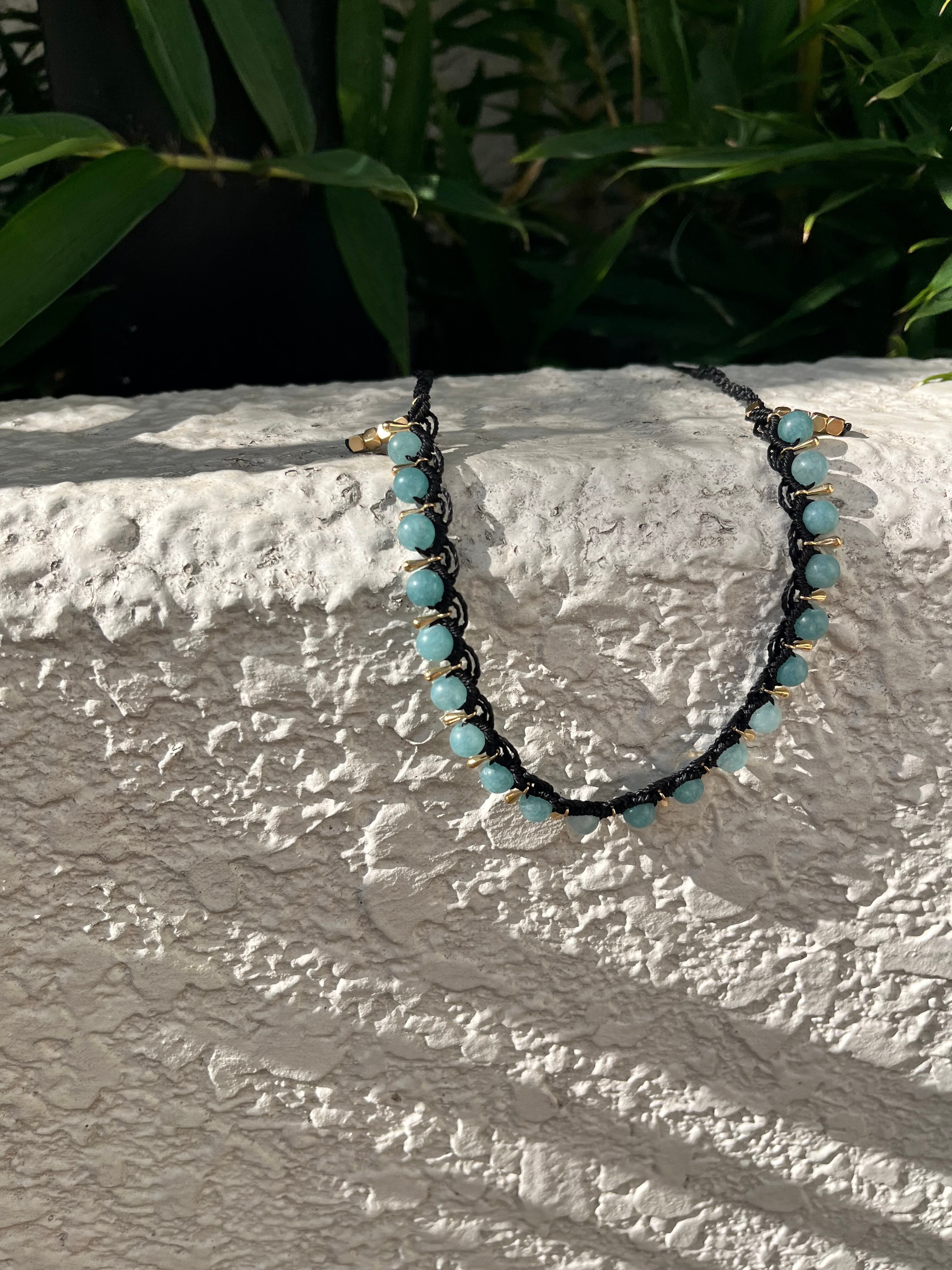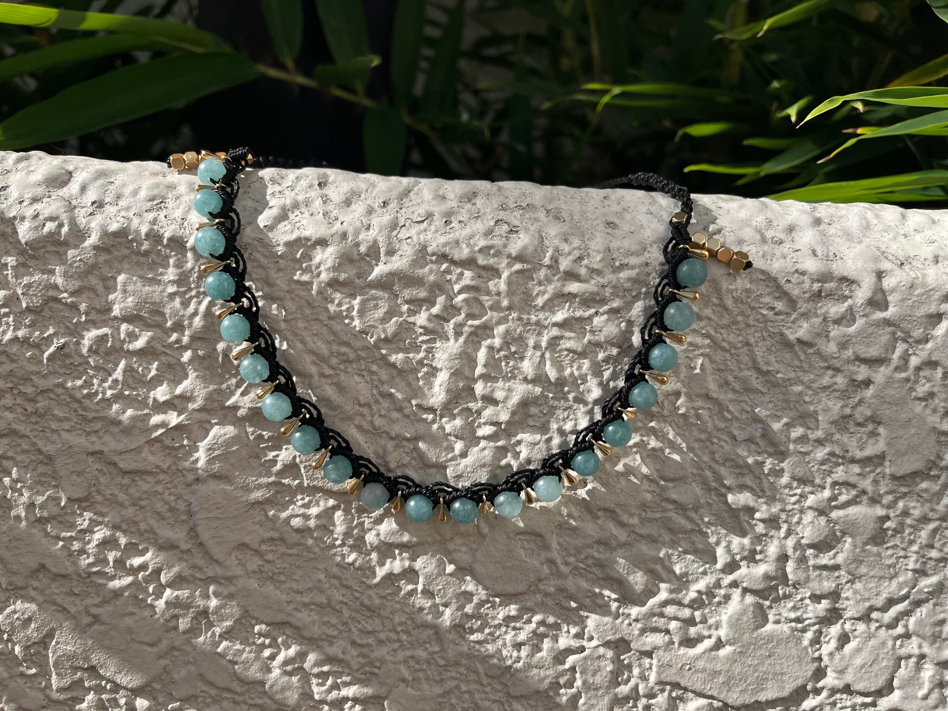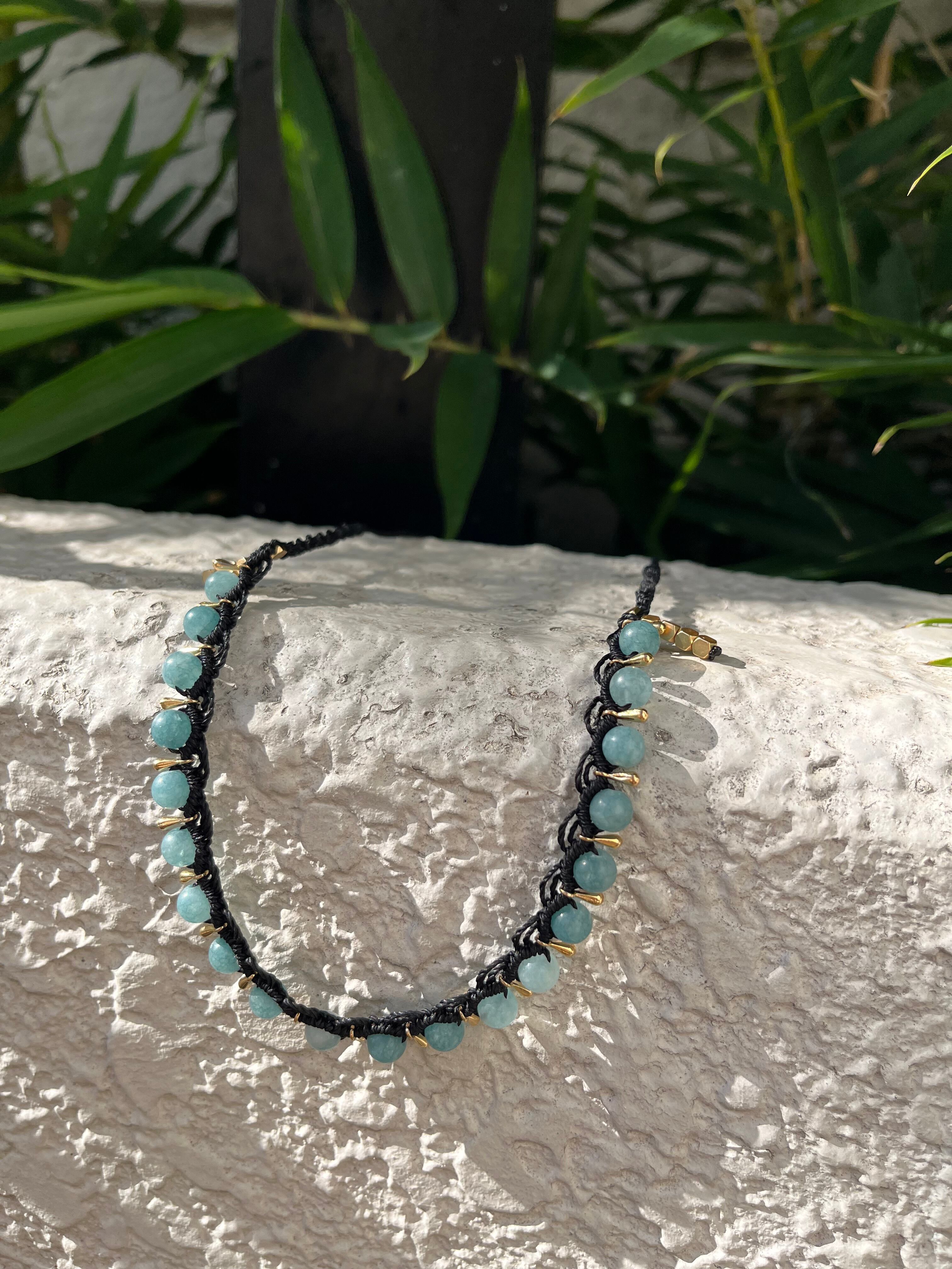 ブラックカラーとマットアクアマリン、ヘマタイトが見事に調和し、シックなスタイルにクールなエッセンスを加えます。このチョーカーを身に着けることで、特別な日からカジュアルな日常まで、あなたの魅力を引き立てることができるでしょう。
