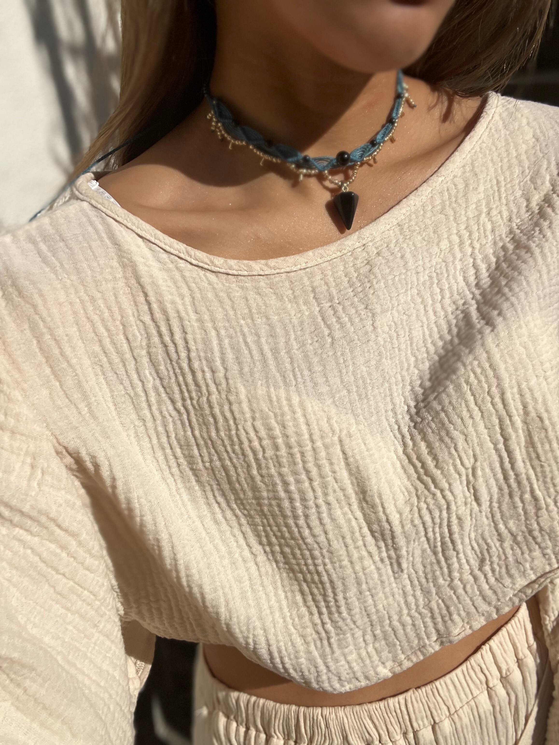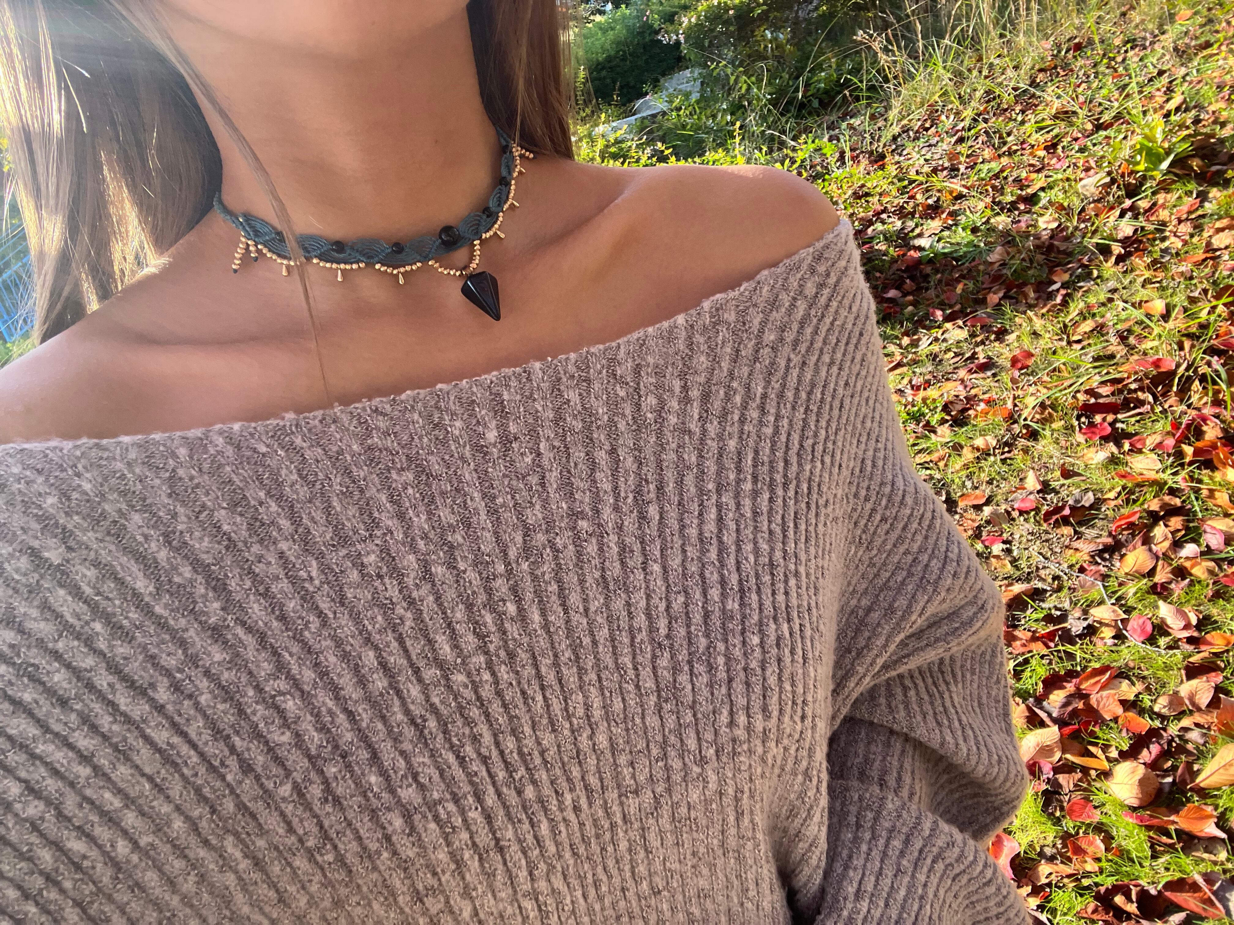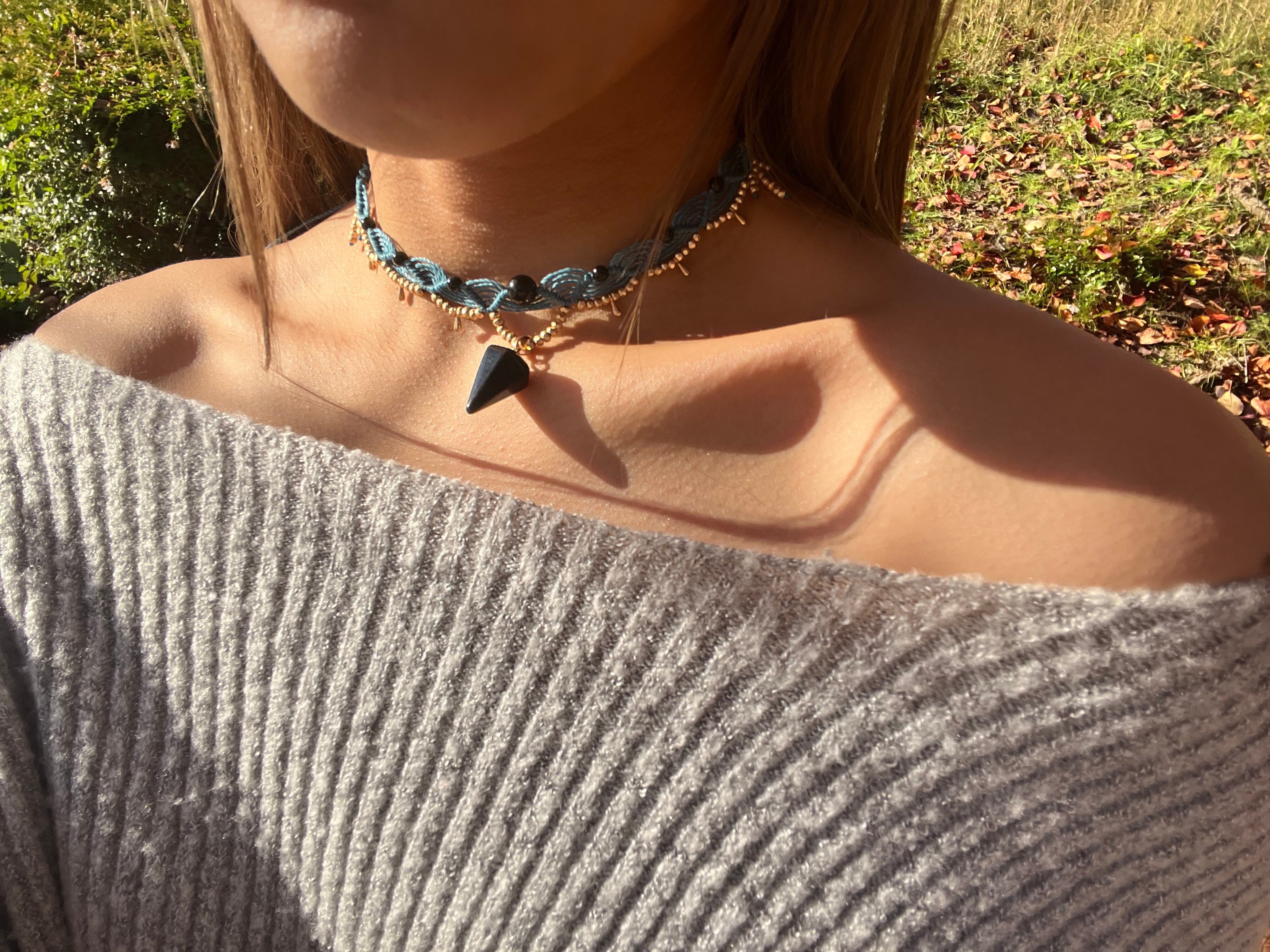 手作業で丁寧に作られたこのチョーカーは、天然素材の特性を生かしたデザインが特徴です。