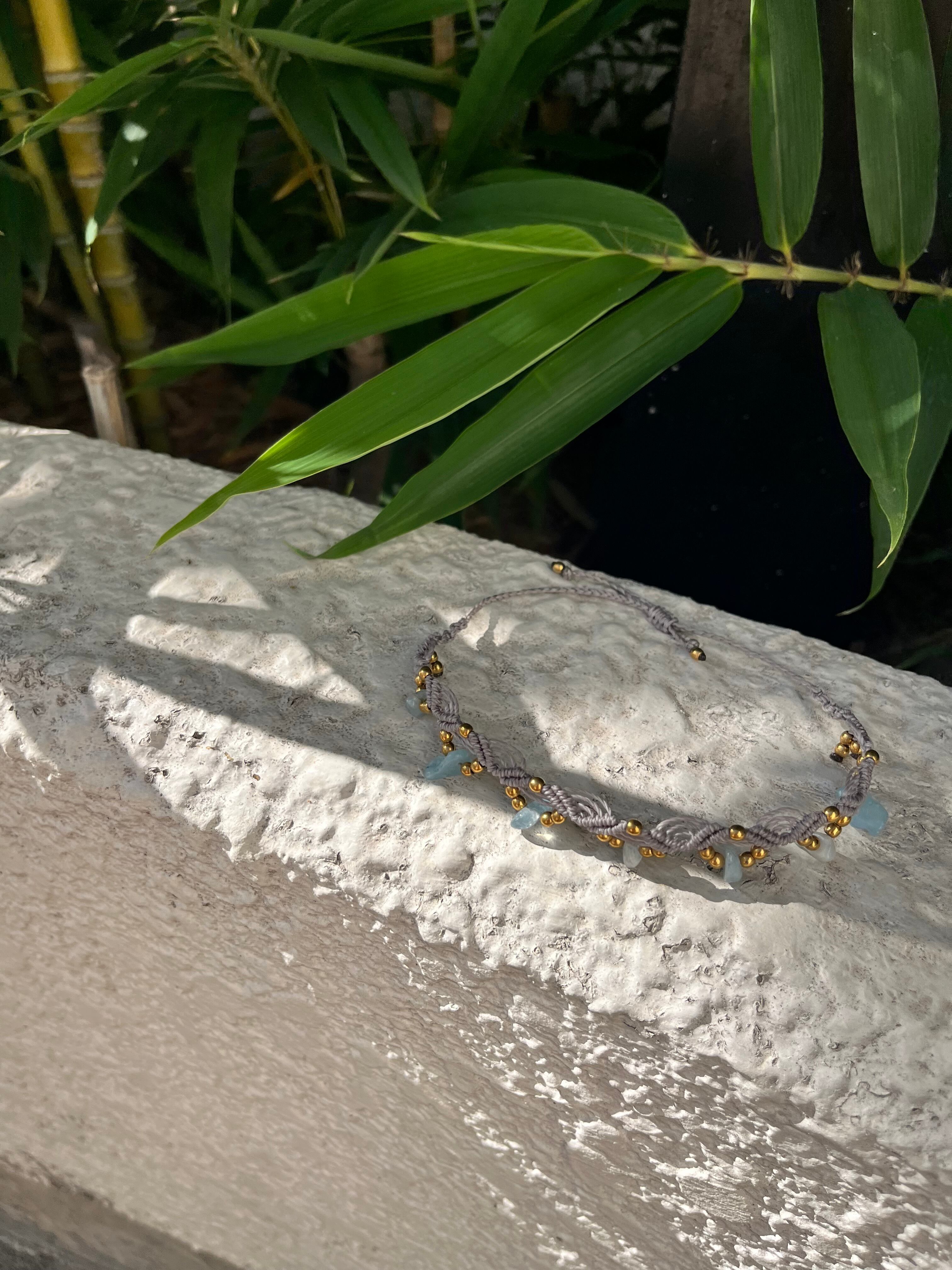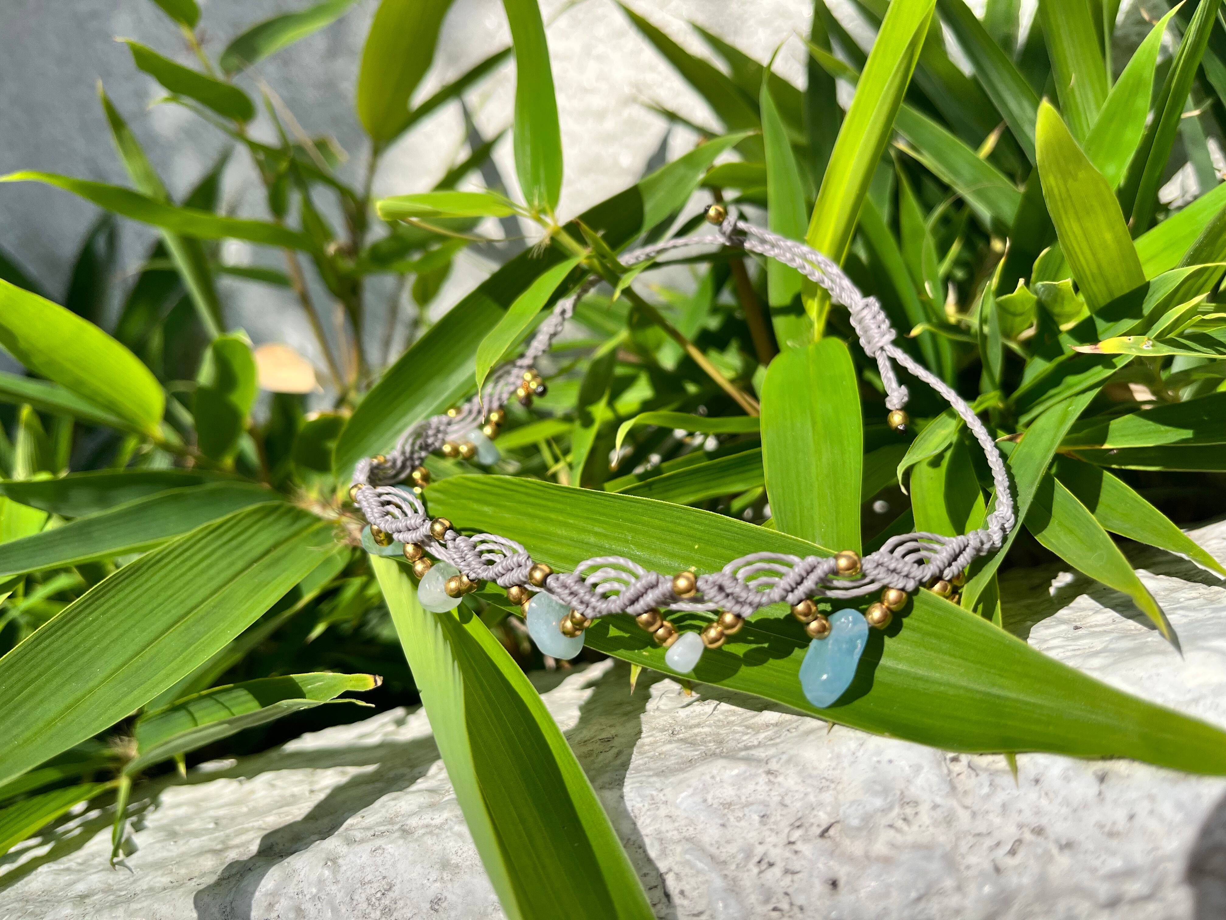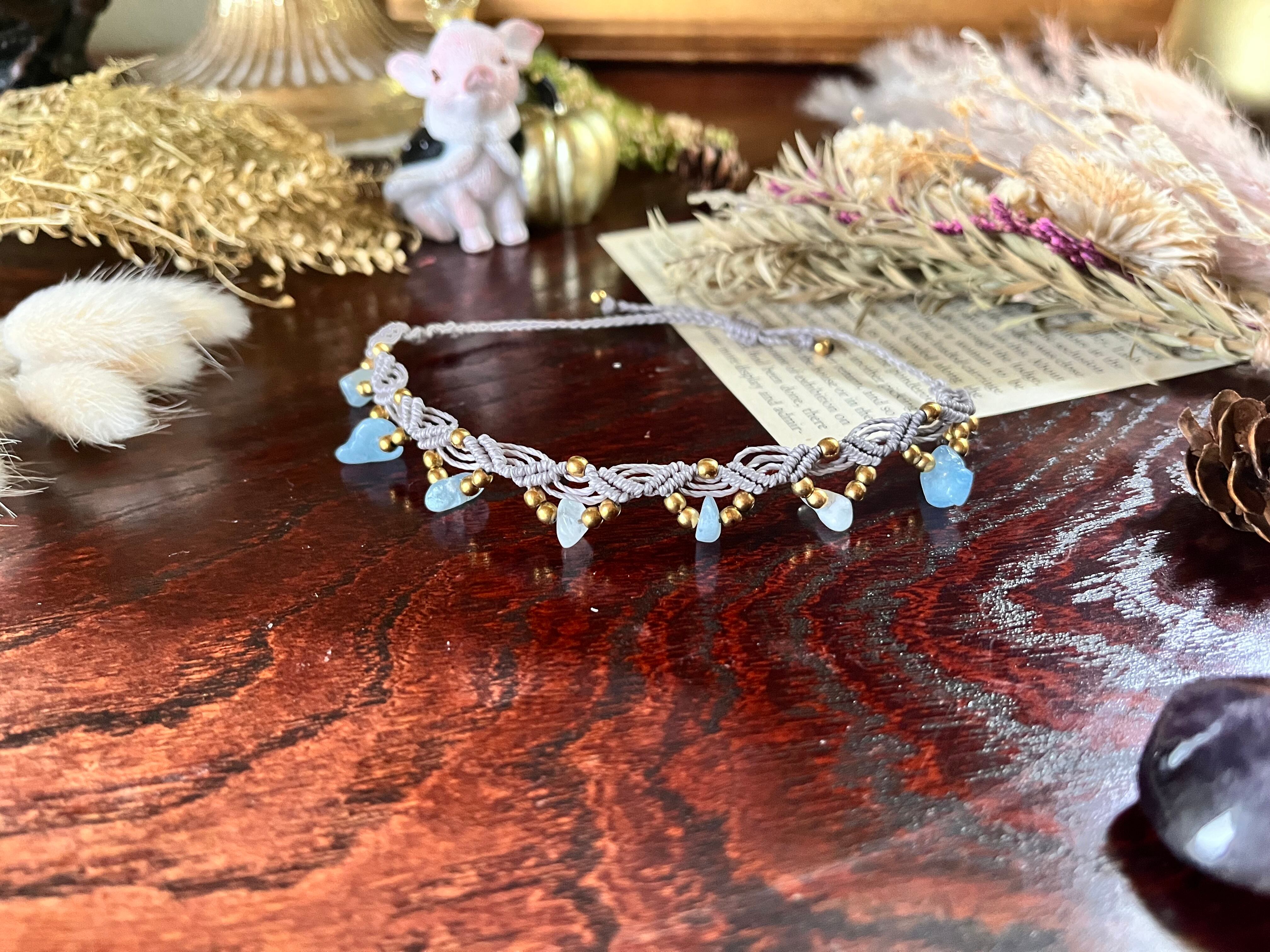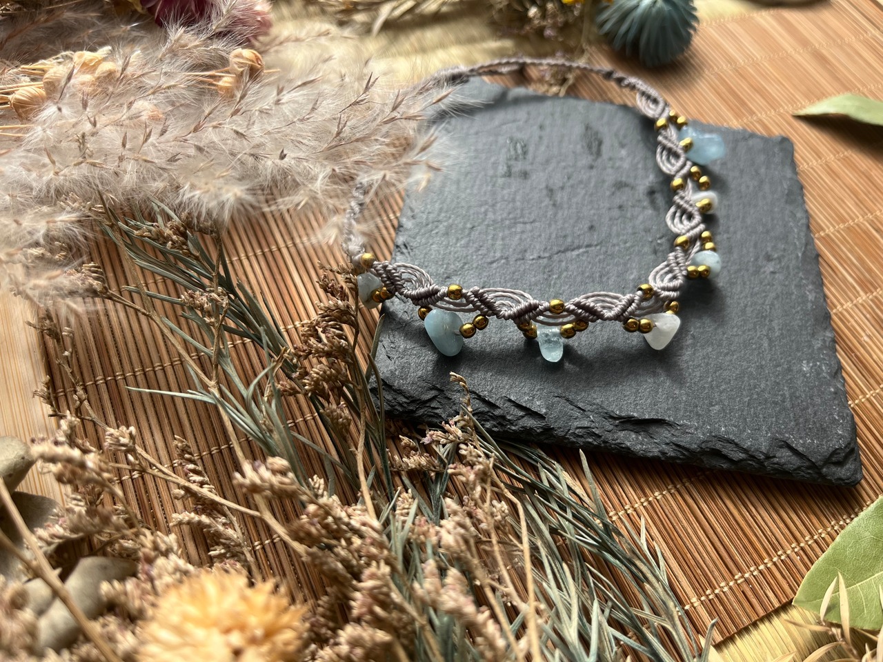 グレーカラーの優雅な仕上げに、アクアマリンとヘマタイトが美しく調和し、あなたの足元に洗練された印象を与えます。このアンクレットを身に着けることで、日常のコーディネートから特別なシーンまで、あなたの魅力を引き立ててくれることでしょう。