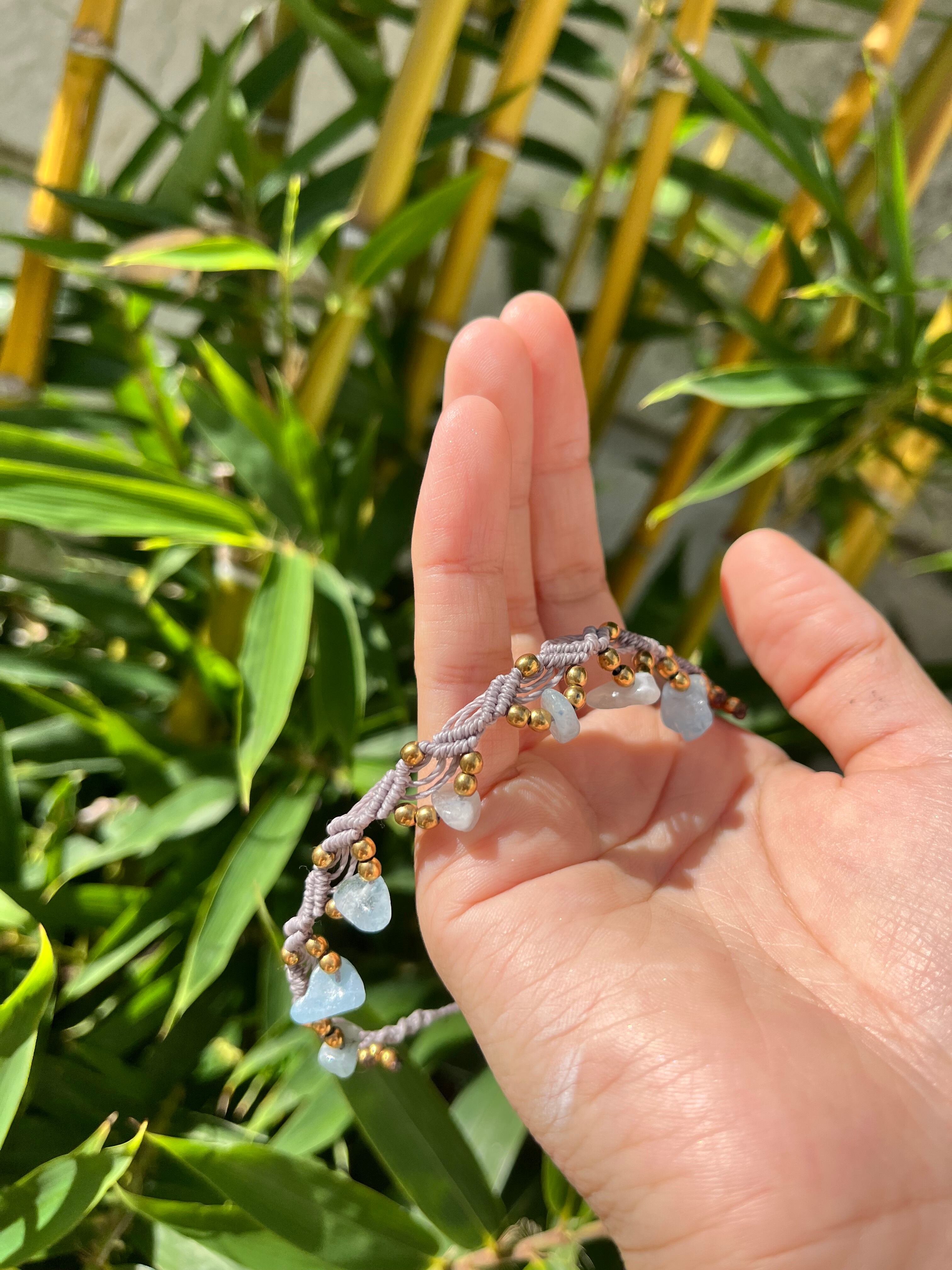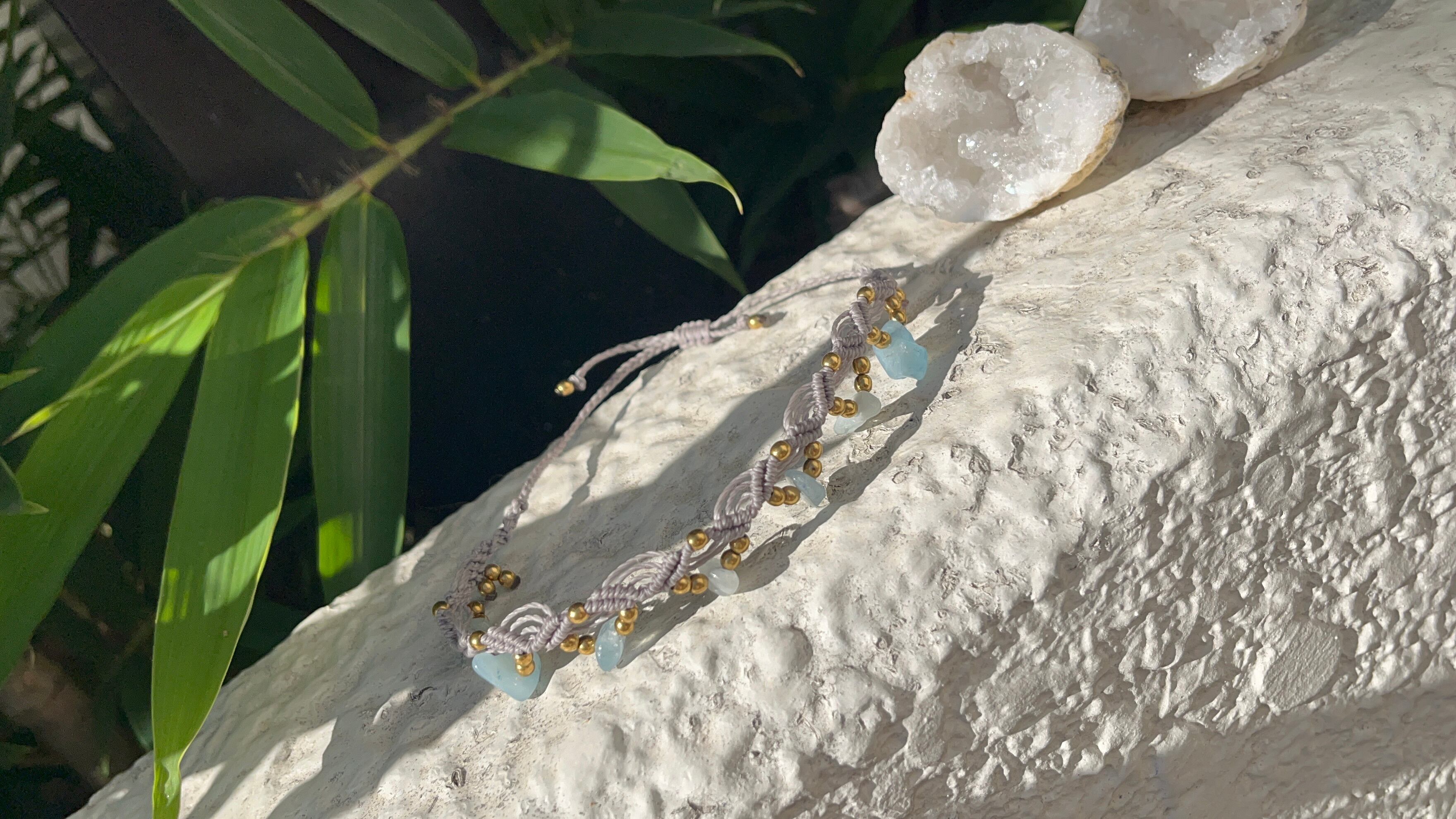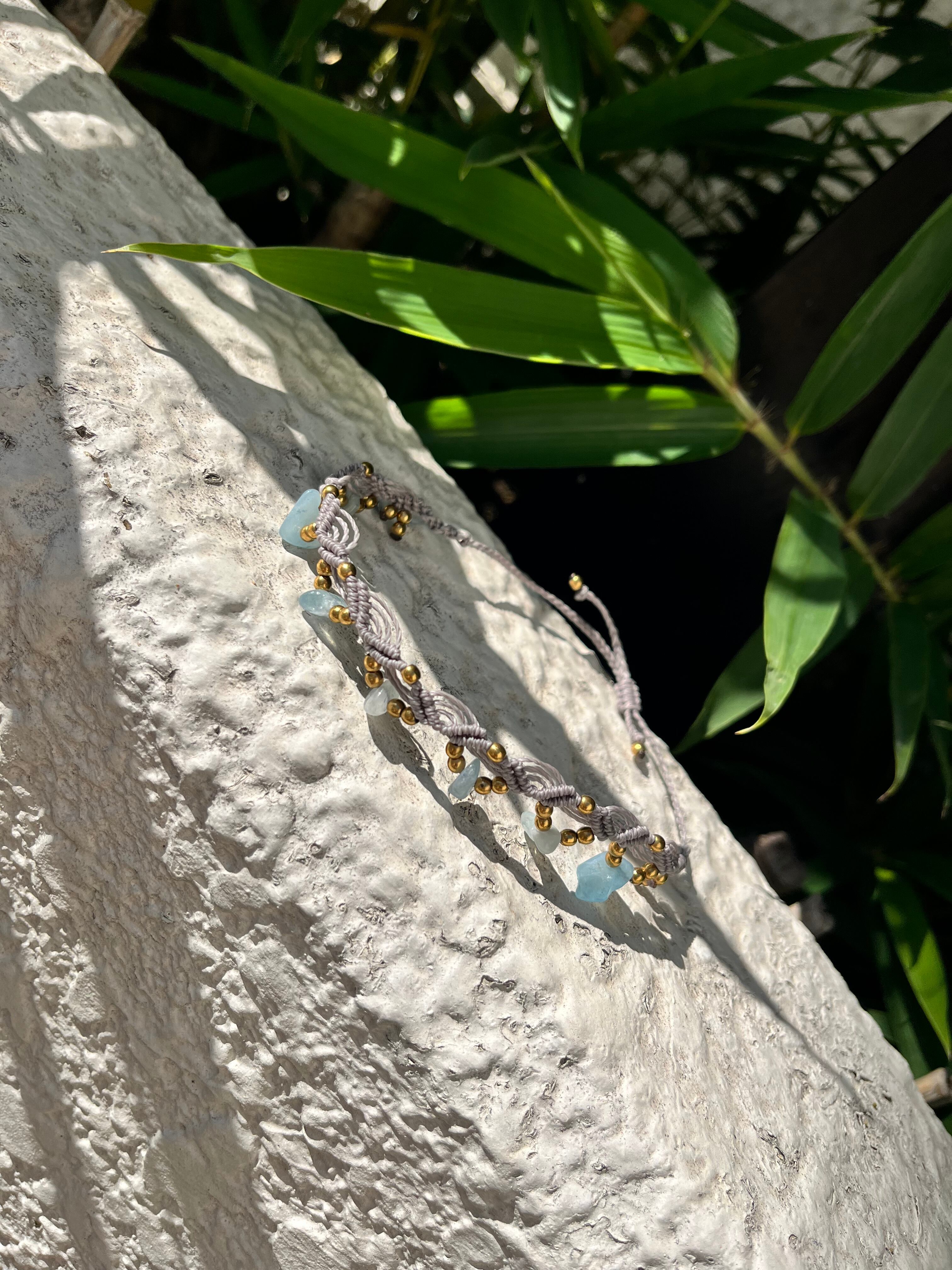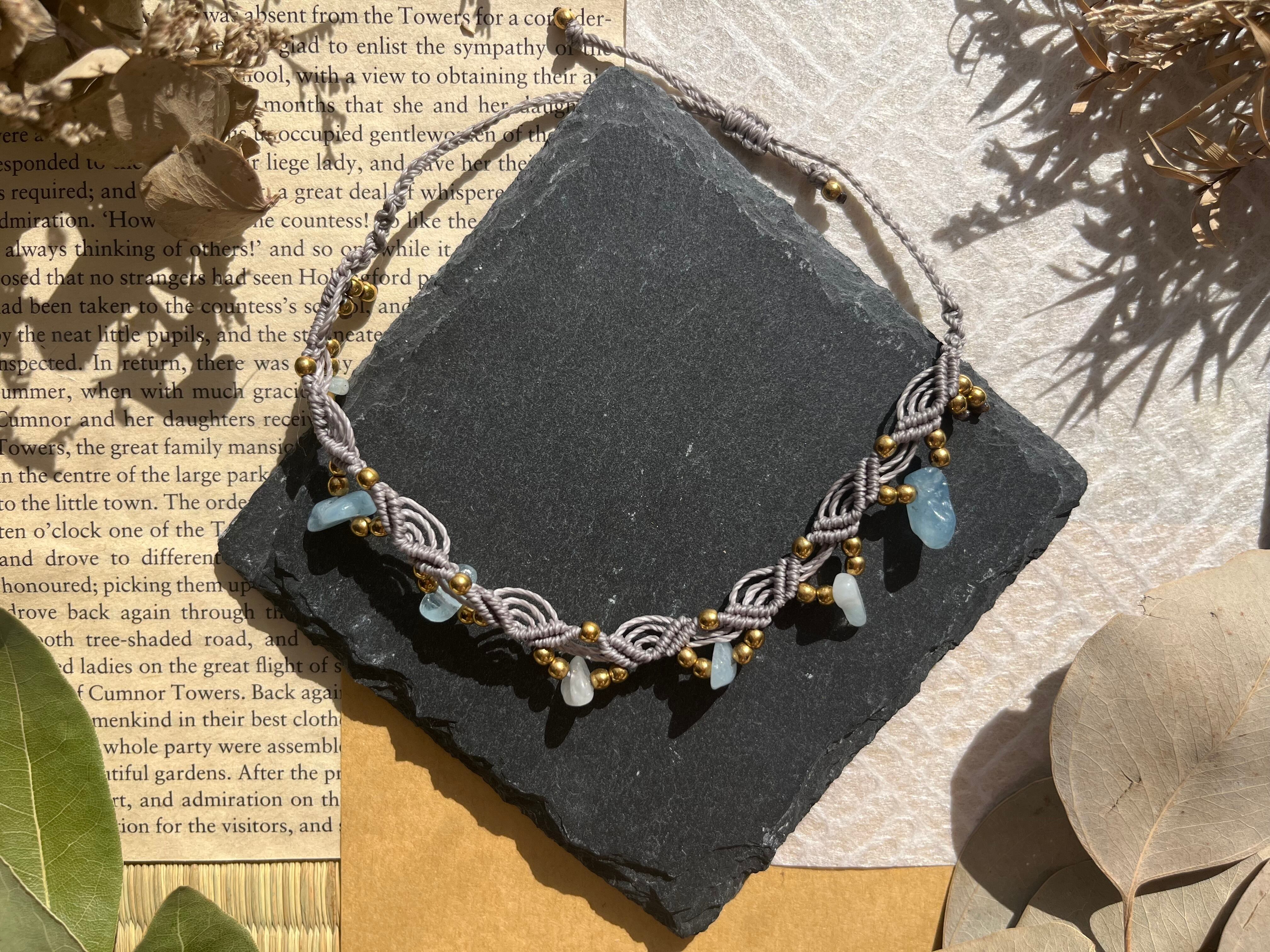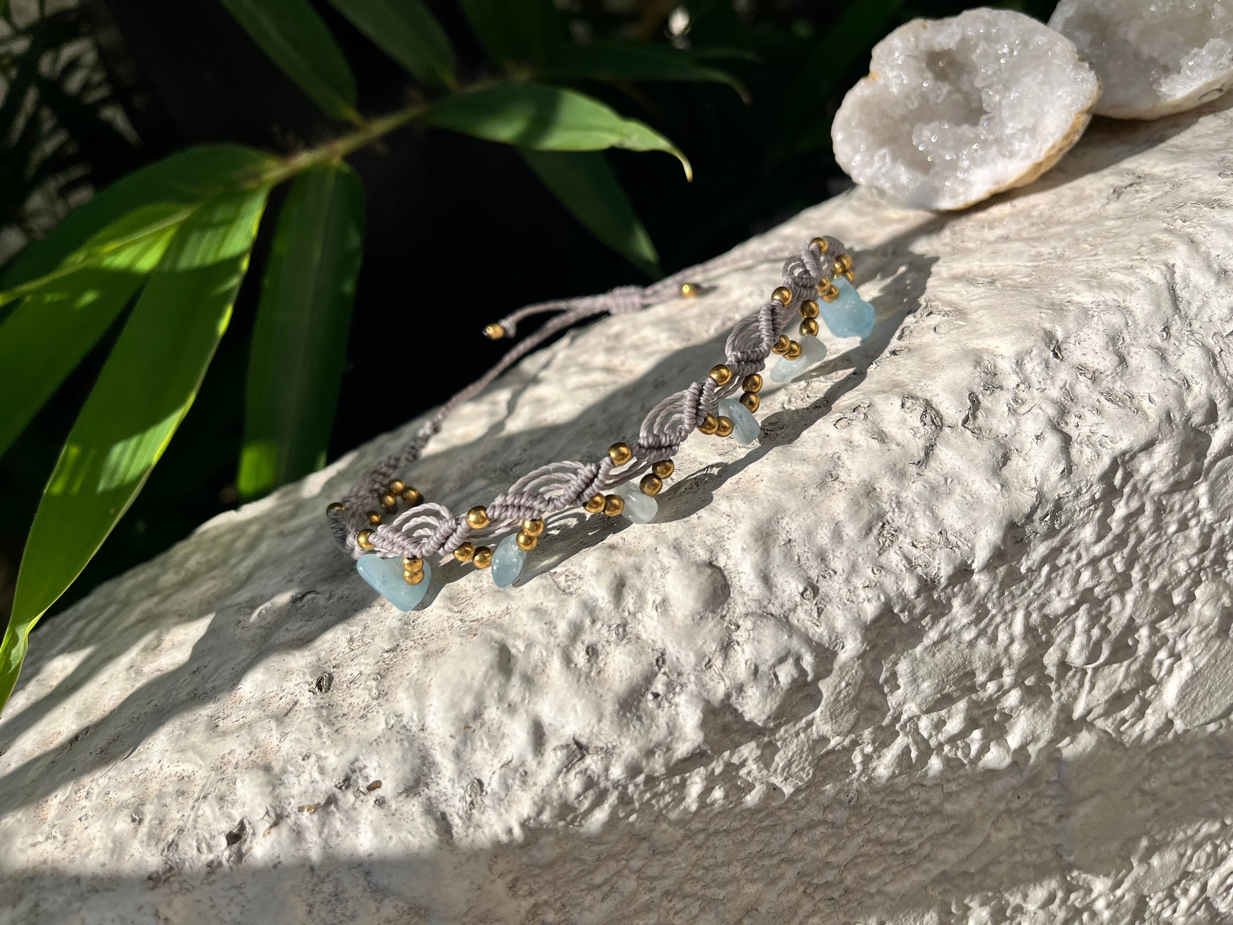グレーカラーの優雅な仕上げに、アクアマリンとヘマタイトが美しく調和し、あなたの足元に洗練された印象を与えます。このアンクレットを身に着けることで、日常のコーディネートから特別なシーンまで、あなたの魅力を引き立ててくれることでしょう。