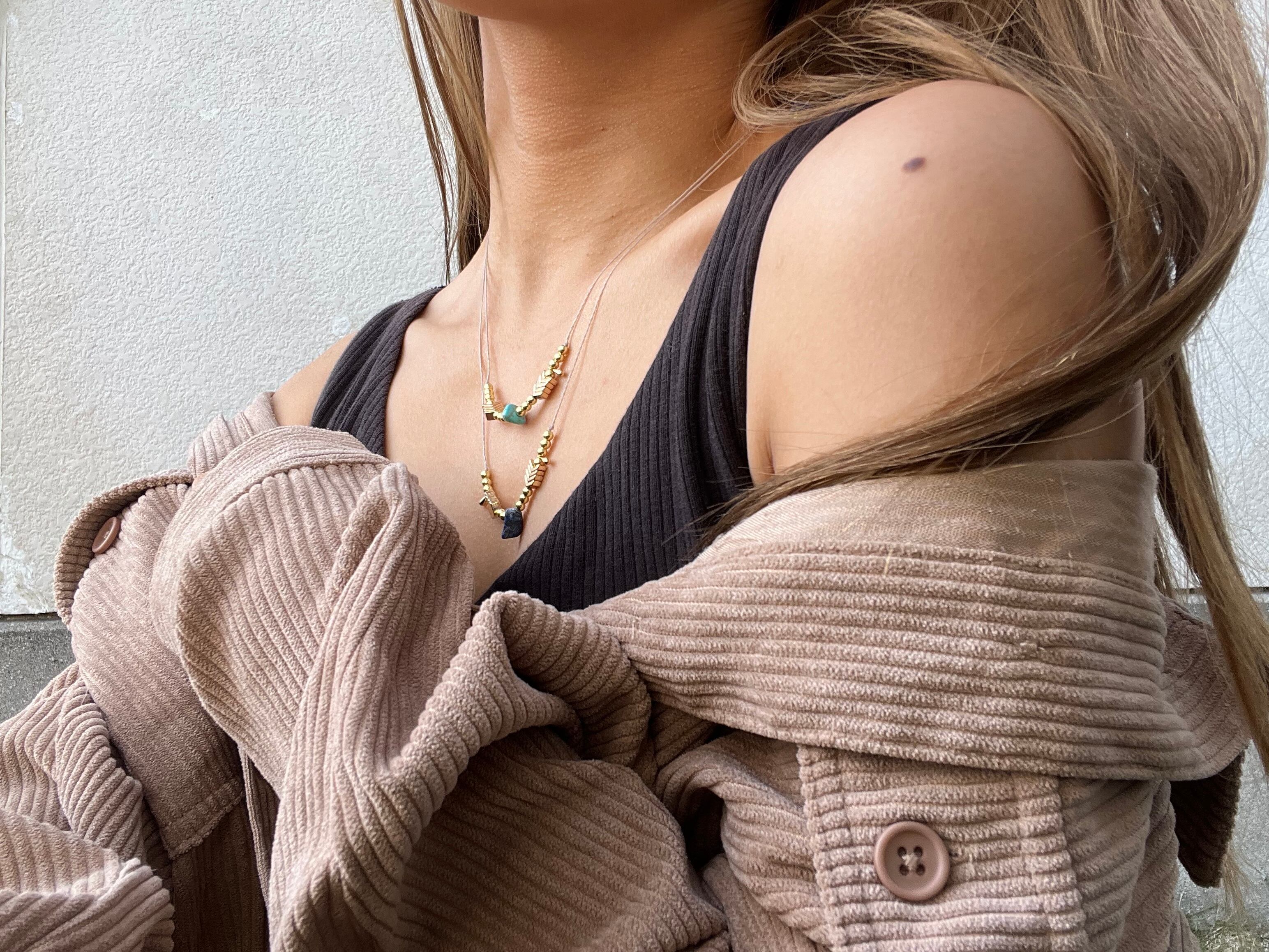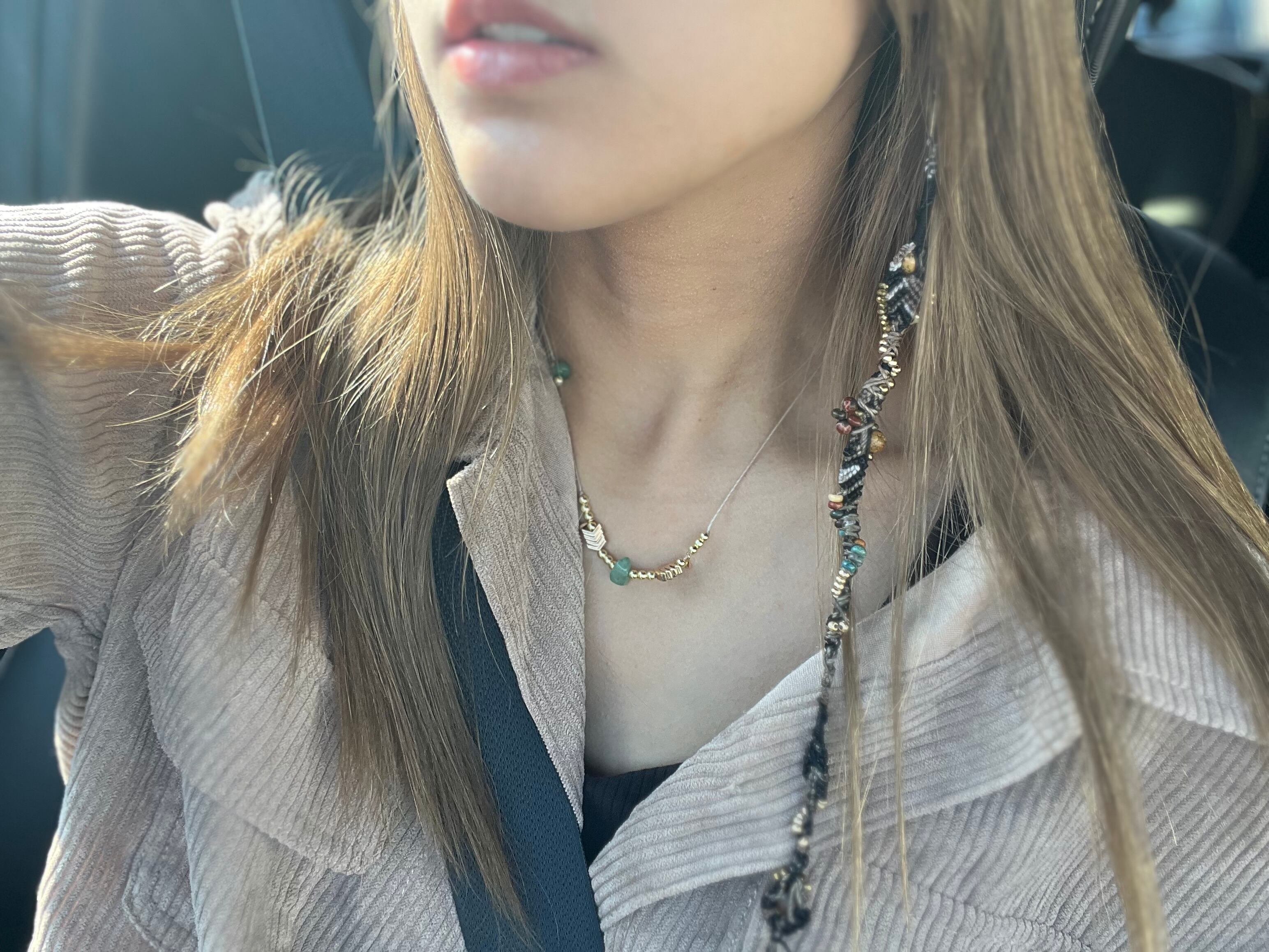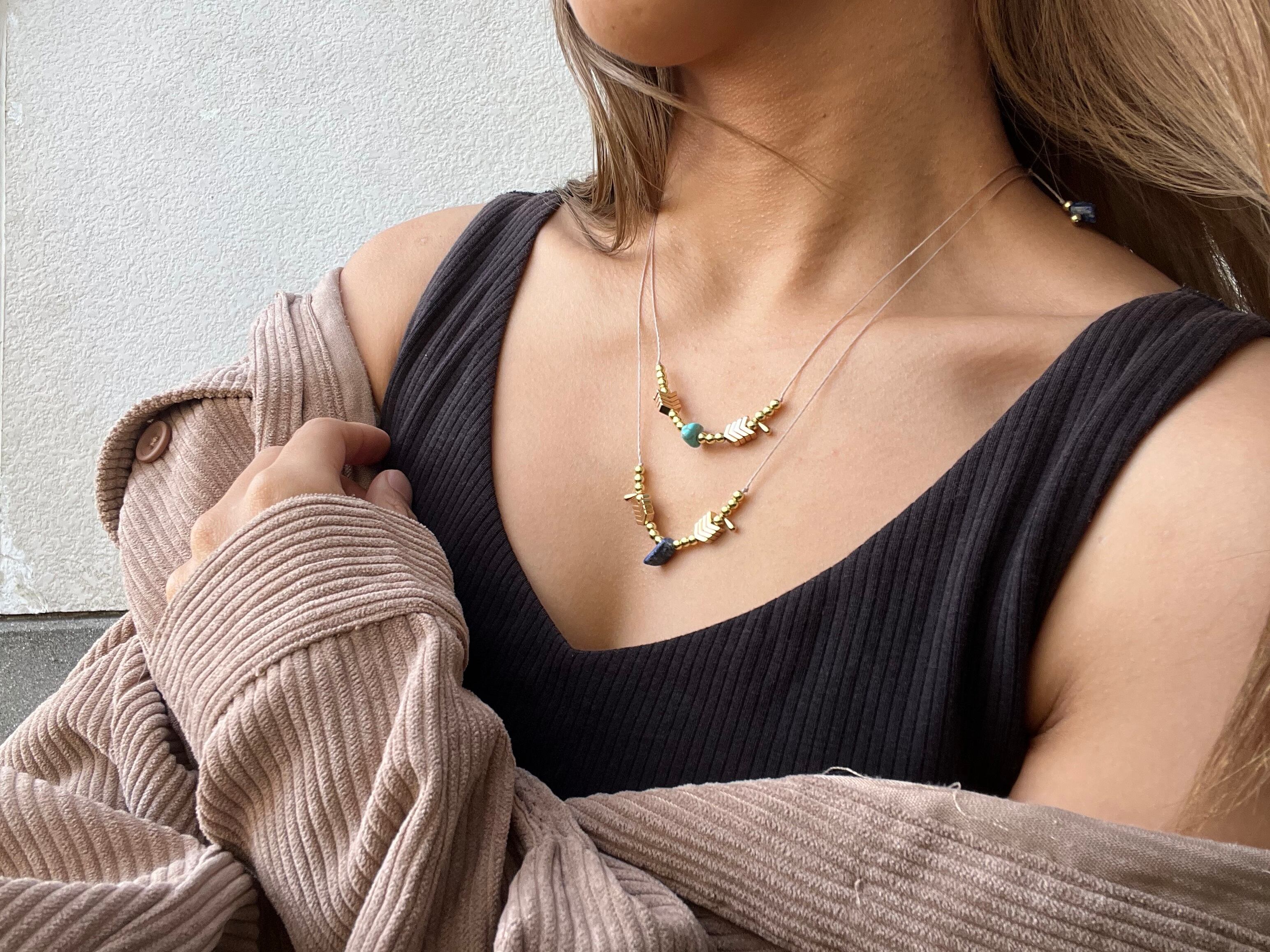 手作業で丁寧に作られたこのネックレスは、天然素材の特性を生かしたデザインが特徴です。