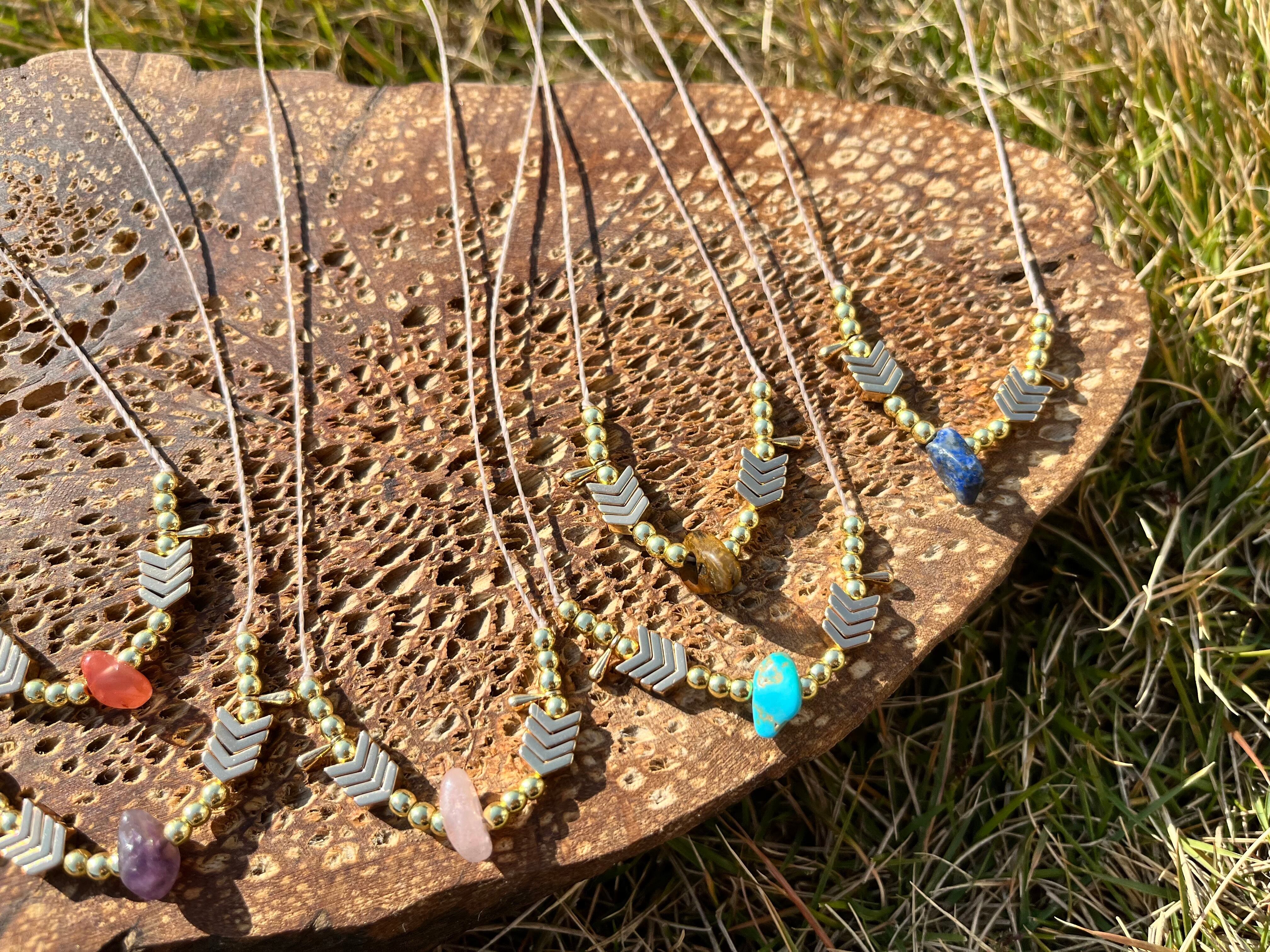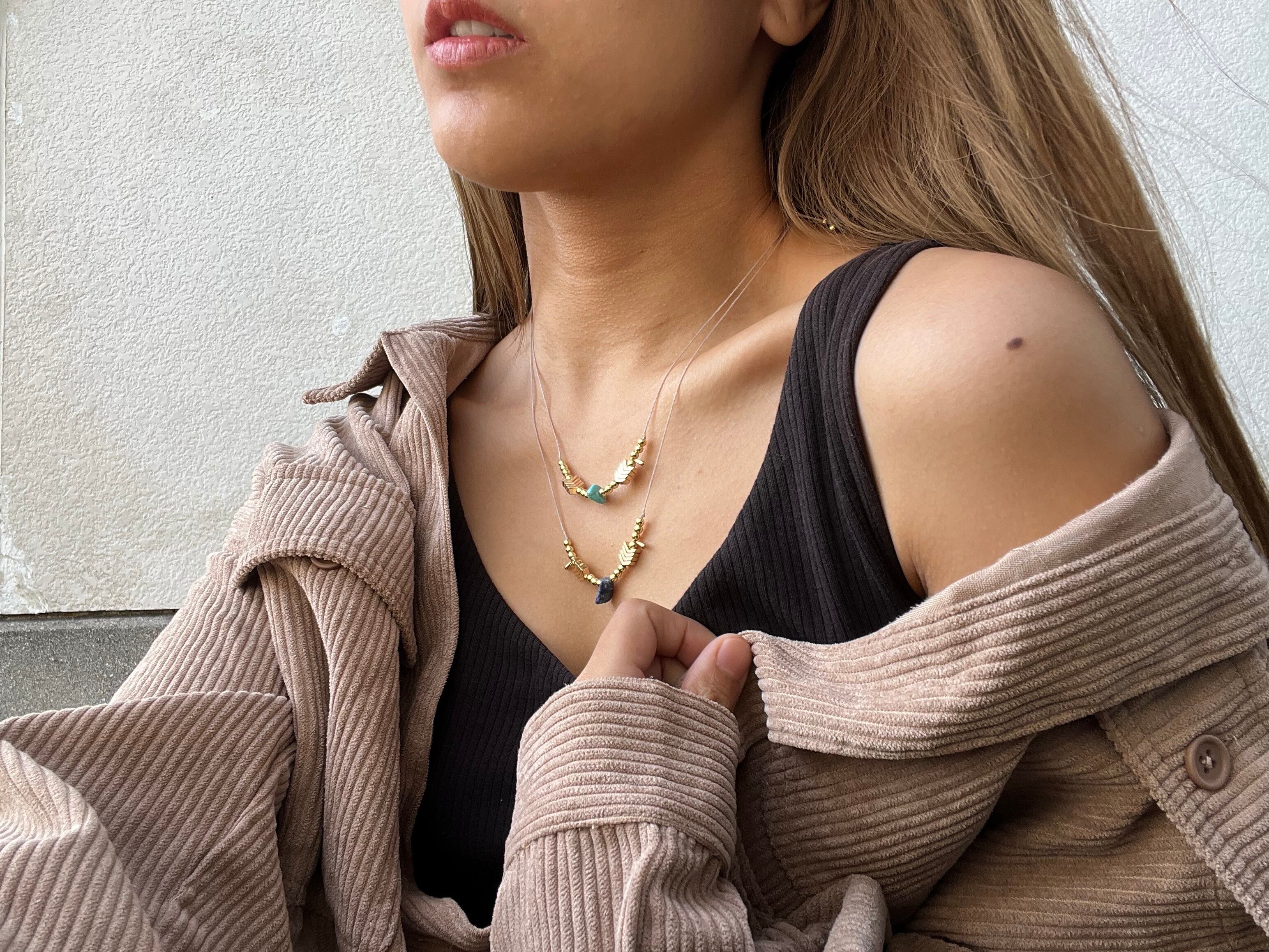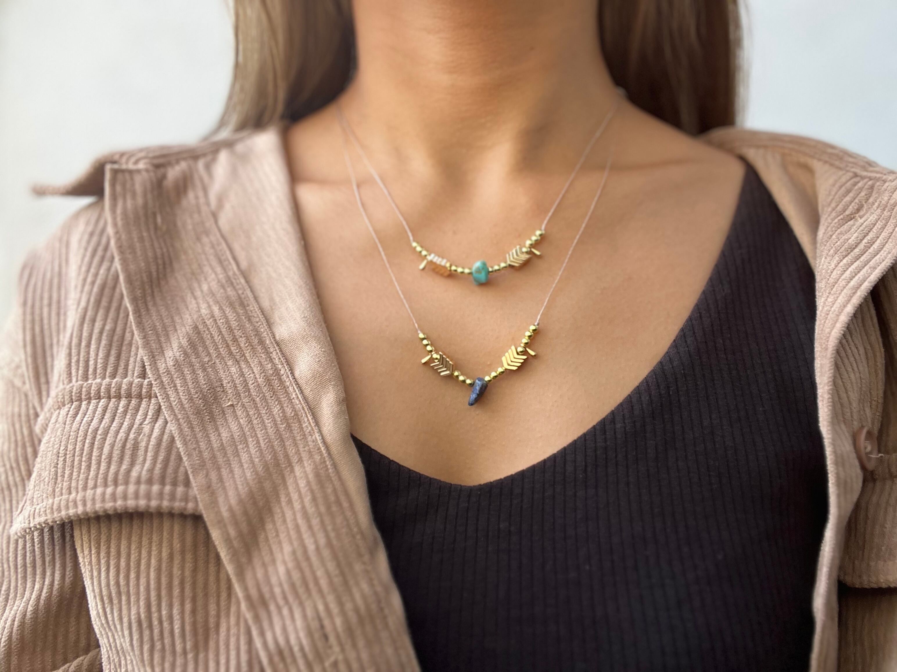 手作業で丁寧に作られたこのネックレスは、天然素材の特性を生かしたデザインが特徴です。