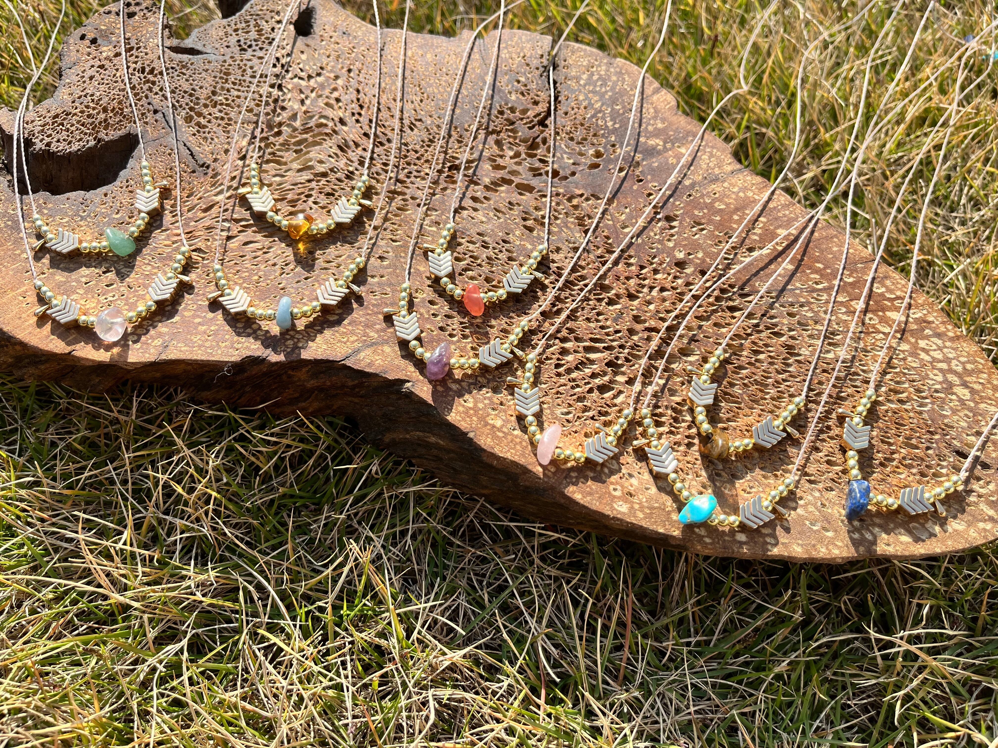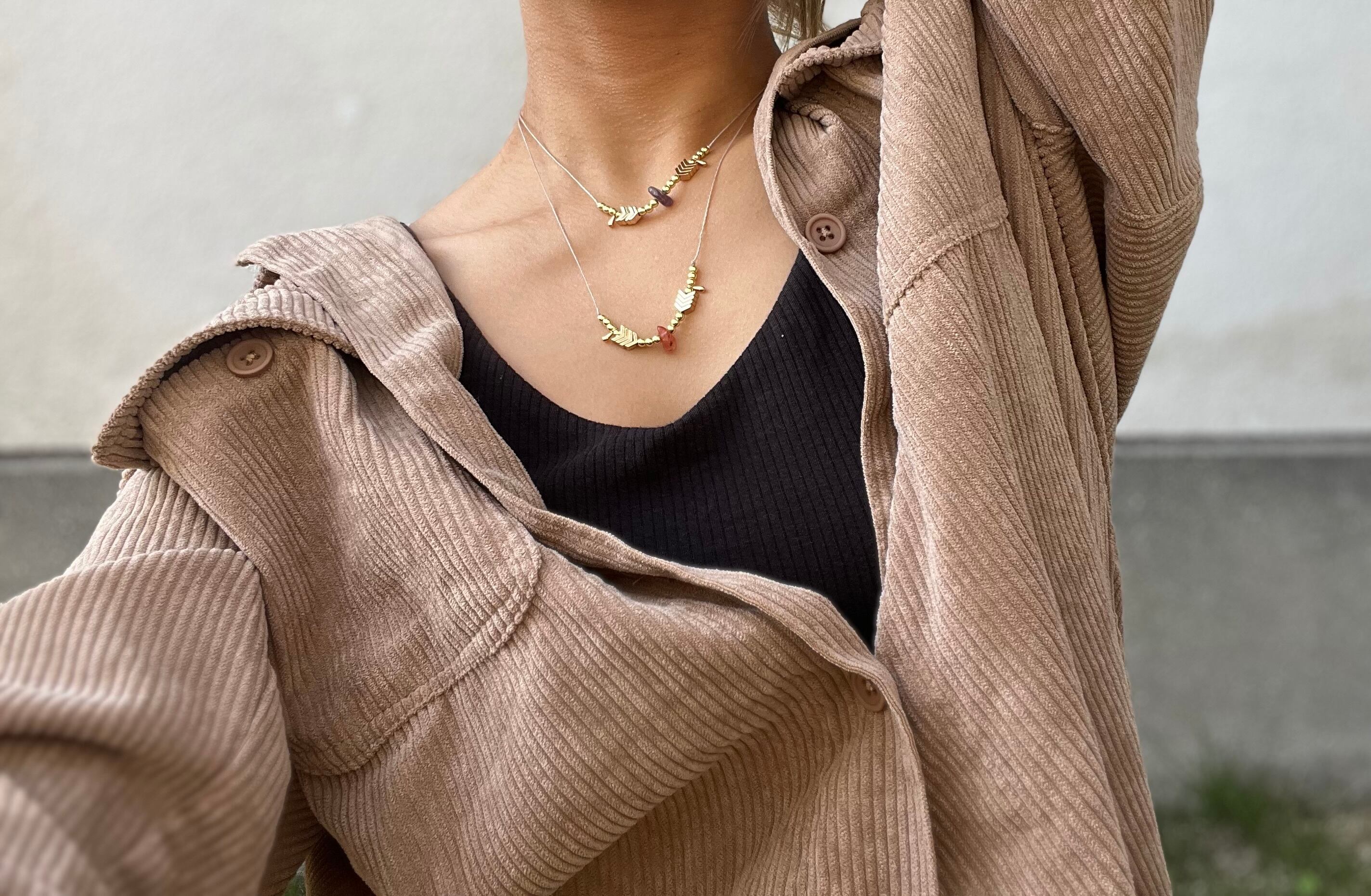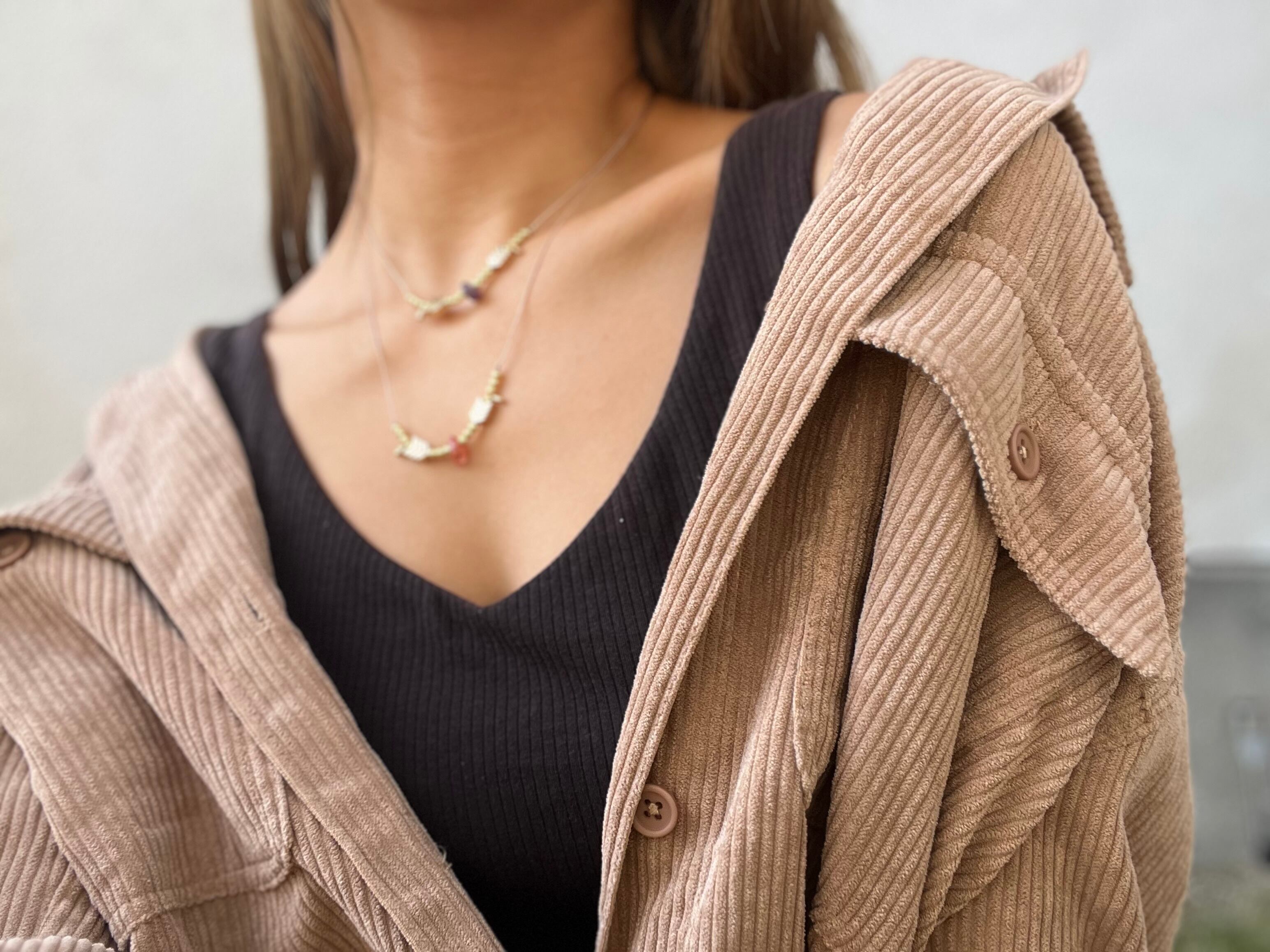 手作業で丁寧に作られたこのネックレスは、天然素材の特性を活かしたデザインが特徴です。