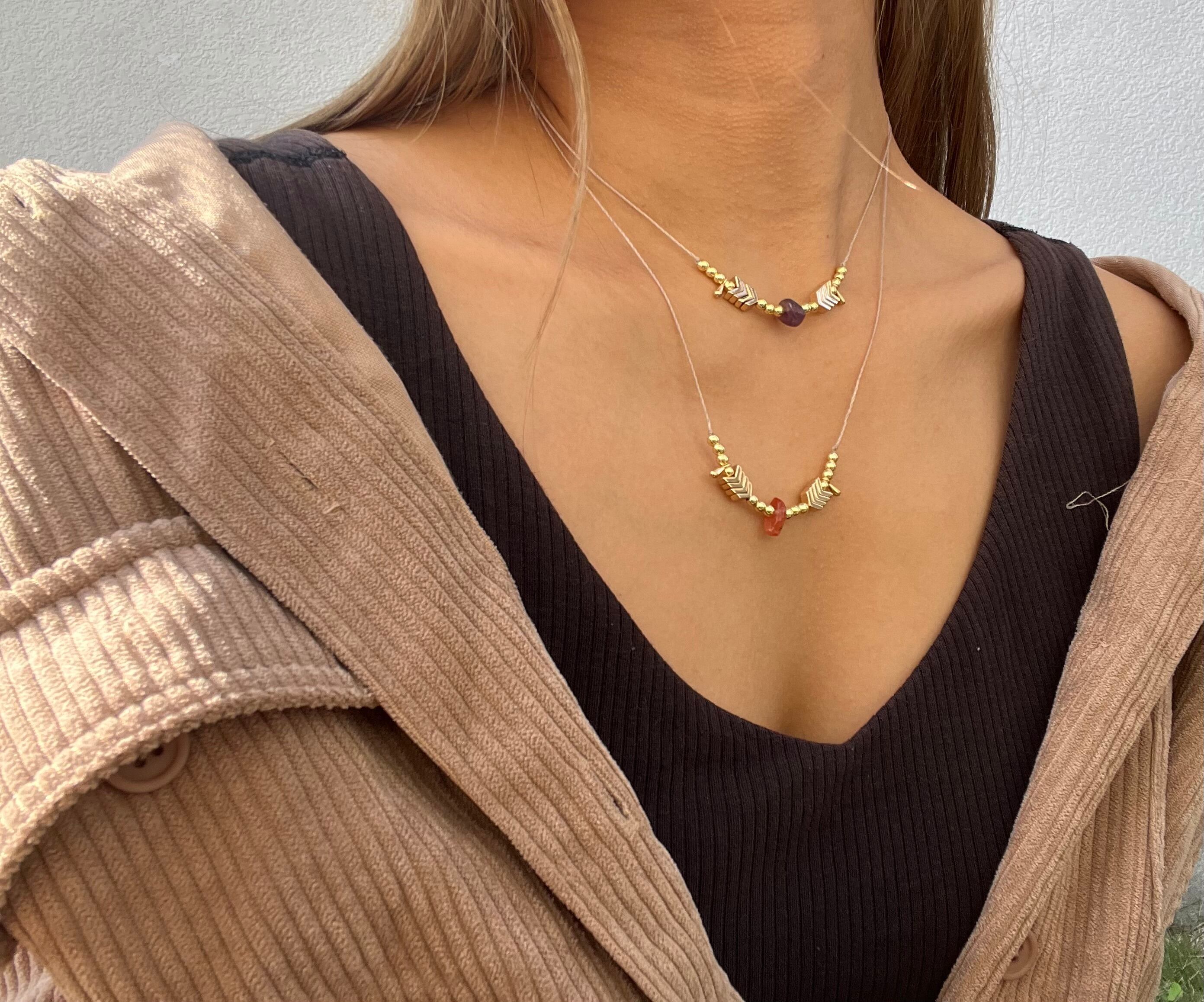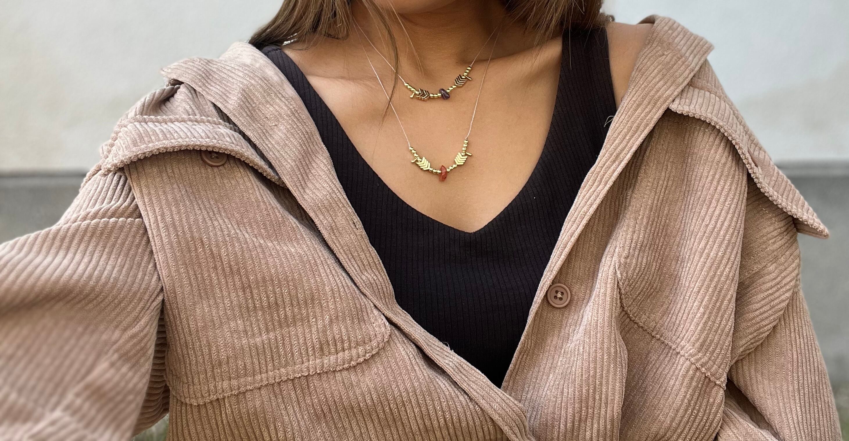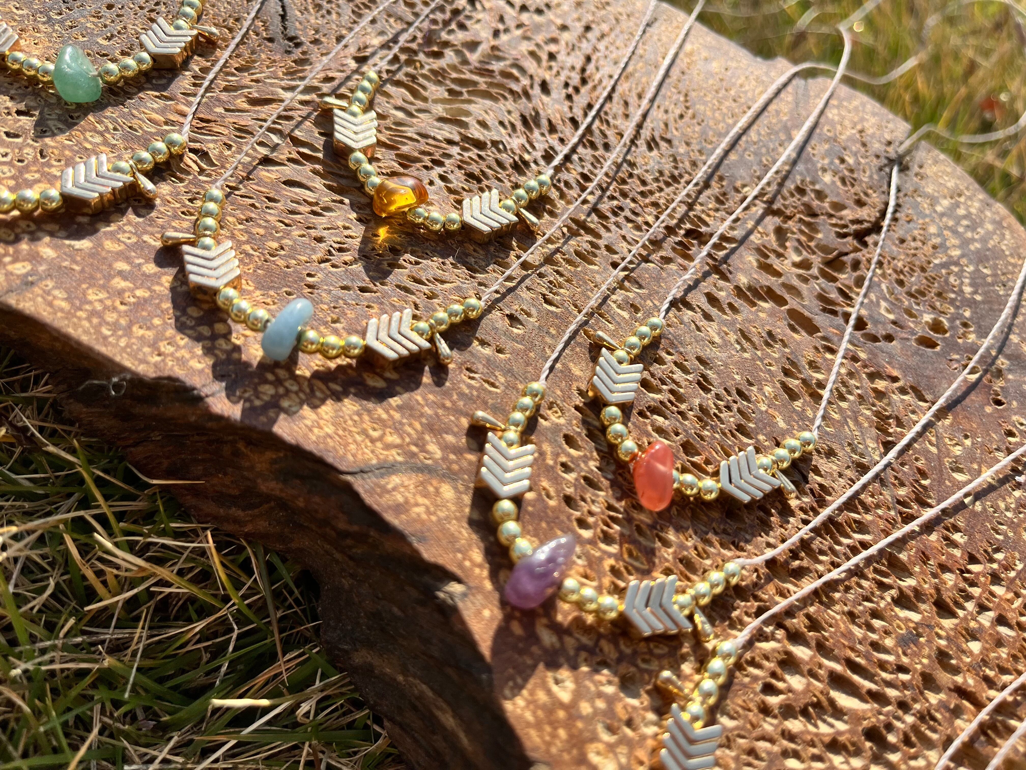 手作業で丁寧に作られたこのネックレスは、天然素材の特性を活かしたデザインが特徴です。