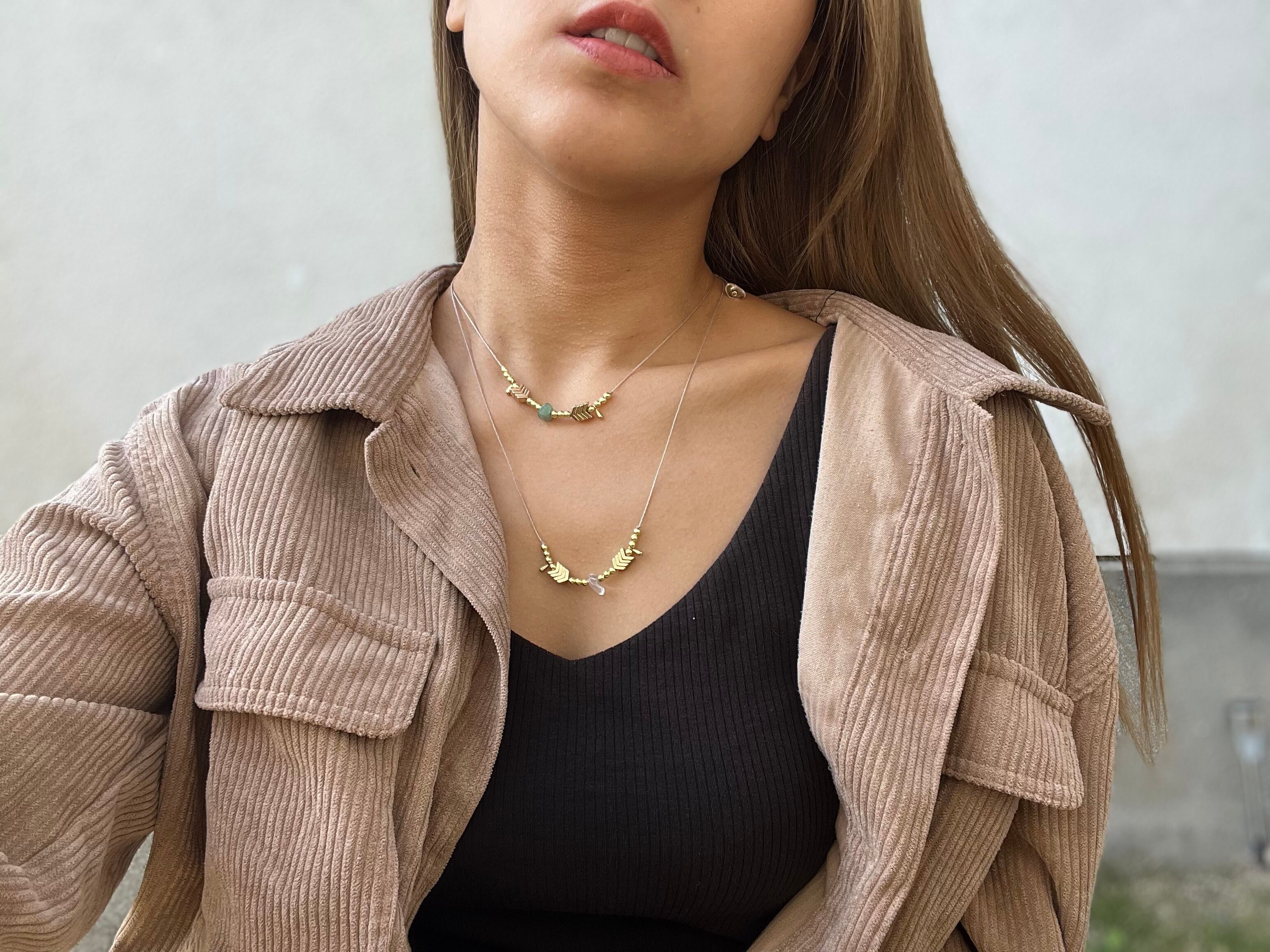 手作業で丁寧に作られたこのネックレスは、天然素材の特性を生かしたデザインが特徴です。