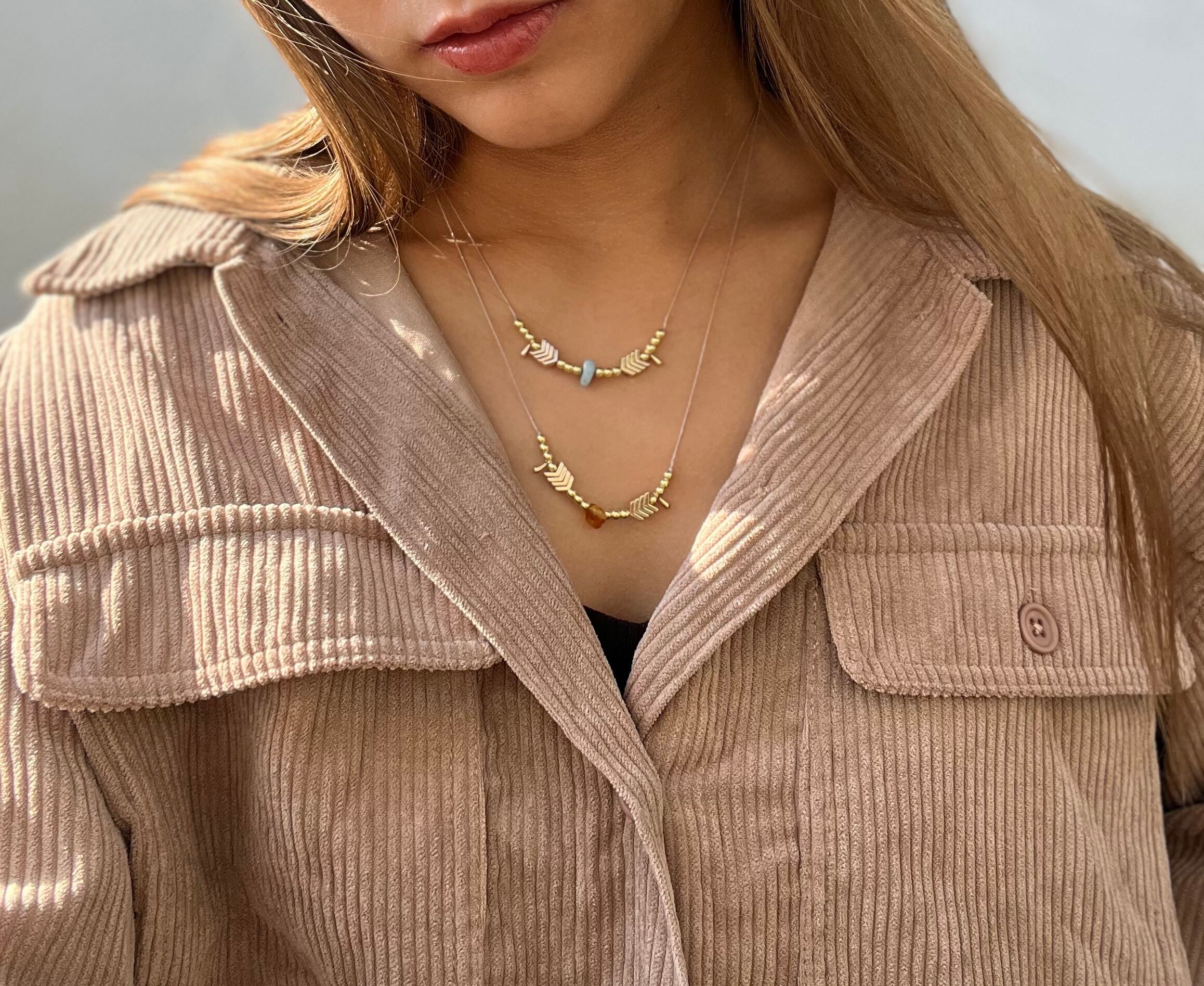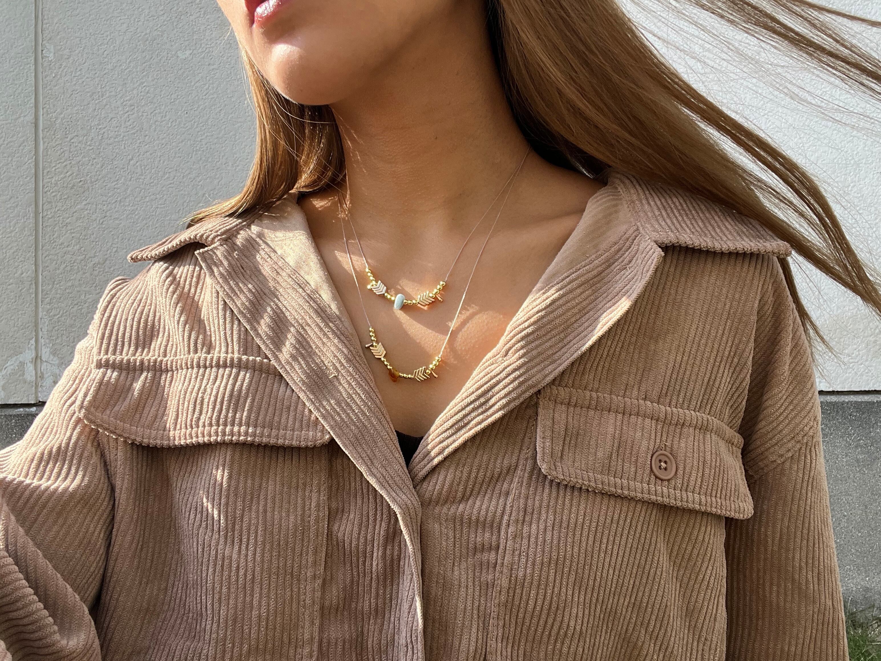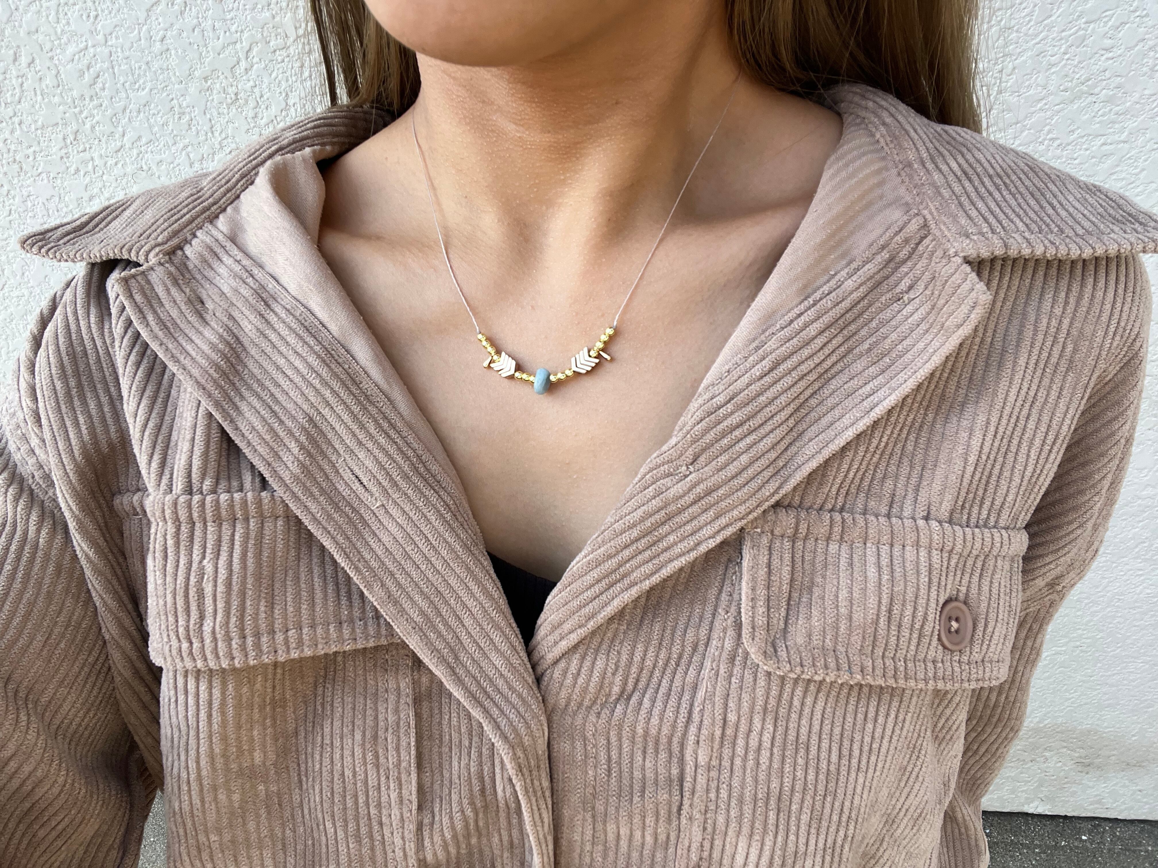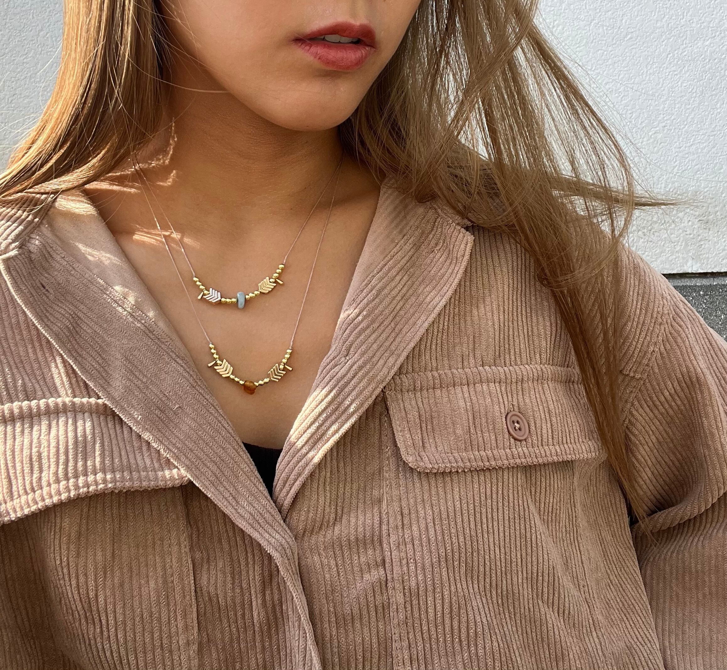 手作業で丁寧に作られたこのネックレスは、天然素材の特性を生かしたデザインが特徴です。