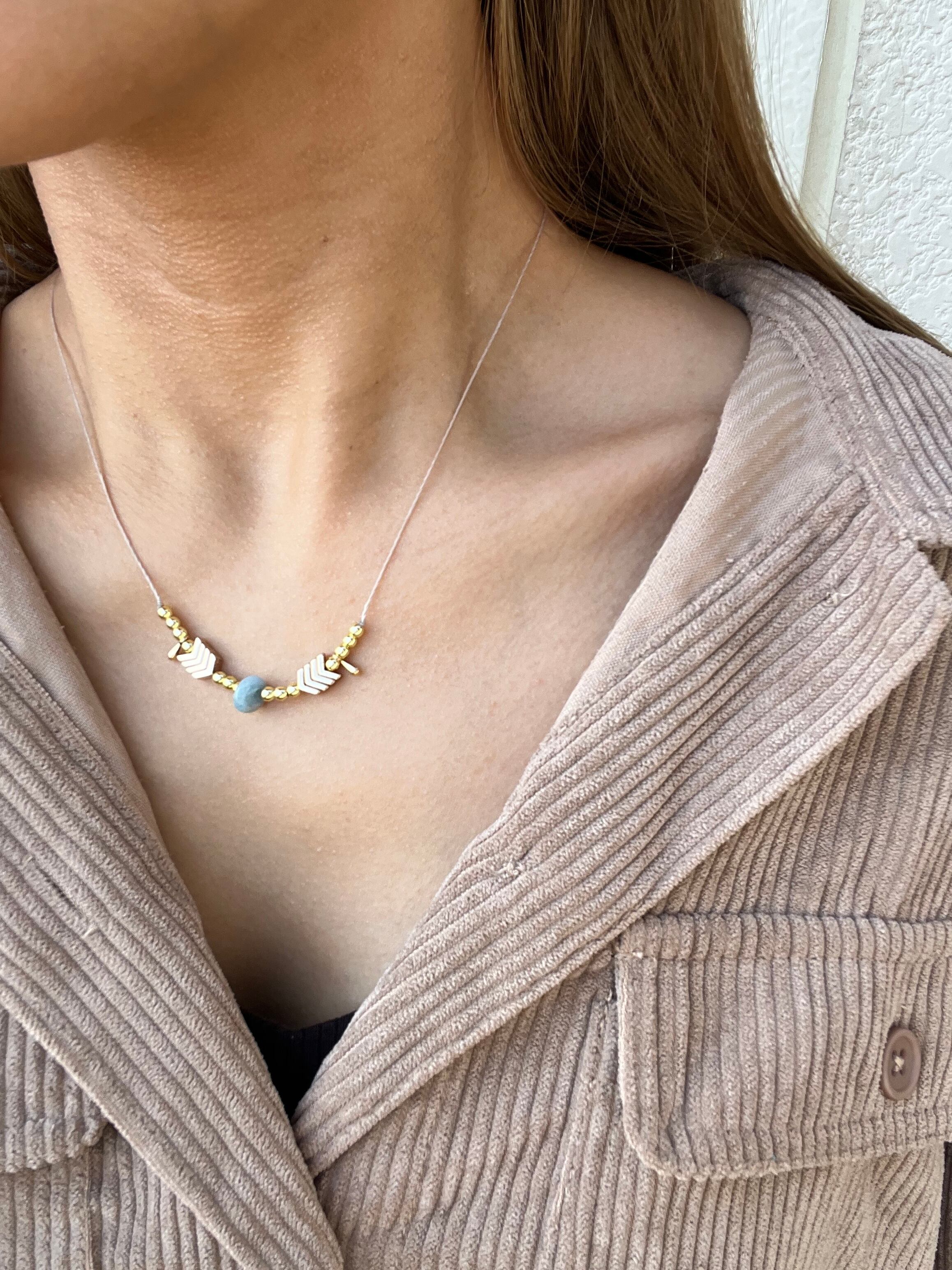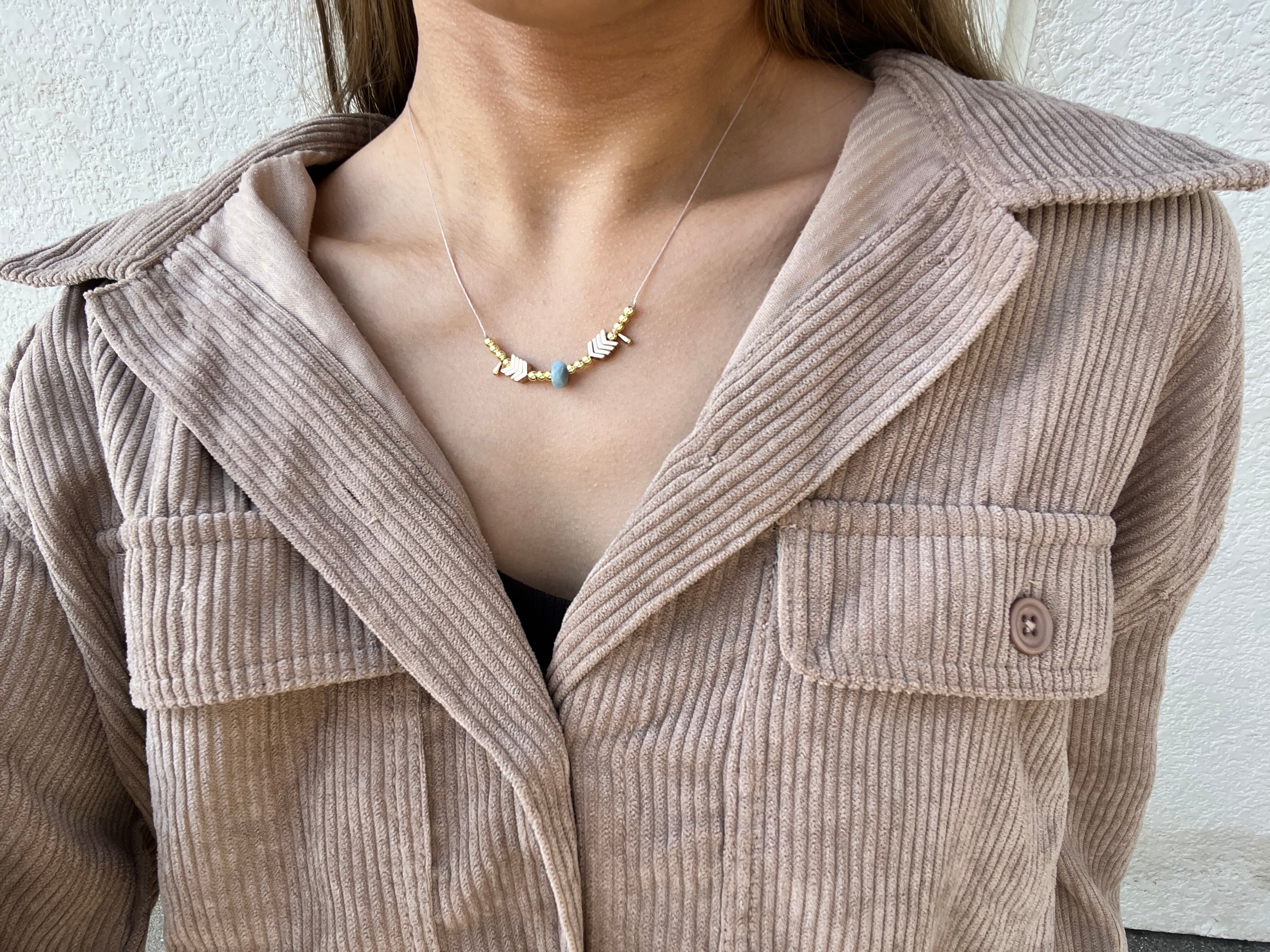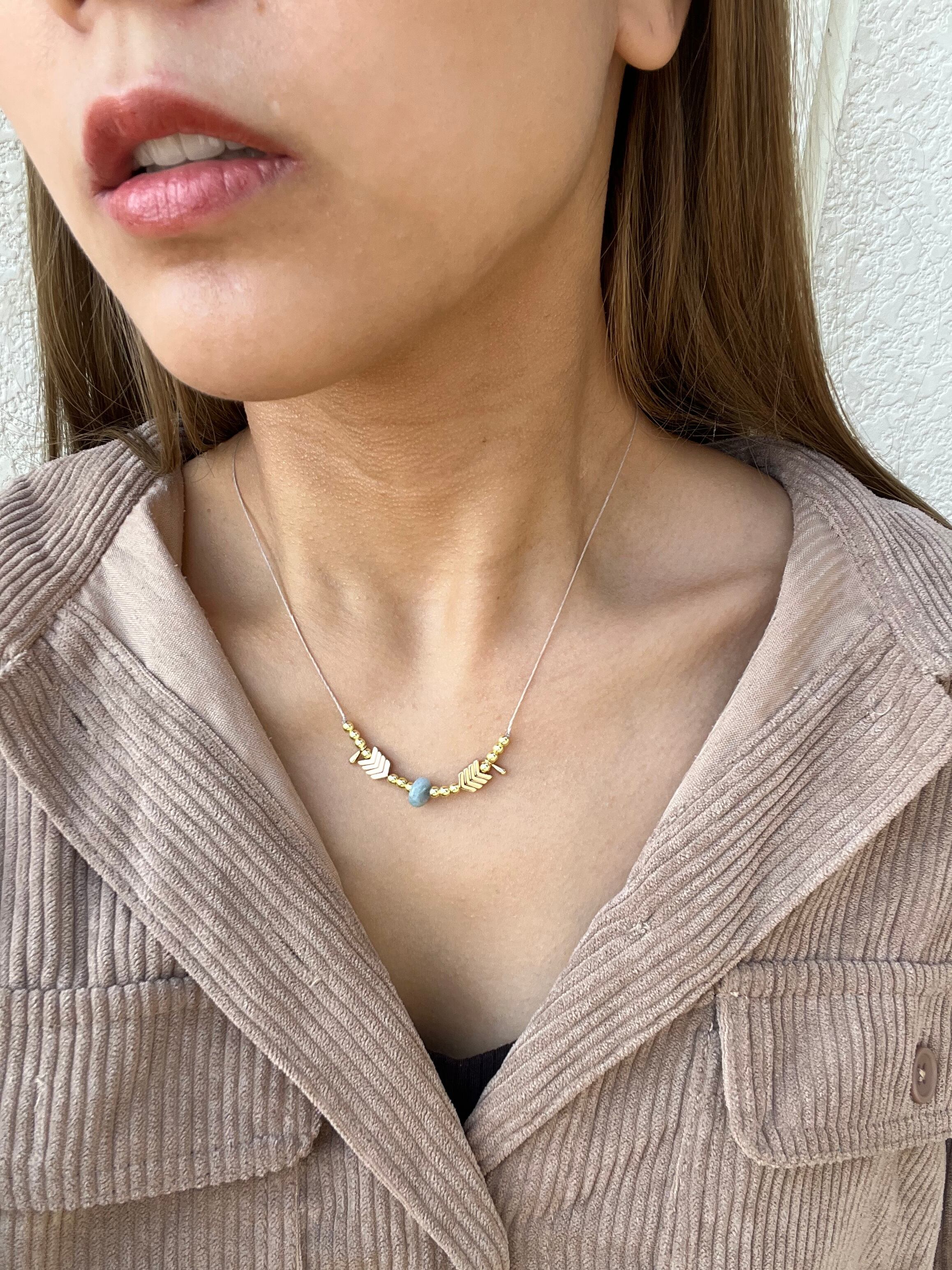アクアマリンの優しいブルーとヘマタイトの深い色合いが絶妙に調和し、あなたのスタイルに洗練された印象を与えます。このネックレスを身に着けることで、特別な瞬間から日常のコーディネートまで、幅広く活躍することでしょう。