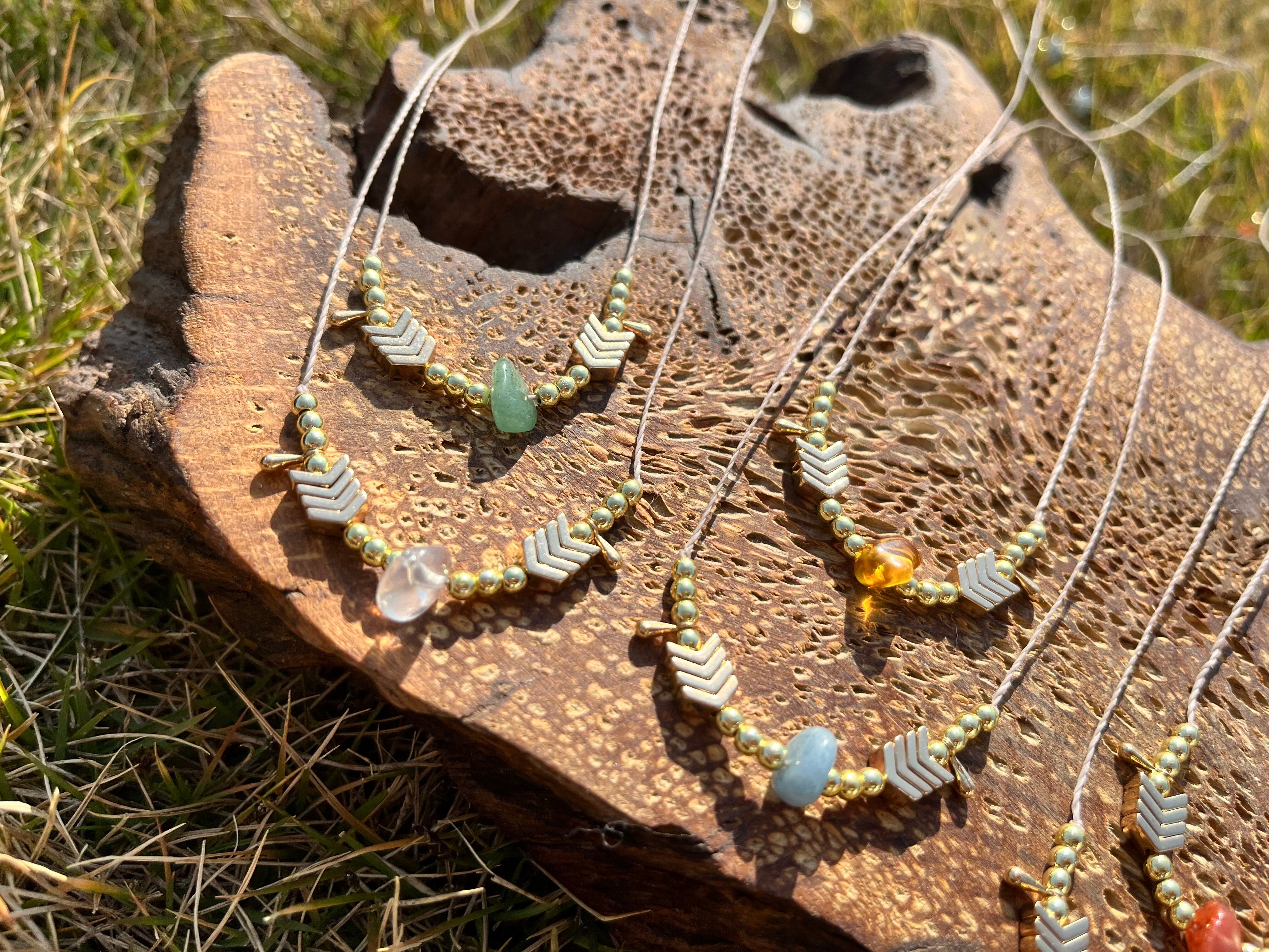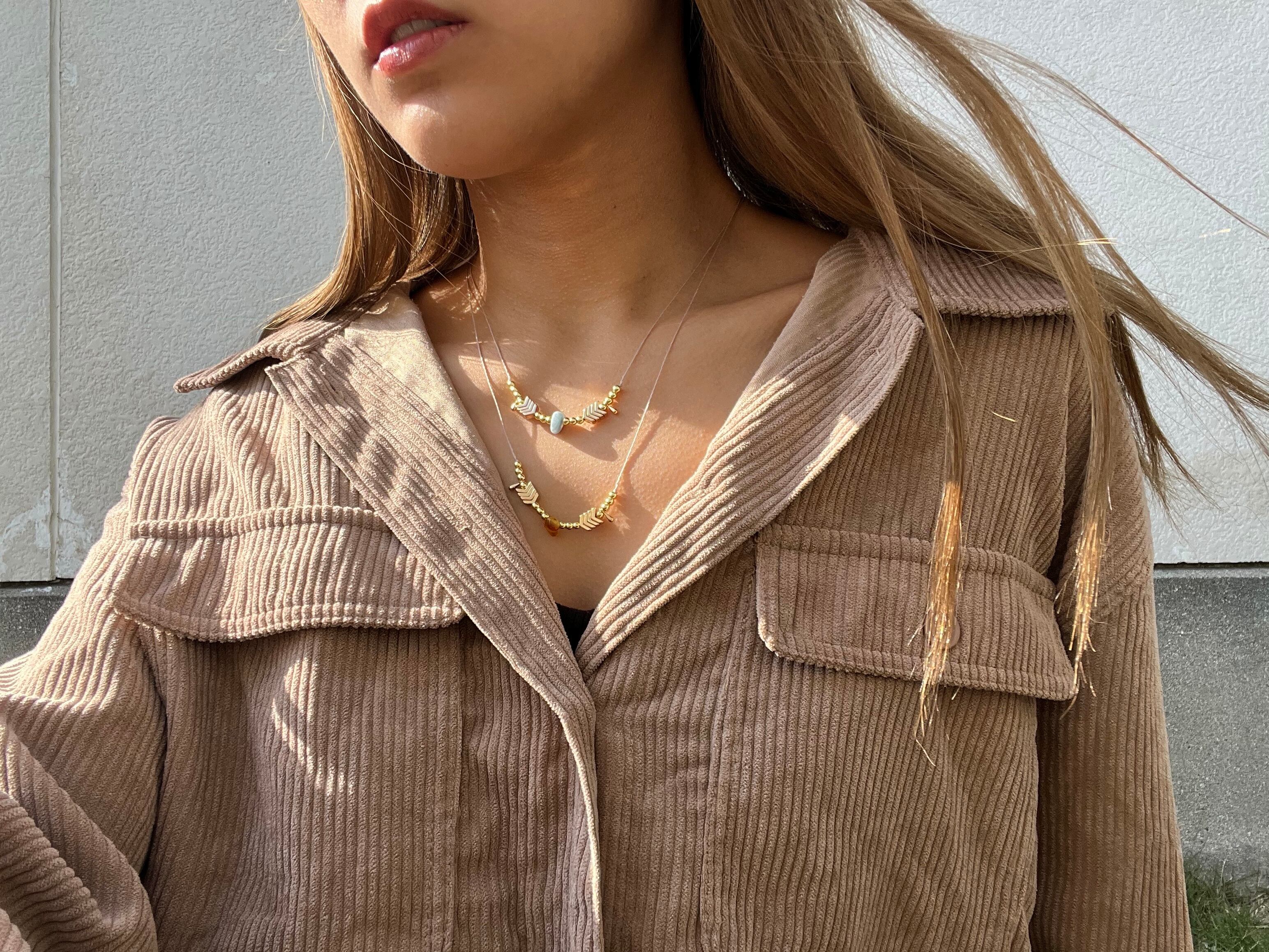 手作業で丁寧に作られたこのネックレスは、天然素材の特性を活かしたデザインが特徴です。