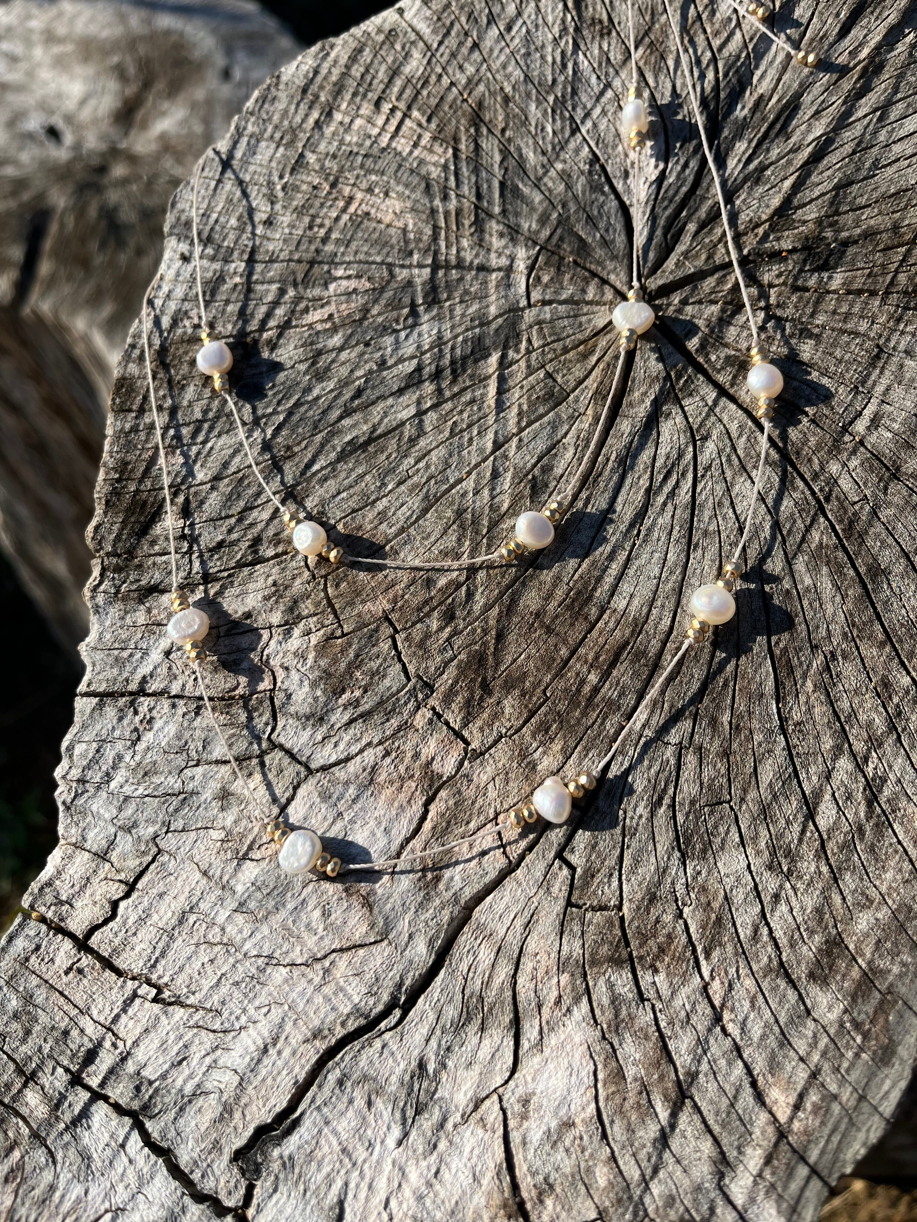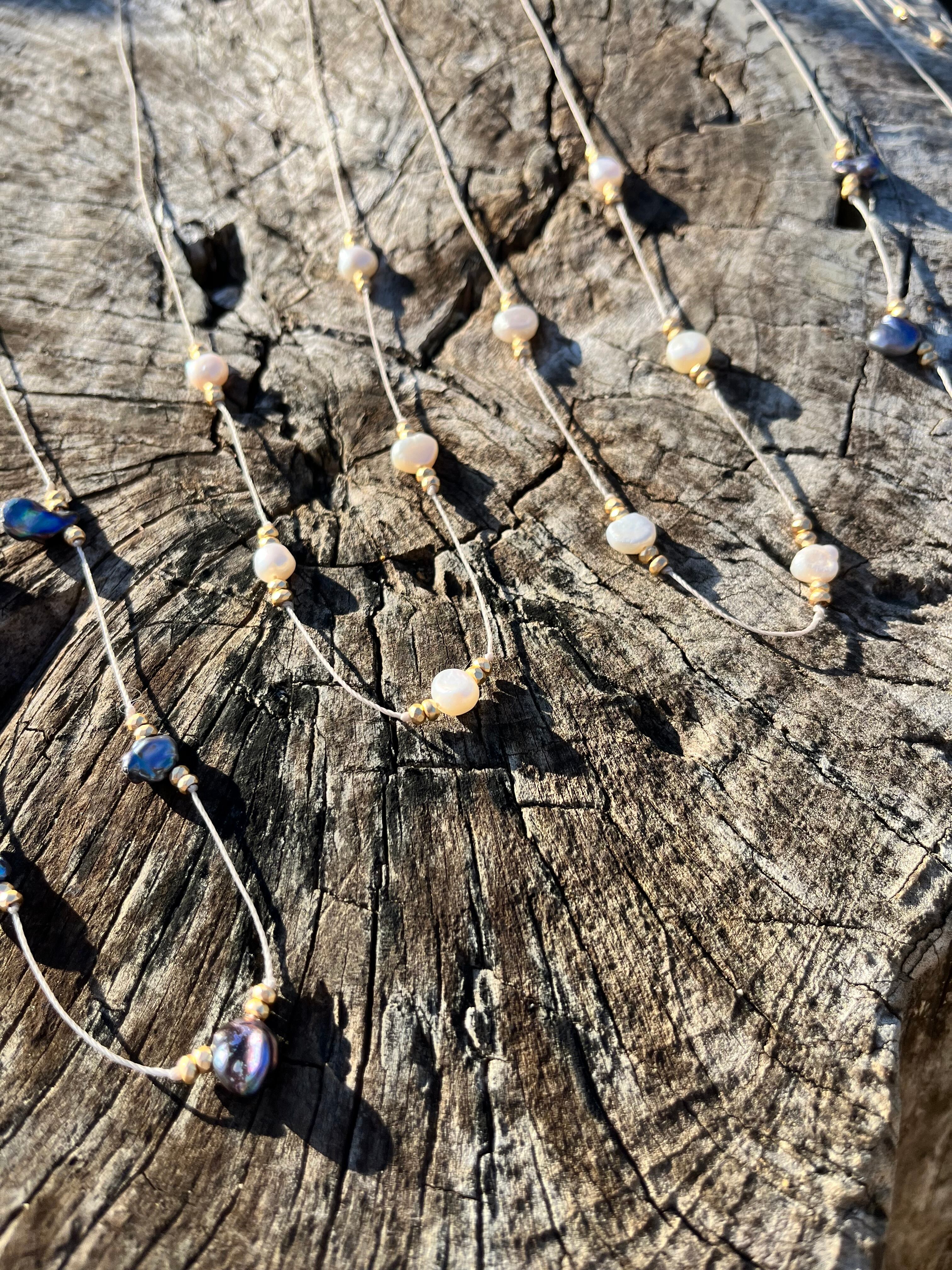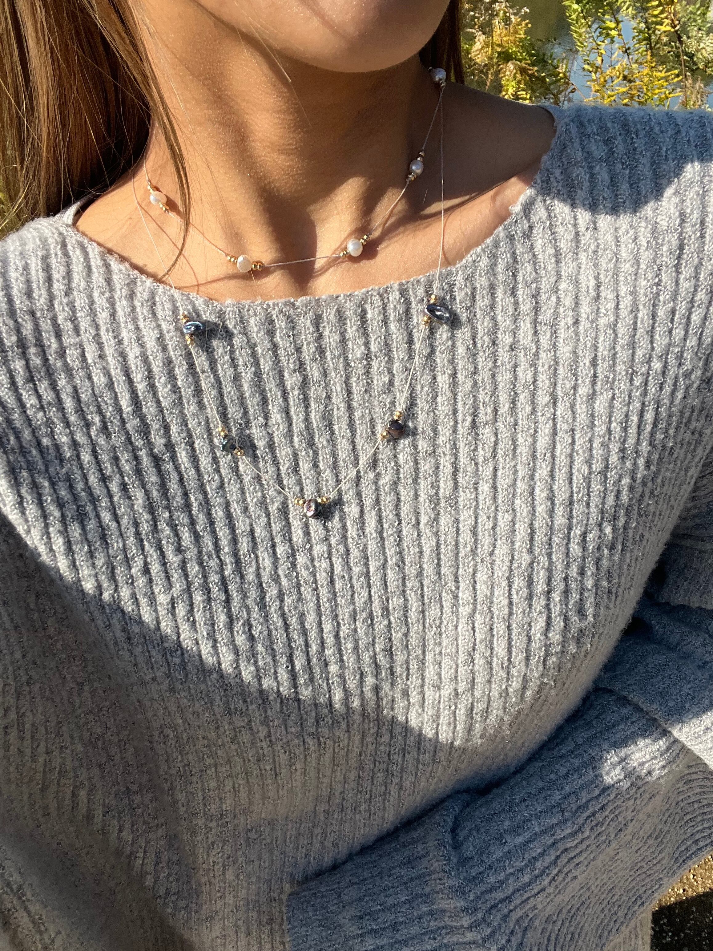 "このネックレスは、上品な淡水パールとヘマタイトが絶妙に組み合わさった特別なアクセサリーです。