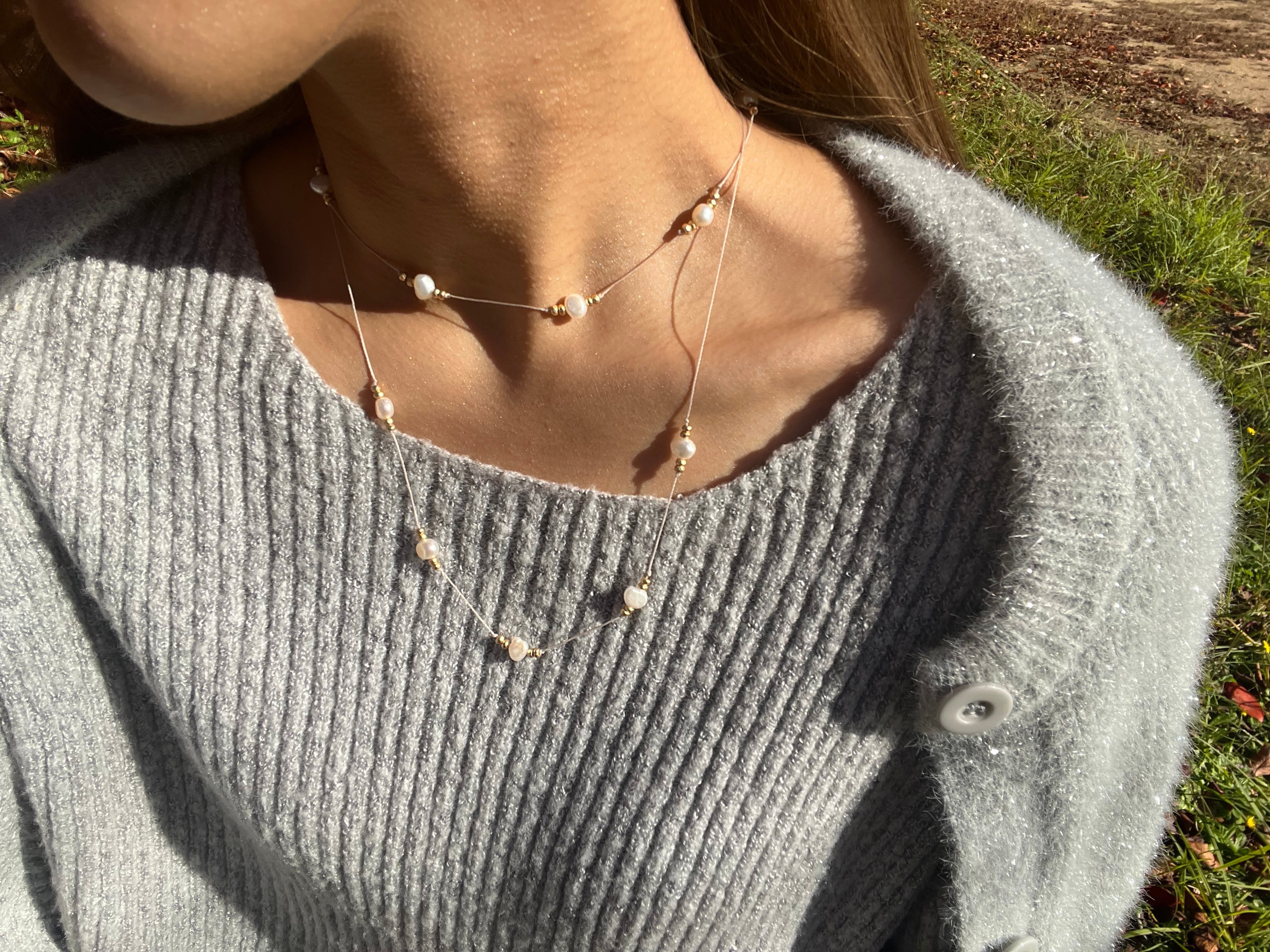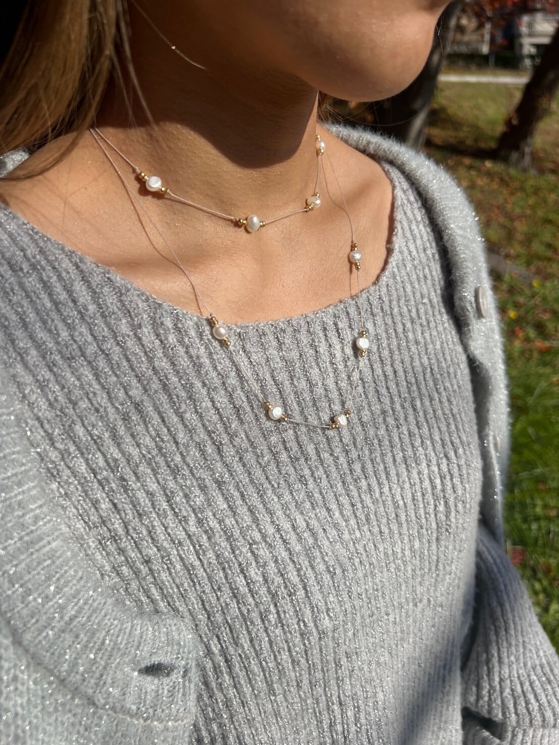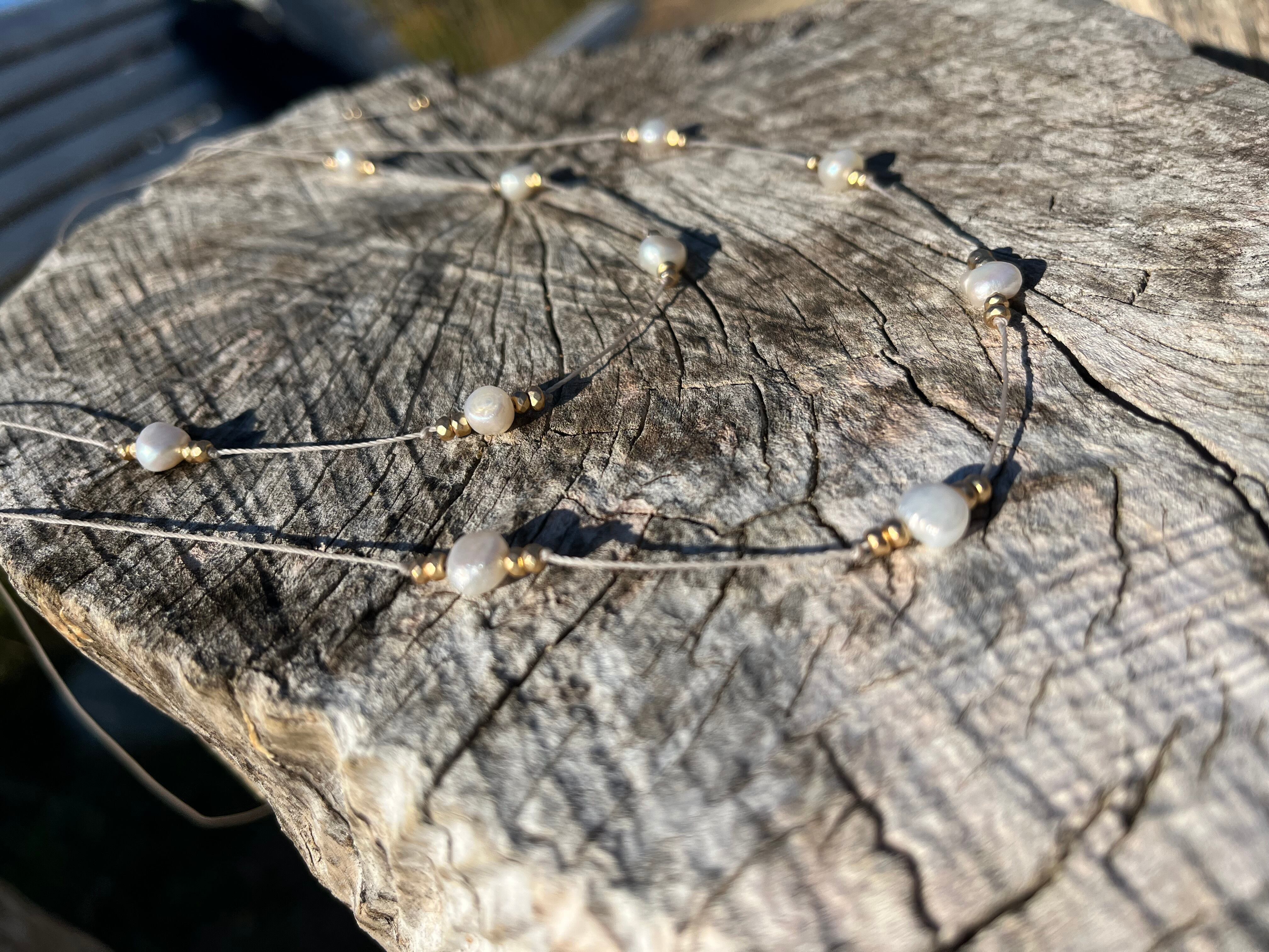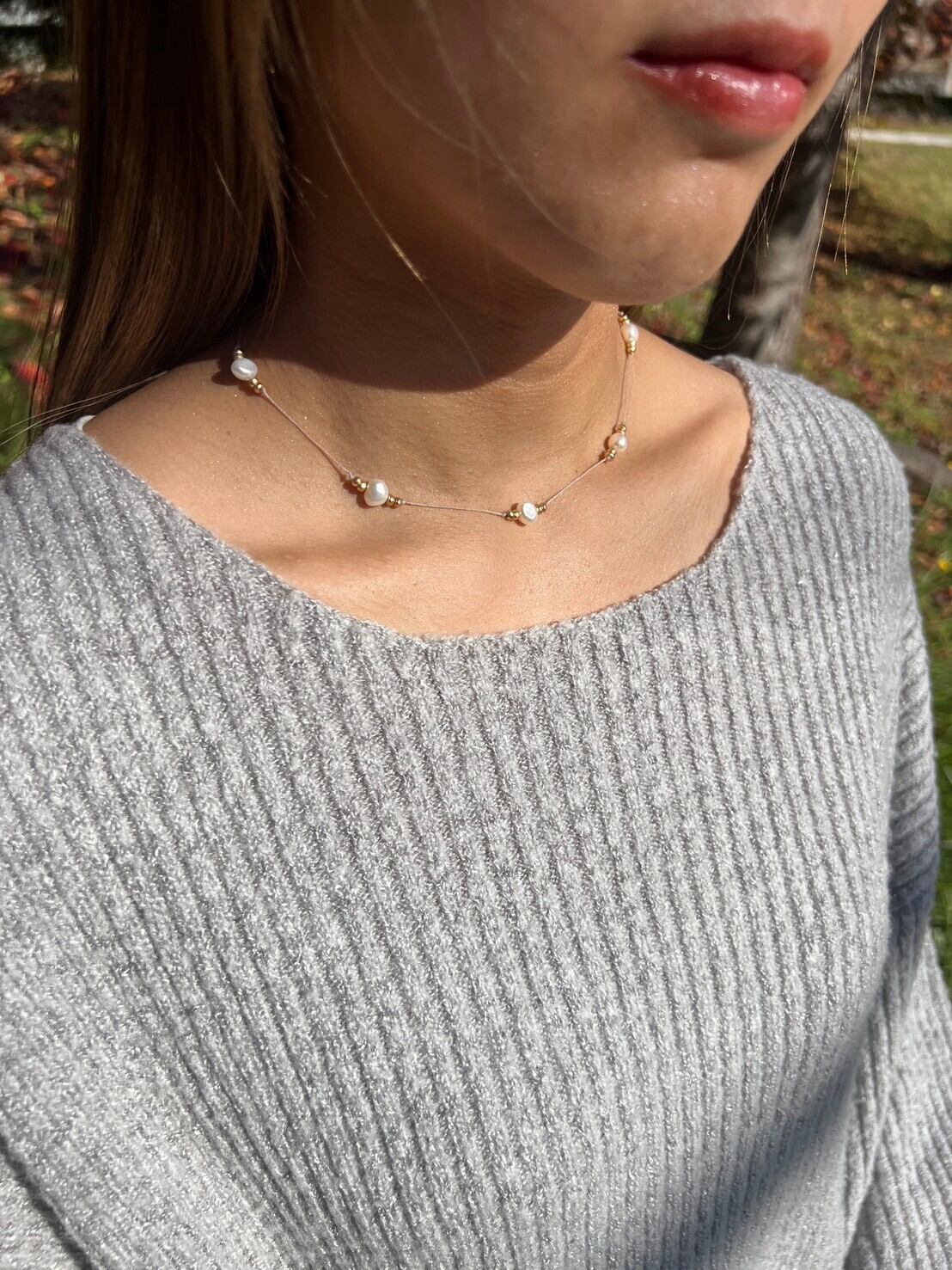 "このネックレスは、上品な淡水パールとヘマタイトが絶妙に組み合わさった特別なアクセサリーです。