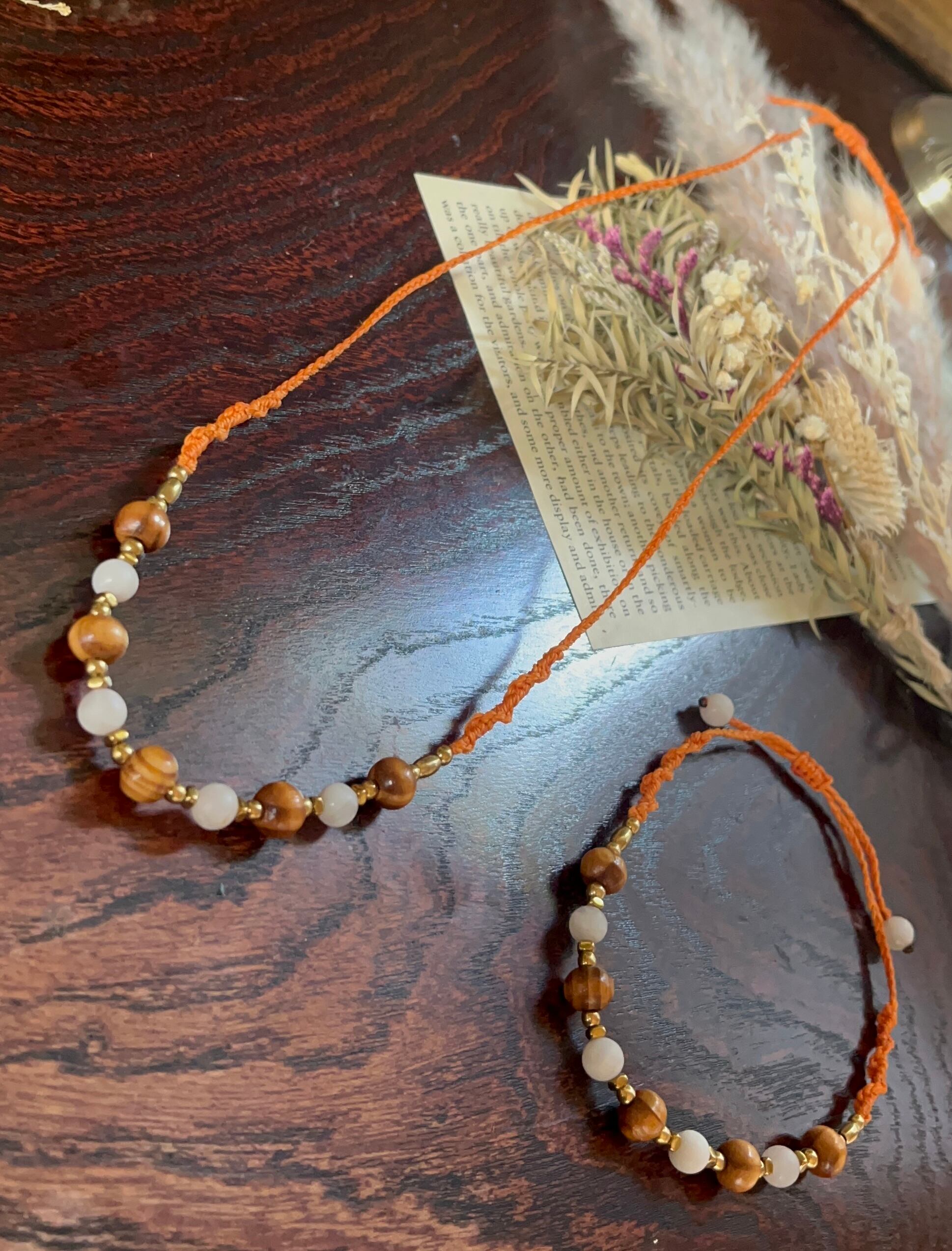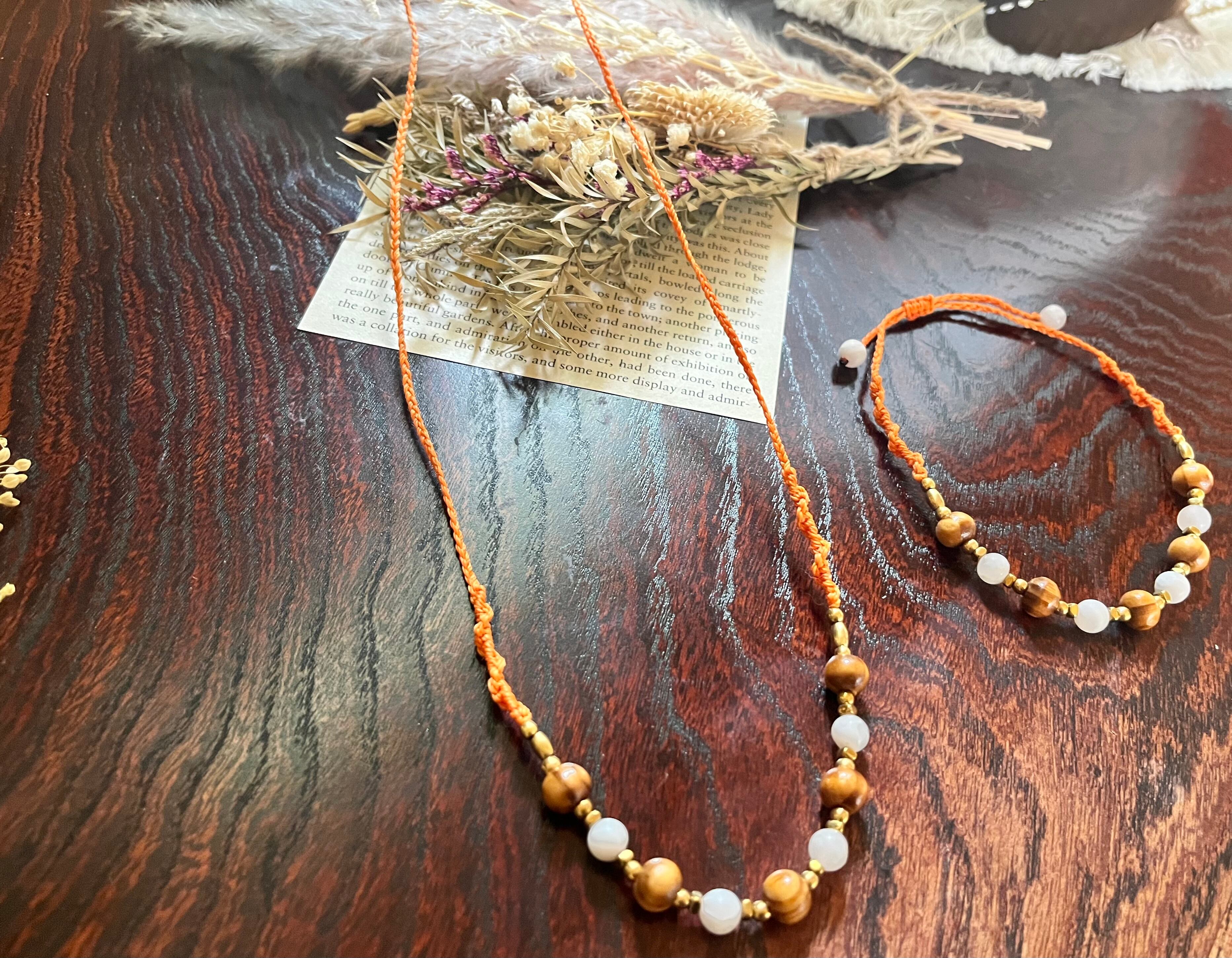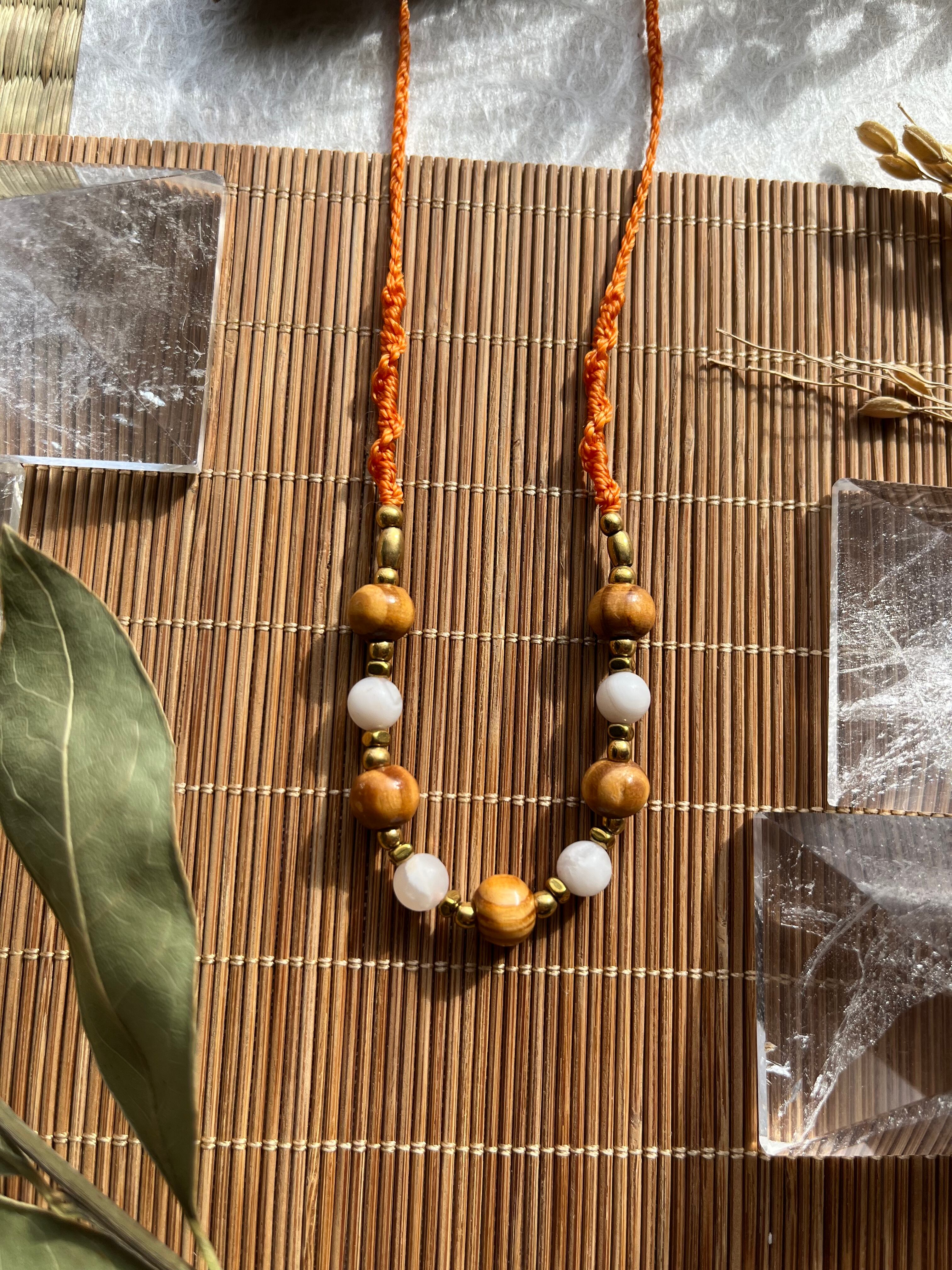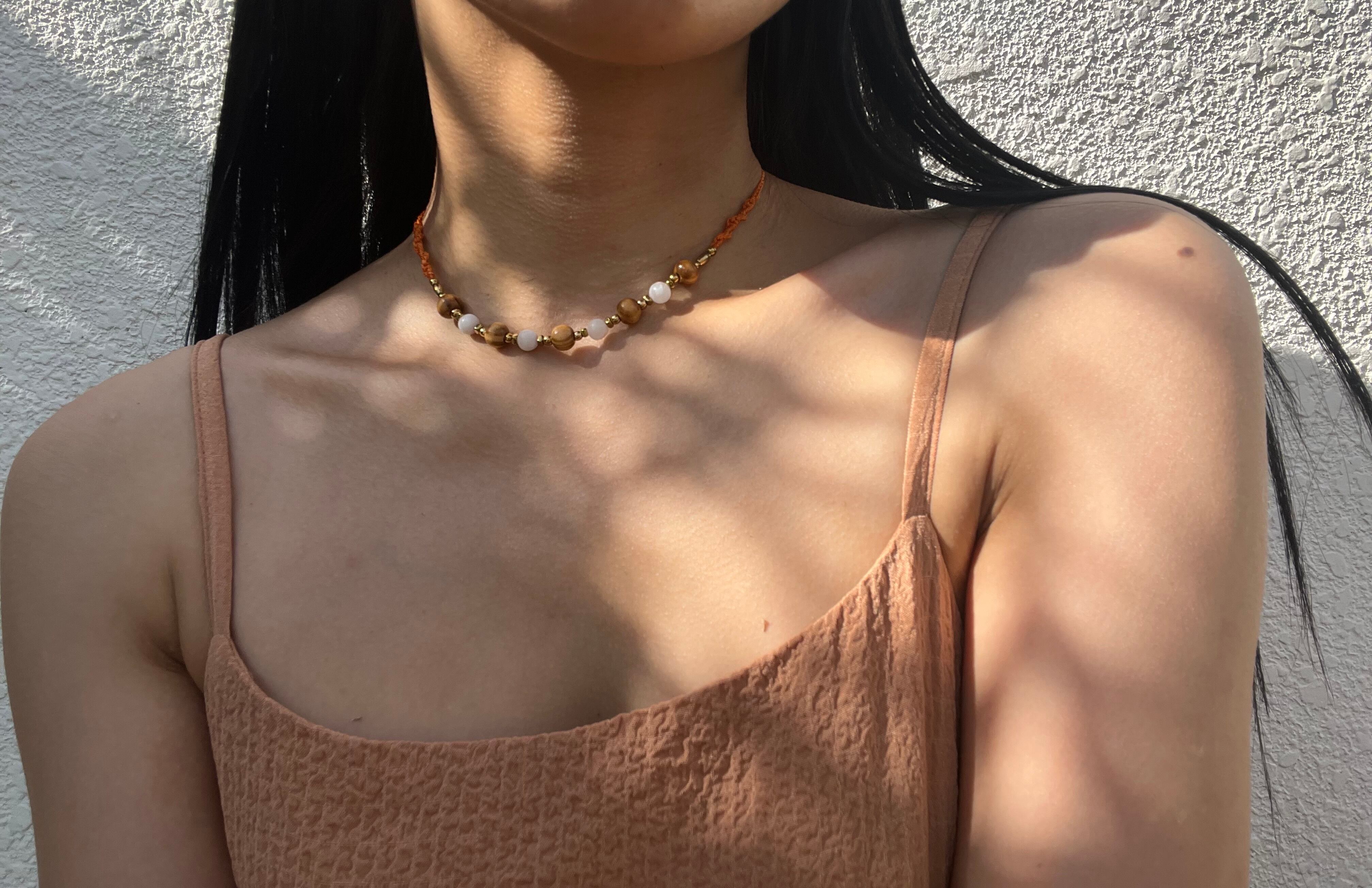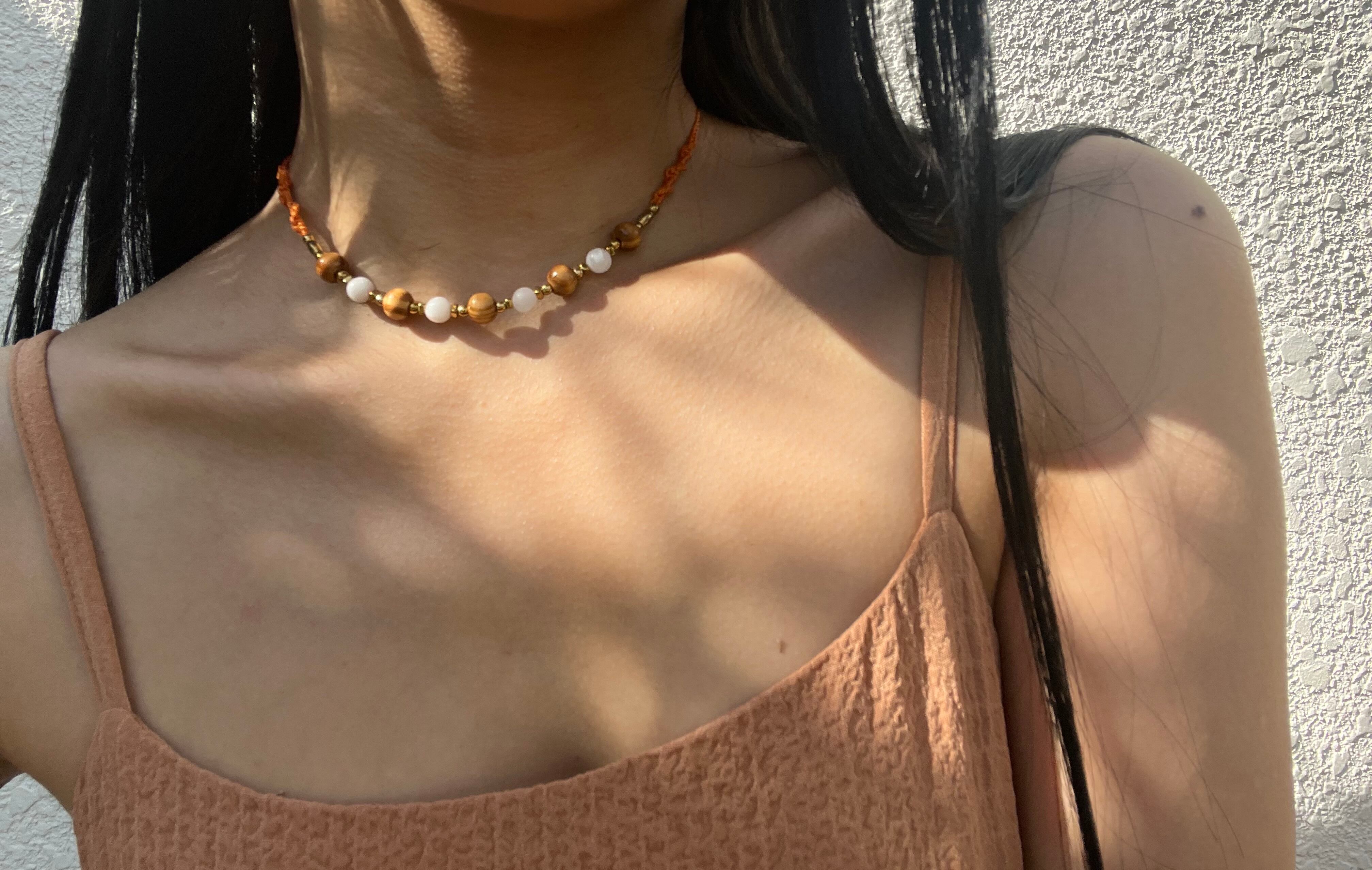 手作業で丁寧に作られたこのネックレスは、天然素材の特性を生かしたデザインが特徴です。